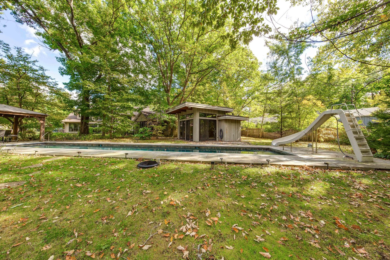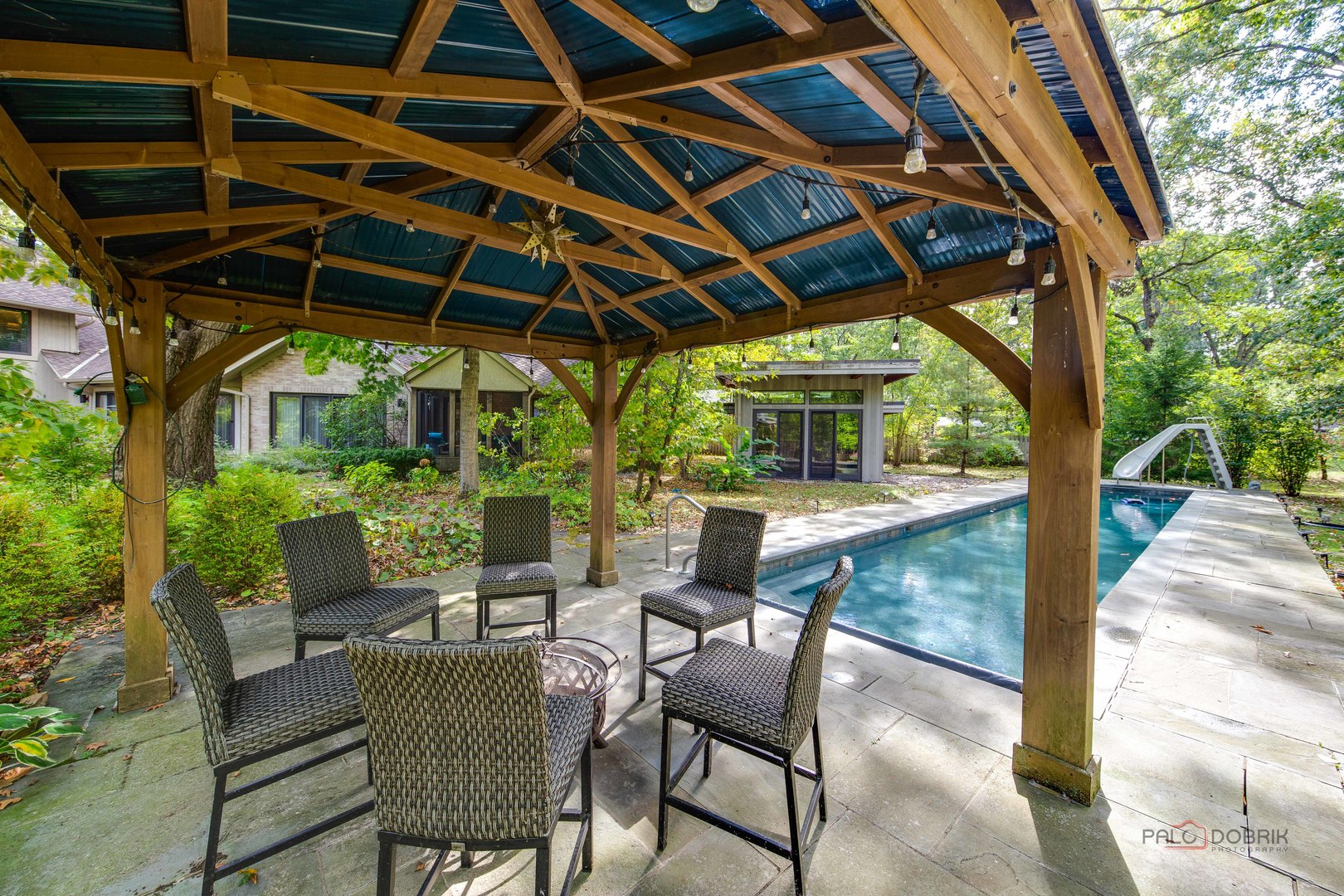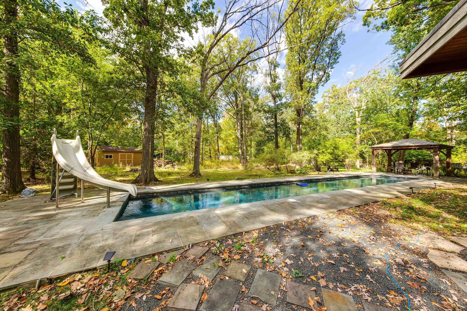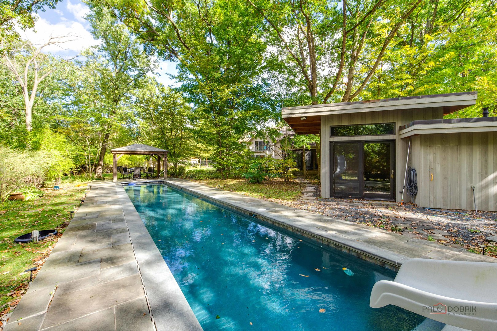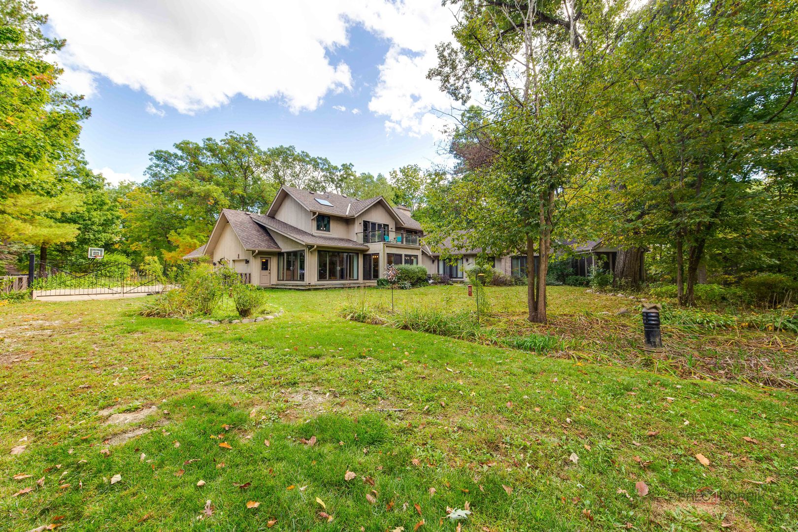 Unbelievable Dream Home in Riverwoods! NEW 2024 roof, skylights, and gutters. Tucked away on nearly 2 wooded acres, this private oasis offers the perfect blend of luxury, comfort, and resort-style living. The beautifully landscaped backyard features a heated in-ground pool with slide, newer equipment including heater and automatic pool cover, and a spectacular pool house-complete with a lounge area, wet bar, and full bath, making outdoor entertaining effortless. Inside, the home is equally impressive. This stunning 5-bedroom, 6-bath residence boasts soaring ceilings, gleaming hardwood floors, skylights, and floor-to-ceiling windows that flood the space with natural light. A grand two-story entry sets the tone, leading into the expansive living room with a dramatic floor-to-ceiling multi-sided stone fireplace, shared with the cozy family room. The formal dining room offers the perfect setting for gatherings, with direct access to the patio for seamless indoor/outdoor entertaining. At the heart of the home is the gourmet kitchen, featuring a large island with breakfast bar, granite countertops, stainless steel appliances that have all been replaced since 2021, and abundant cabinetry. The main level primary suite is a showstopper-your personal retreat with vaulted ceilings, two spacious walk-in closets, access to a serene screened-in porch, and a spa-like ensuite with dual vanities, whirlpool tub, and separate steam shower. An elegant office with French doors and a second main-level bedroom with shared ensuite add to the flexible floor plan. Upstairs, discover a second optional primary suite with vaulted ceilings, private ensuite, walk-in closet, and a private balcony overlooking the breathtaking grounds. Two additional bedrooms and a full bath complete the upper level. The finished basement offers endless possibilities with a large recreation room, full bath, exercise room, and laundry area. Additional highlights include a circular driveway with heated garage, newer fenced-in backyard, two sheds, and proximity to the Edward L. Ryerson Conservation Area-a large nature preserve offering hiking, snowshoeing, wildlife viewing, and a charming farm area. Easy access to highways, yet tucked away in peaceful privacy. This one-of-a-kind property truly has it all-space, luxury, and the perfect setting to make lifelong memories.