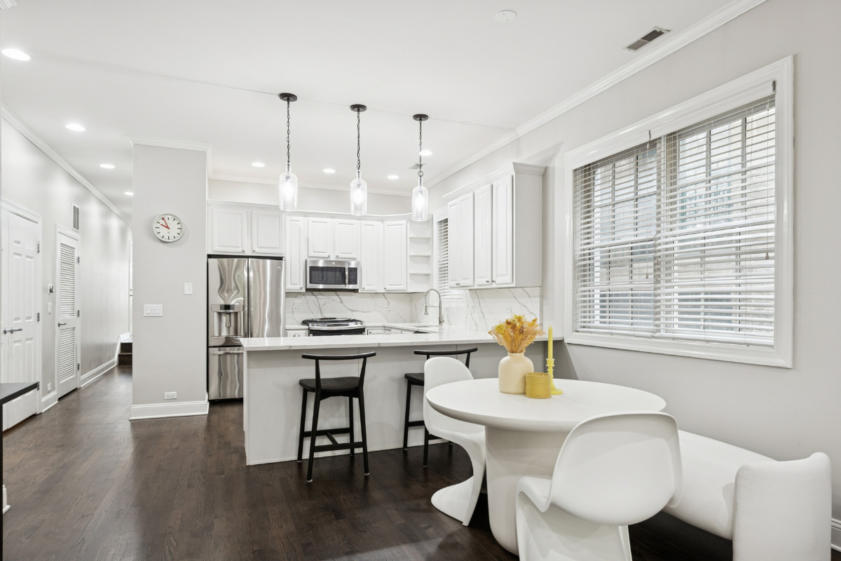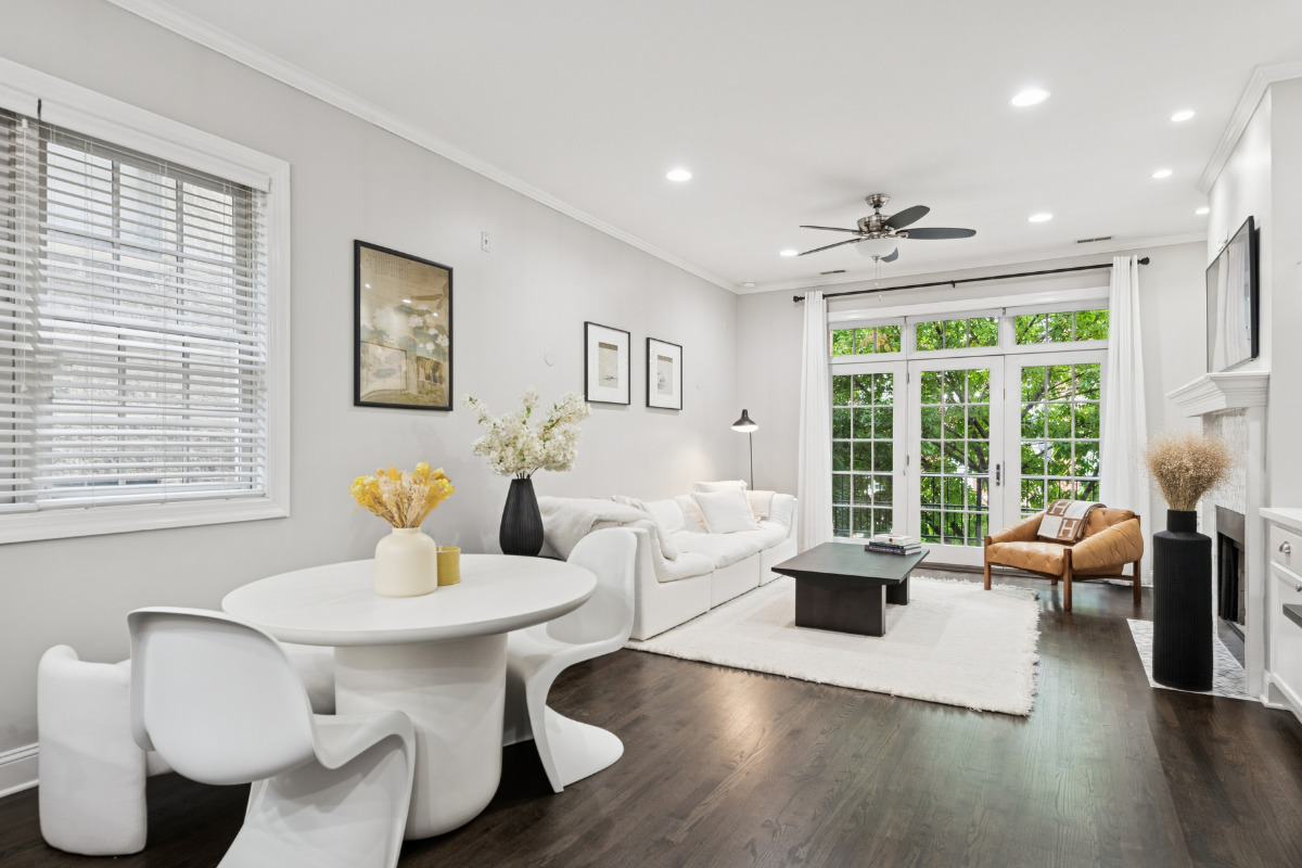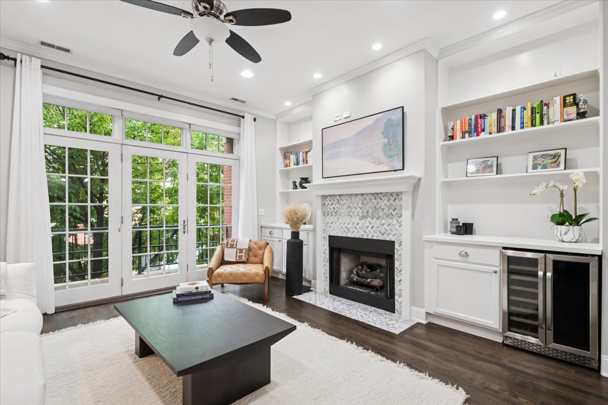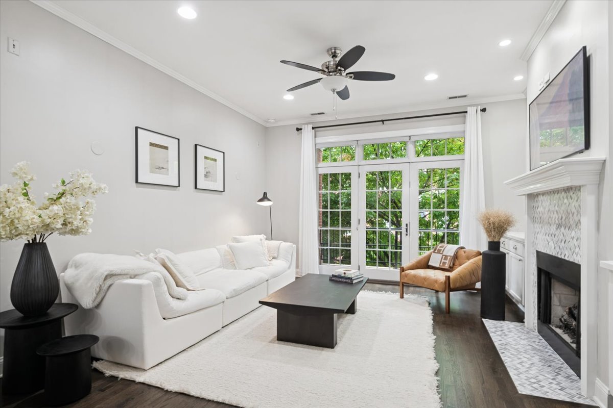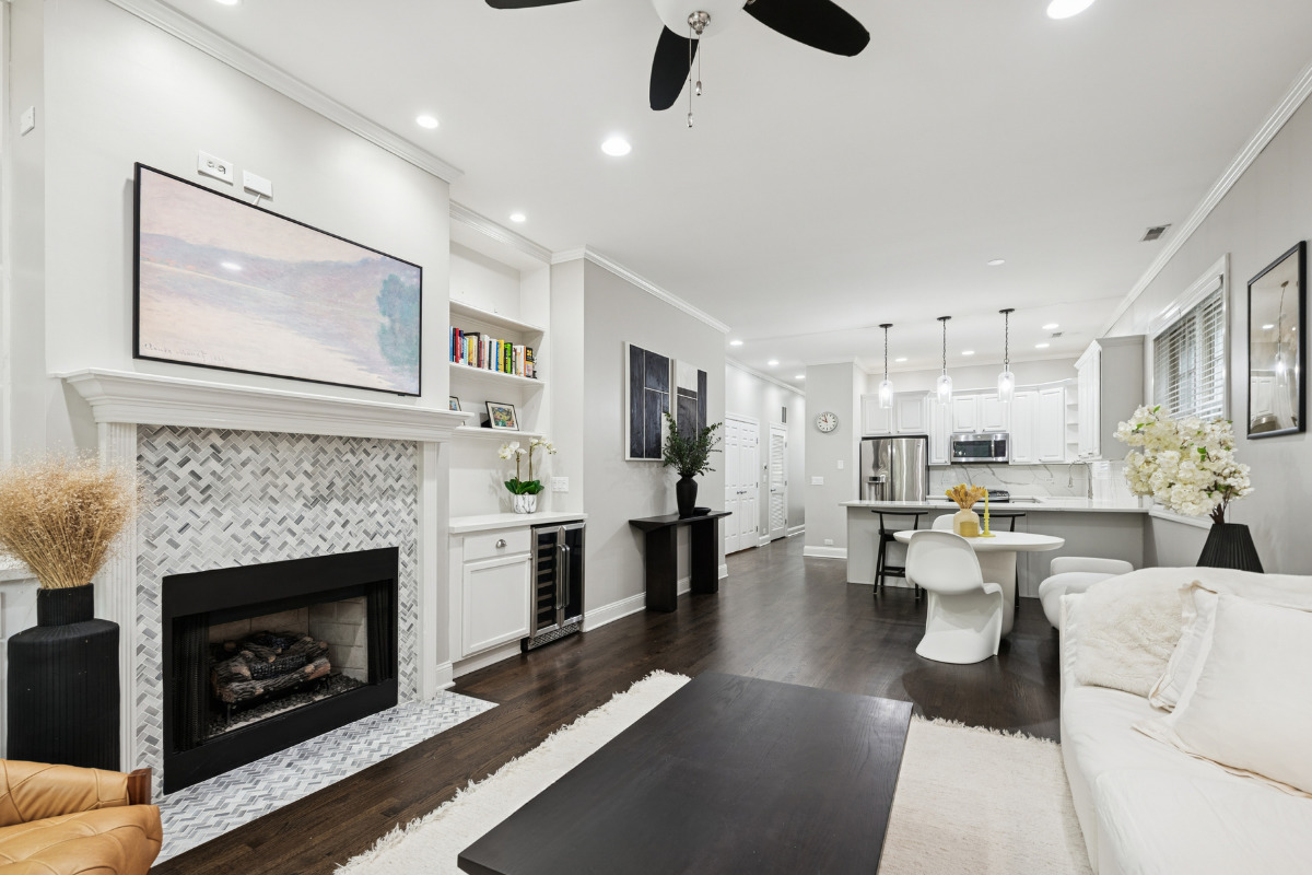 Welcome to this sun-filled 2-bedroom, 2-bathroom Bucktown condo in a boutique elevator building that offers modern finishes and everyday conveniences. The open living and dining area features soaring 10-foot ceilings, oak hardwood floors, custom built-ins, a Carrara marble tiled gas fireplace, and a new wine fridge. Large windows and a front balcony overlook the tree-lined street, creating a quiet retreat in the heart of Damen Avenue. The kitchen is both stylish and functional, with crisp white cabinetry, quartz countertops and backsplash, ample storage, and stainless-steel appliances. The spacious primary suite offers a full wall of closets, motorized blackout shades, and a luxurious en-suite bath with marble countertops, dual sinks, a soaking tub, and a separate shower. A large second bedroom and a generous guest bath make the home as practical as it is inviting. Additional highlights include in-unit laundry with a side-by-side washer and dryer, an attached garage parking space, central heating and cooling, and extra storage in the building. The 606, Churchill Park, neighborhood restaurants, boutique shopping, cafes, and vibrant nightlife are all nearby. Public transit options include the Damen Blue Line, Armitage and Damen buses, and the Clybourn Metra station. This condo is the perfect blend of style, function, and location, ready for you to move in and enjoy.