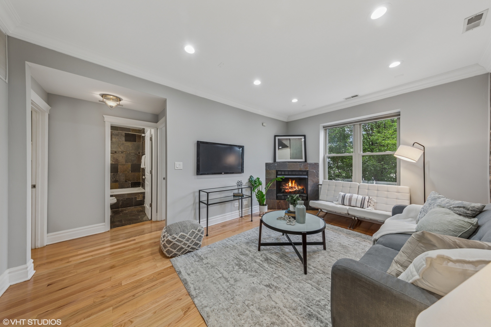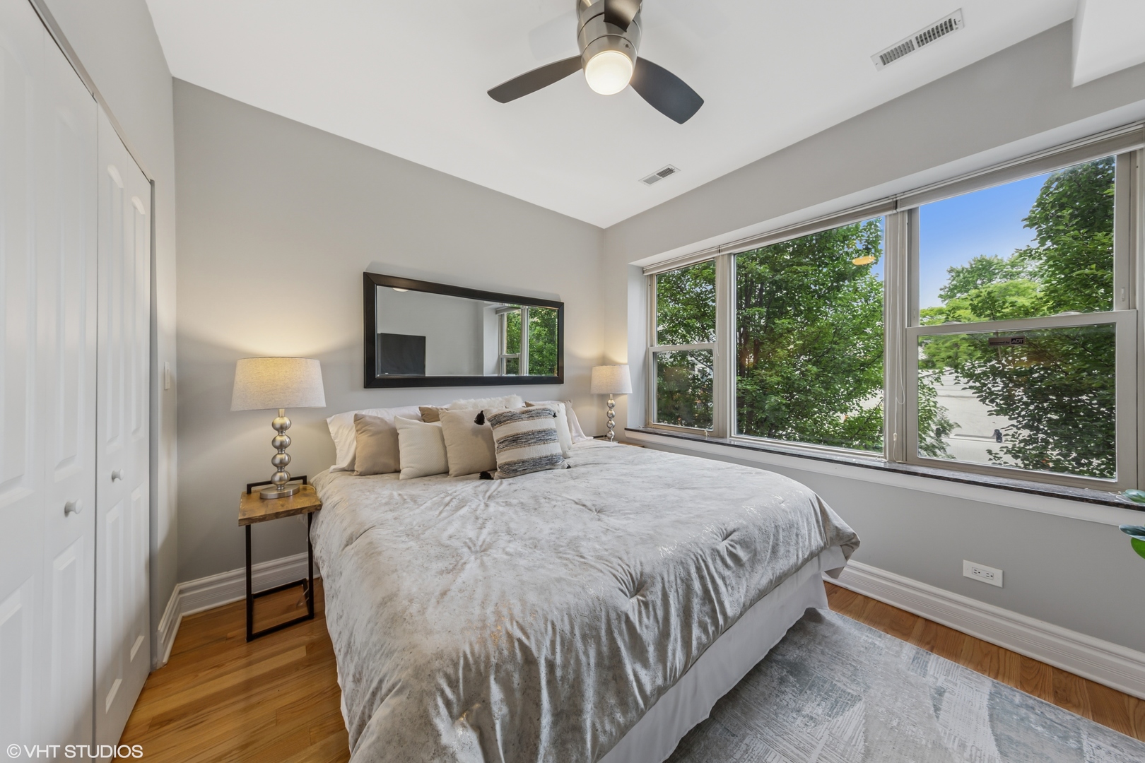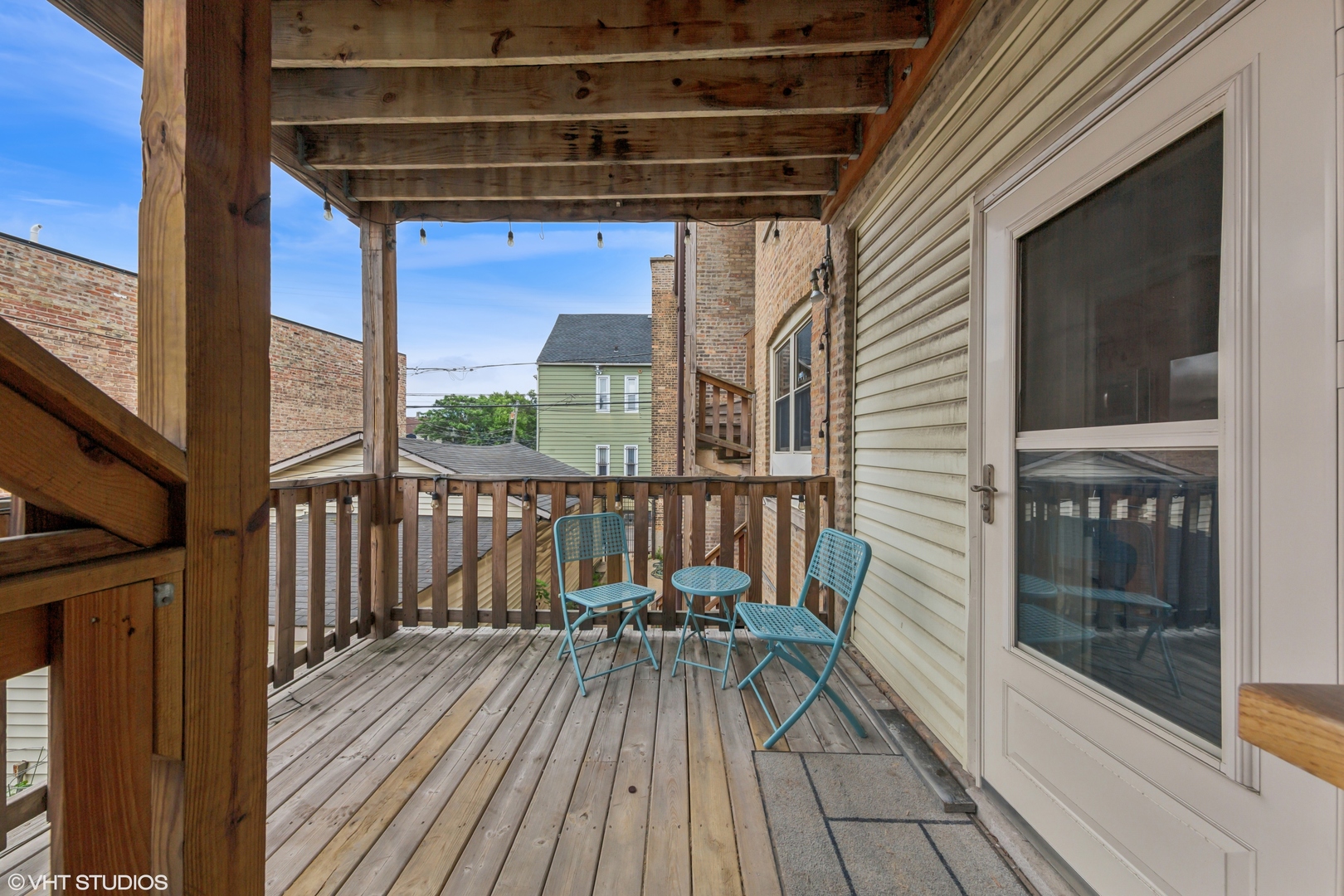 Stunning newer completely updated 2nd floor Two Bedroom/ One Bath Condo Near the 606 Trail. Super bright unit features many large Windows and gleaming refinished oak hardwood floors throughout the living room as well as both bedrooms. Elegant gas fireplace in the cozy living room with recessed lights, exposed brick wall and plenty of natural light. Gorgeous kitchen with granite countertops, contemporary 42″ cabinets and newer stainless-steel appliances. Large spa-like bathroom with modern finishes. Stylish primary bedroom features large picture window and ample closet spaces. Second spacious bedroom could be used as guest bedroom or an Office. Large deck is perfect for entertaining with friends and family or sipping coffee in the morning. This gorgeous unit was just professionally painted throughout. Easy permit street parking zoned for the building. Great Logan Square neighborhood with lots of trendy restaurants, grocery stores, Mozart park, pickleball, 606 Trail and tons more. Metra train and CTA bus is right outside the entrance door. Professionally managed and agent owned. ***Taxes DO NOT reflect homeowners exemption. ***