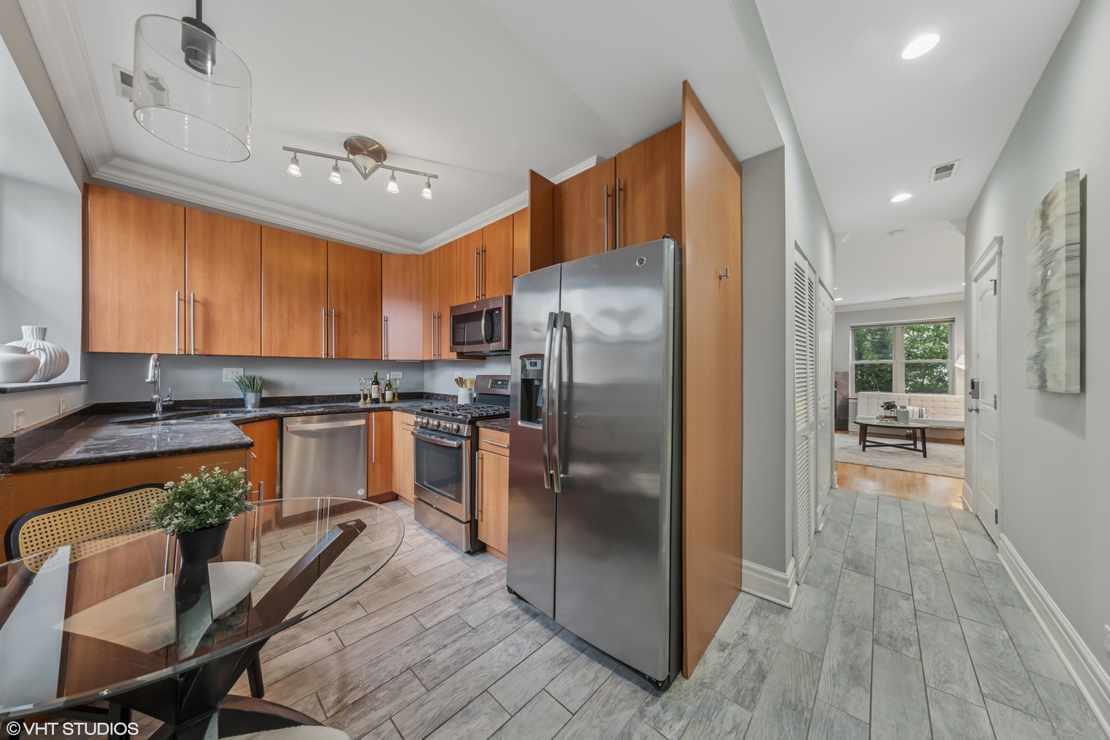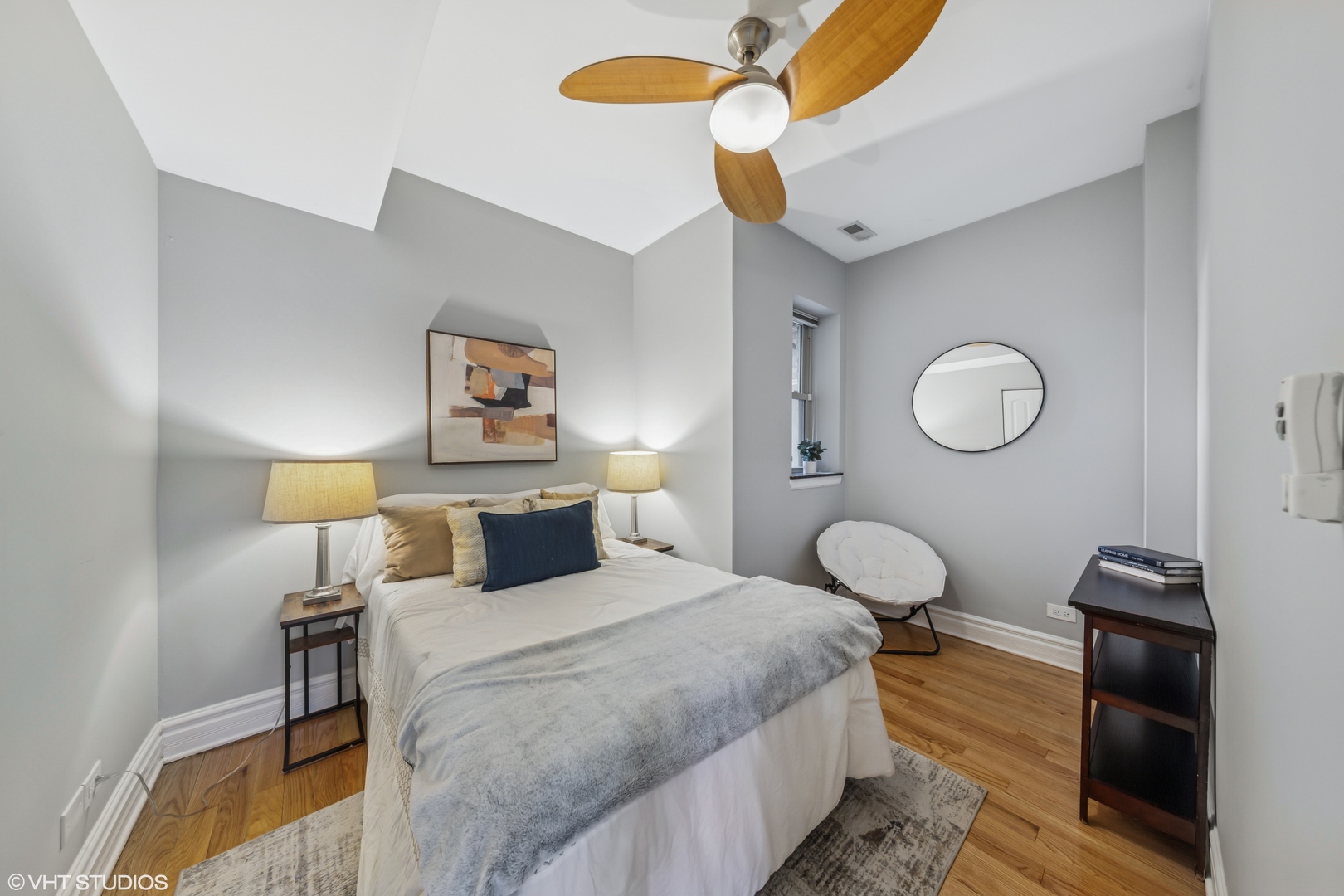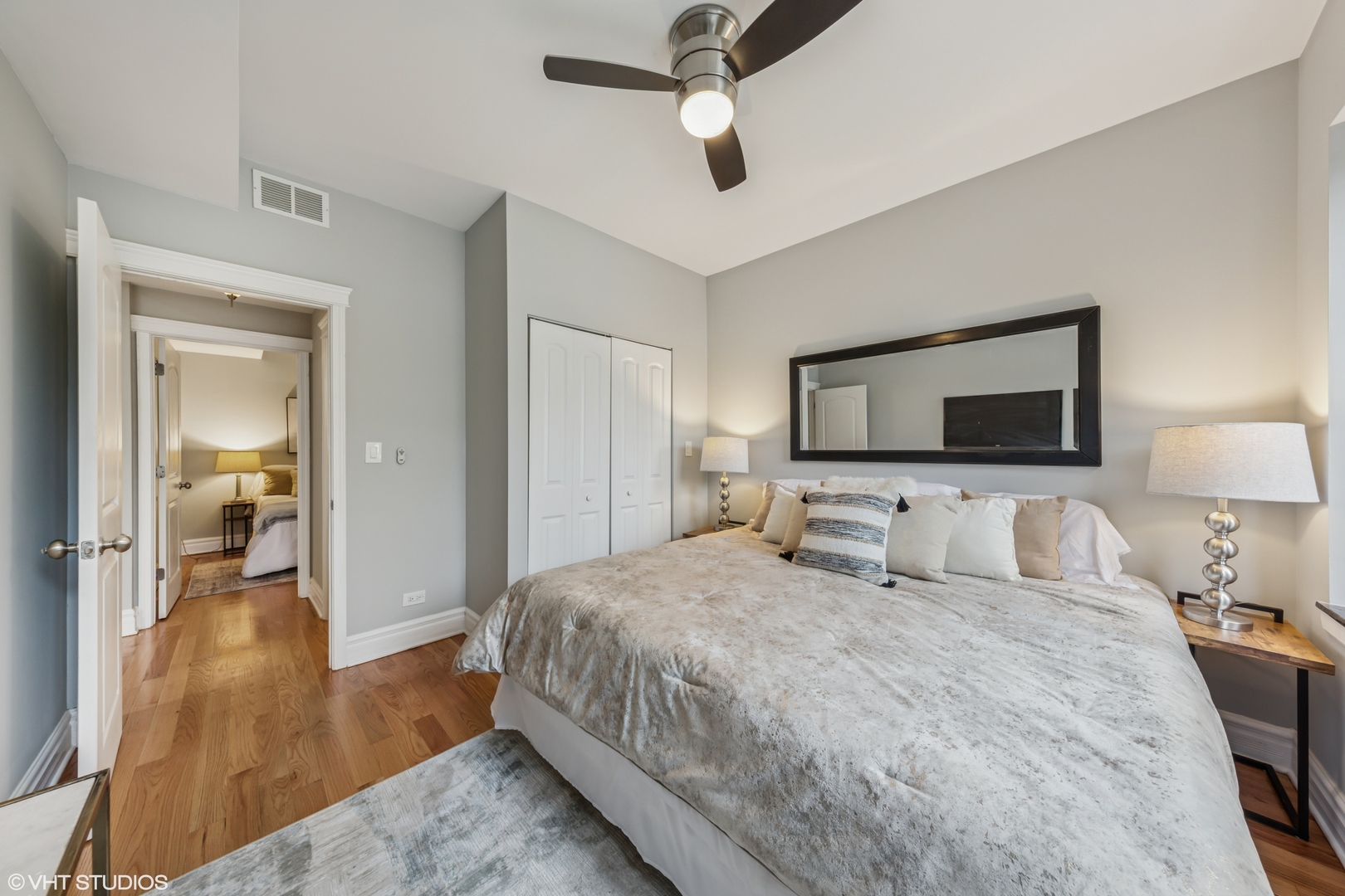 Stunning newer completely updated 2nd floor Two Bedroom/ One Bath Condo Near the 606 Trail. Super bright unit features many large Windows and gleaming refinished oak hardwood floors throughout the living room as well as both bedrooms. Elegant gas fireplace in the cozy living room with recessed lights, exposed brick wall and plenty of natural light. Gorgeous kitchen with granite countertops, contemporary 42″ cabinets and newer stainless-steel appliances. Large spa-like bathroom with modern finishes. Stylish primary bedroom features large picture window and ample closet spaces. Second spacious bedroom could be used as guest bedroom or an Office. Large deck is perfect for entertaining with friends and family or sipping coffee in the morning. This gorgeous unit was just professionally painted throughout. Easy permit street parking zoned for the building. Great Logan Square neighborhood with lots of trendy restaurants, grocery stores, Mozart park, pickleball, 606 Trail and tons more. Metra train and CTA bus is right outside the entrance door. Professionally managed and agent owned. ***Taxes DO NOT reflect homeowners exemption. ***