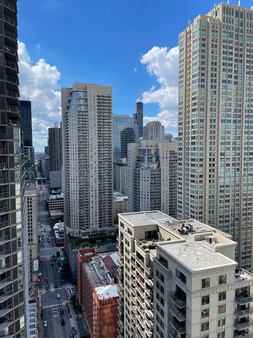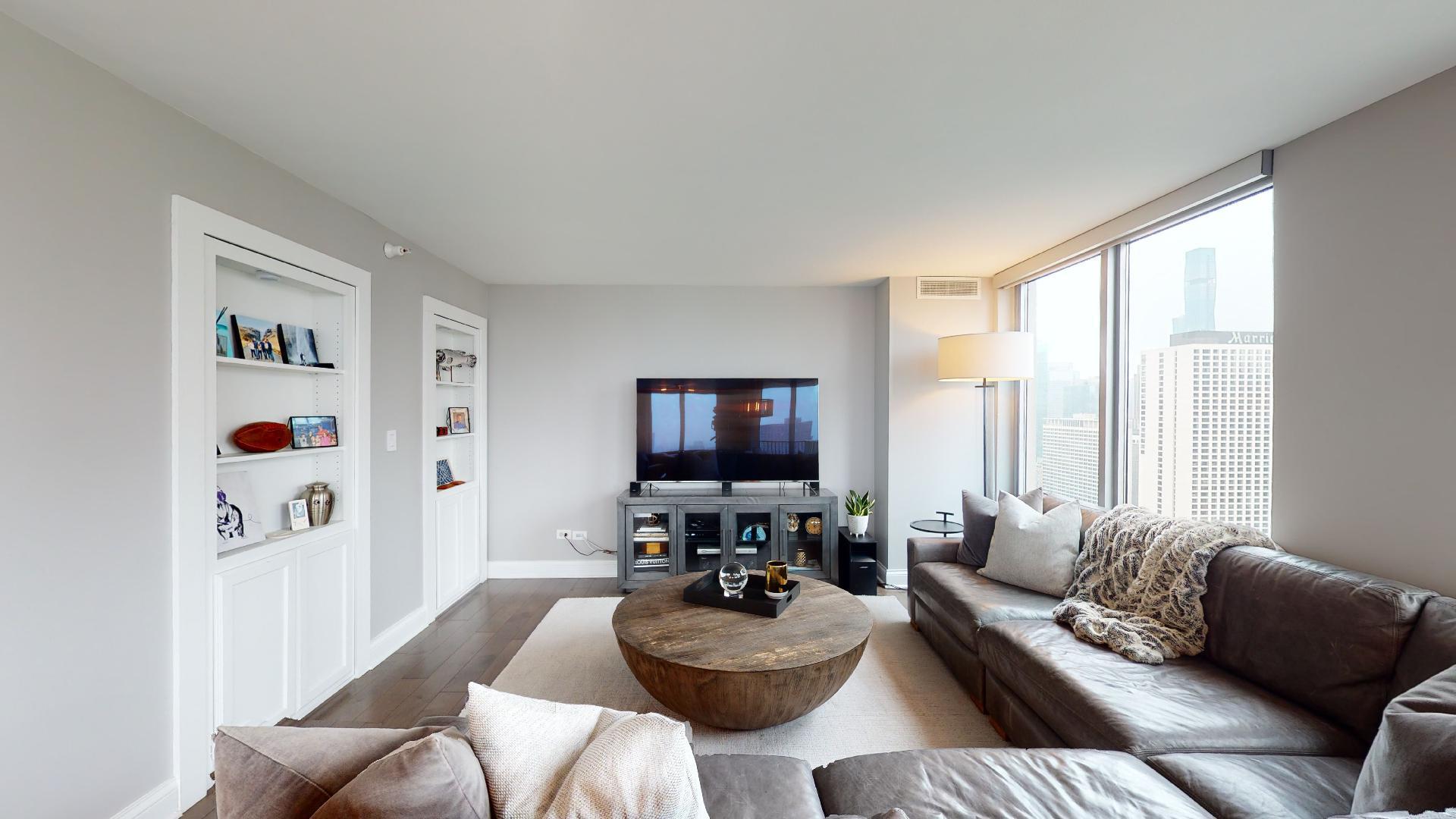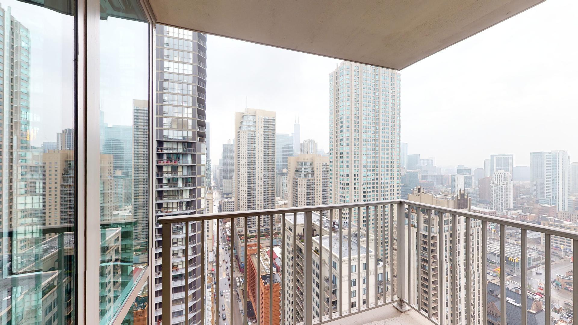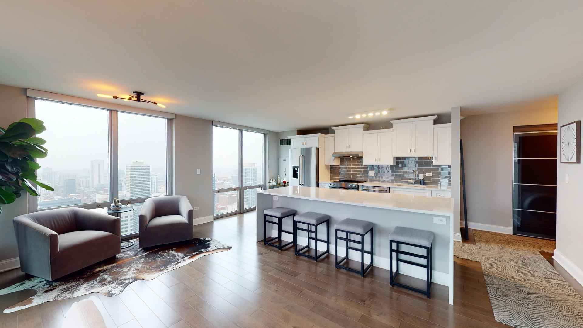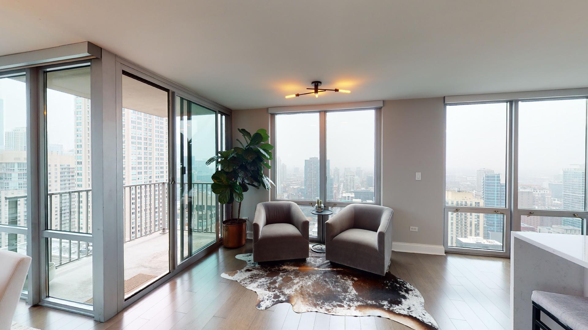 Must see!!! Fully updated high floor 1 bedroom 2 full bath unit, approximately 1300 square feet. Formally a 2 bedroom unit converted into a sprawling one bedroom open-floor plan. Can easily be converted back to a two bedroom if you desire. Floor to ceiling windows with power shades throughout, tons of natural sun light, unobstructed south and west views. Beautiful maple floors throughout, in unit washer and dryer, balcony. Full amenity River North building with gym, rooftop sundeck, party room, dry cleaners, 24hr door staff. Additional storage unit included. Within walking distance to Chicago’s best restaurants, shopping, CTA redline, expressway access and more! Prime extra wide deeded indoor parking spot $35,000 additional.