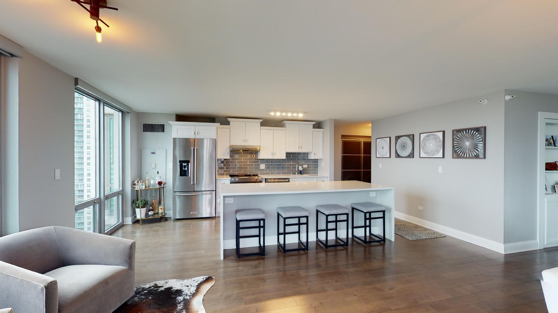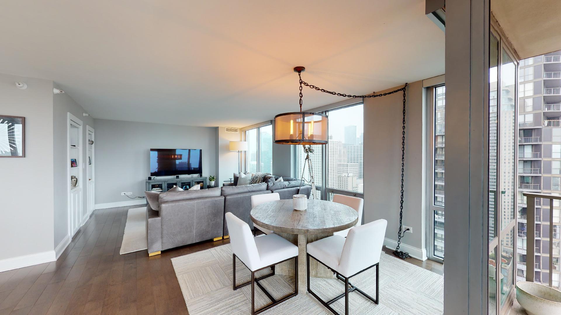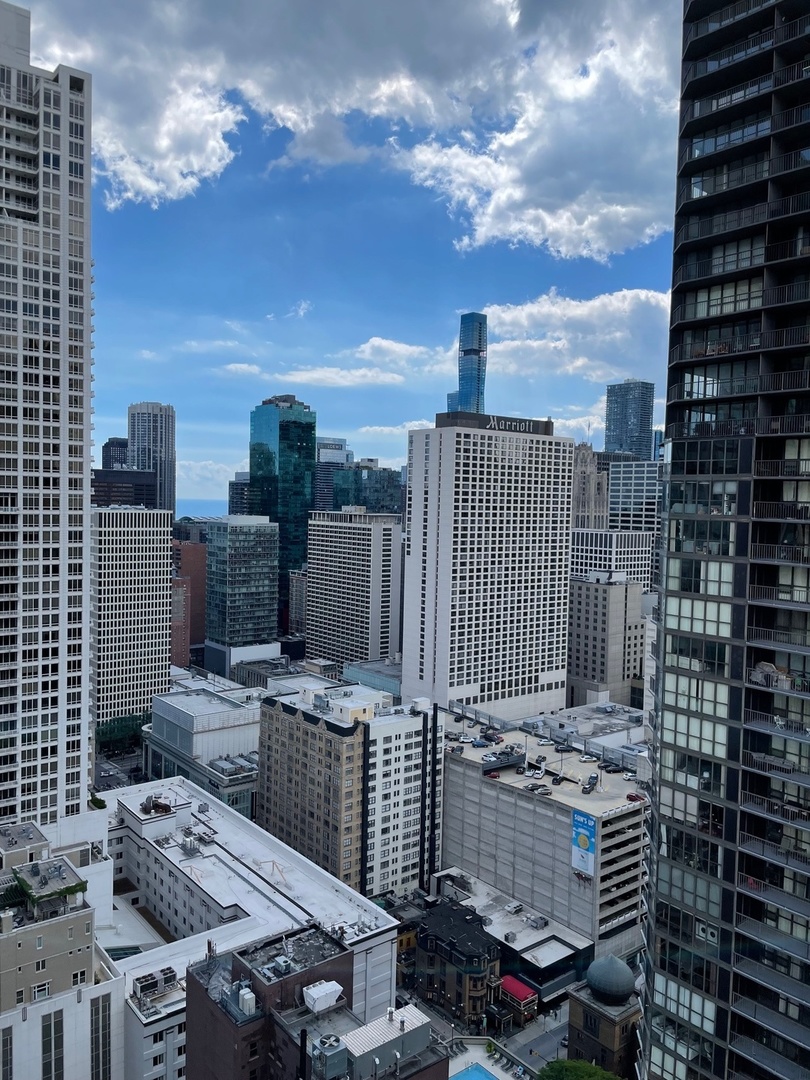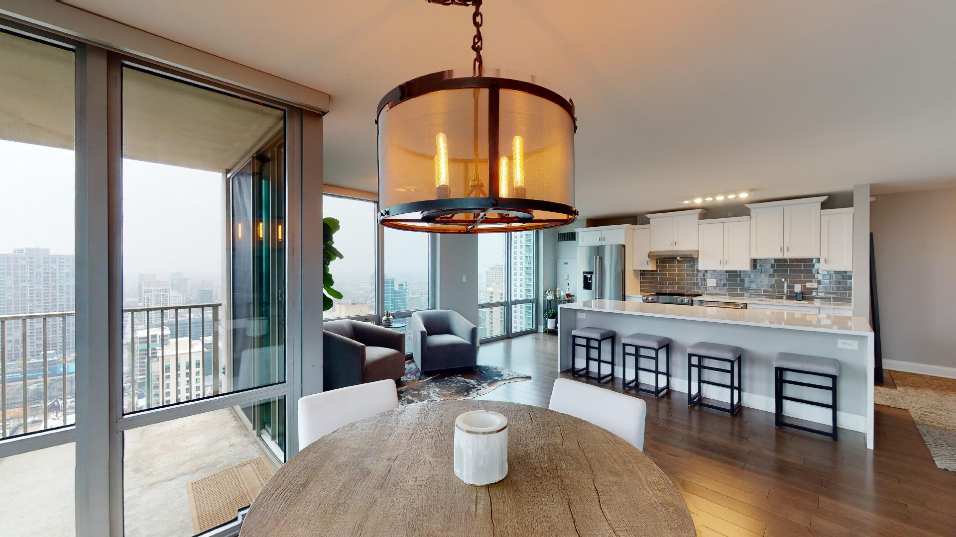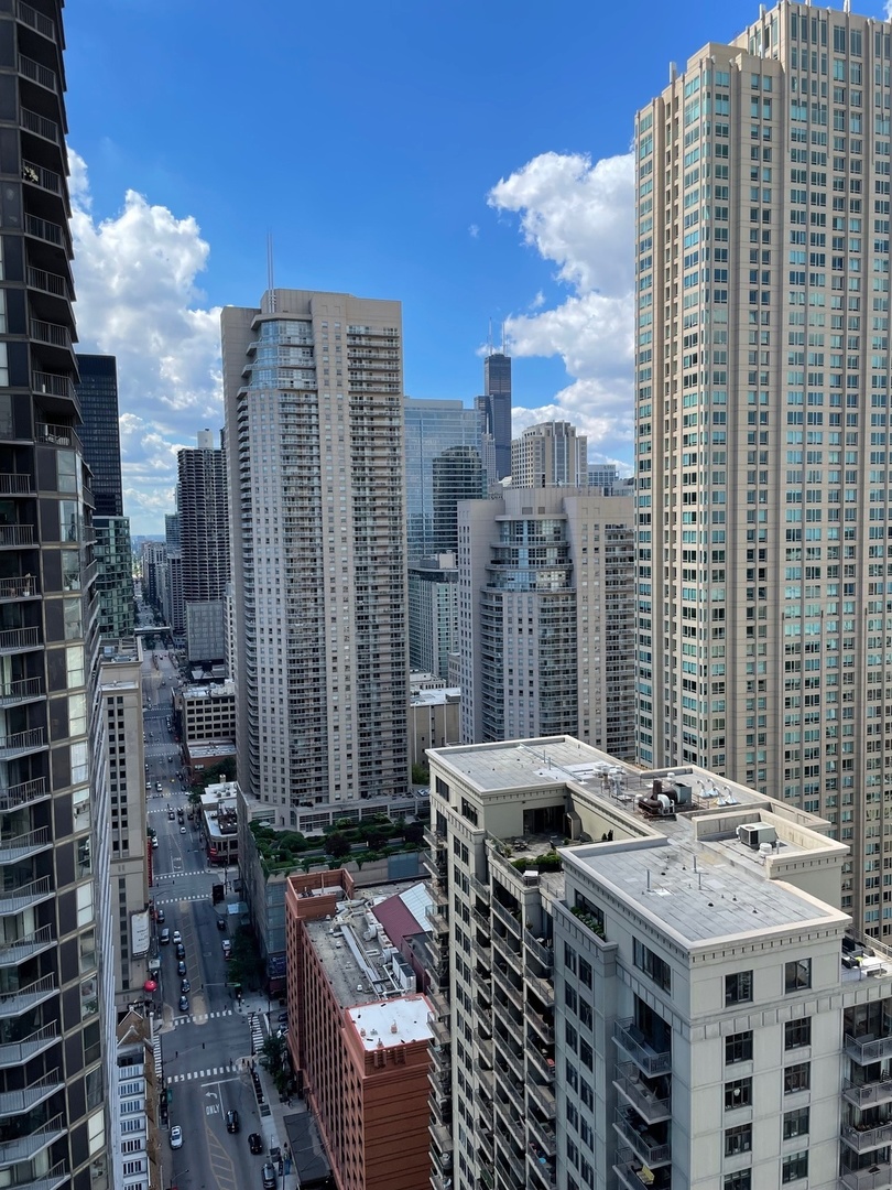 Must see!!! Fully updated high floor 1 bedroom 2 full bath unit, approximately 1300 square feet. Formally a 2 bedroom unit converted into a sprawling one bedroom open-floor plan. Can easily be converted back to a two bedroom if you desire. Floor to ceiling windows with power shades throughout, tons of natural sun light, unobstructed south and west views. Beautiful maple floors throughout, in unit washer and dryer, balcony. Full amenity River North building with gym, rooftop sundeck, party room, dry cleaners, 24hr door staff. Additional storage unit included. Within walking distance to Chicago’s best restaurants, shopping, CTA redline, expressway access and more! Prime extra wide deeded indoor parking spot $35,000 additional.