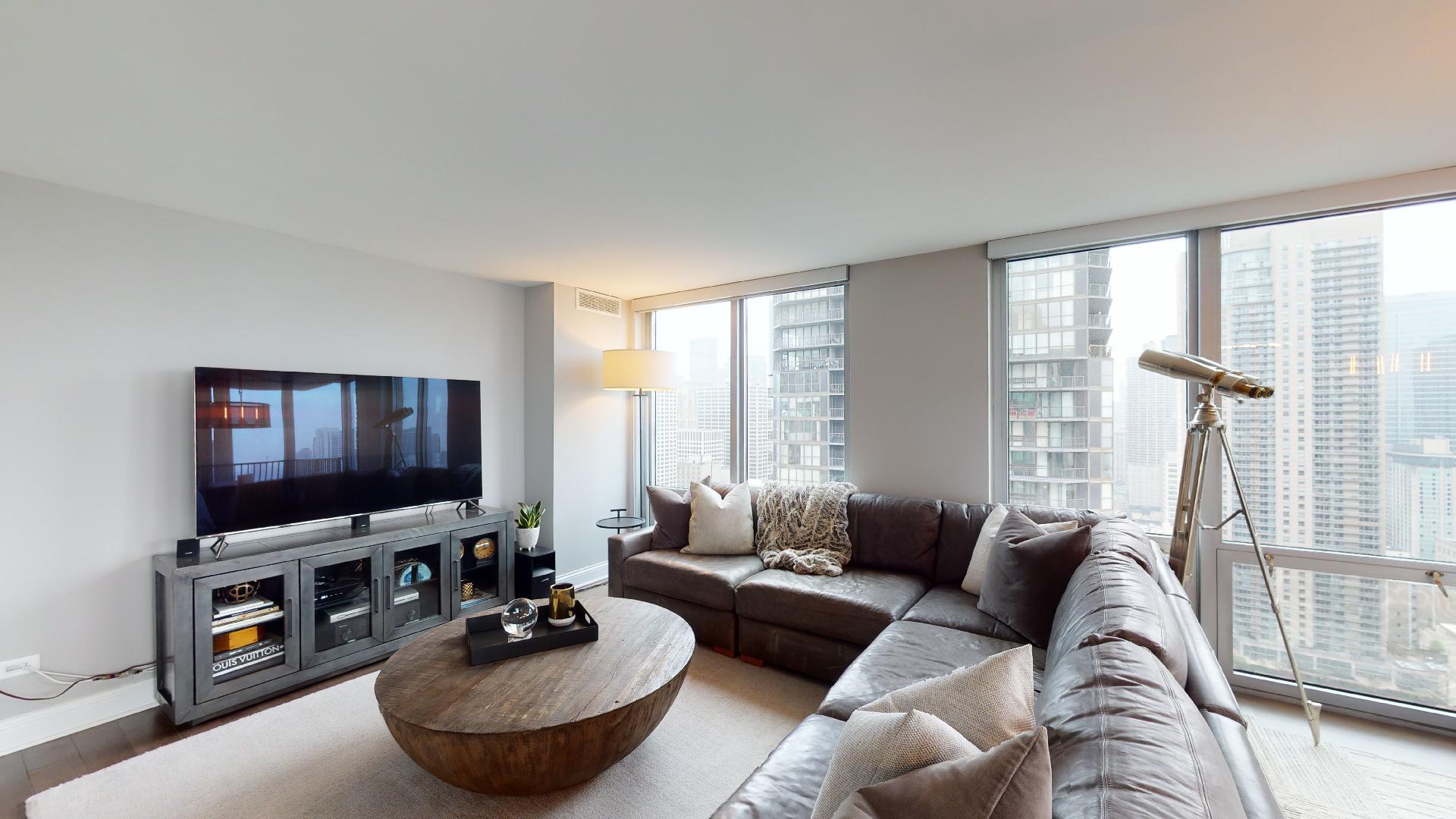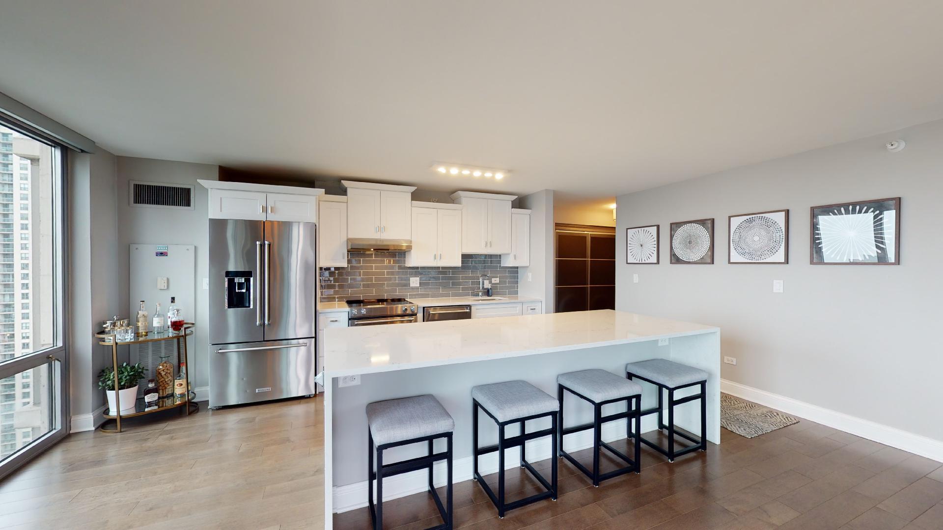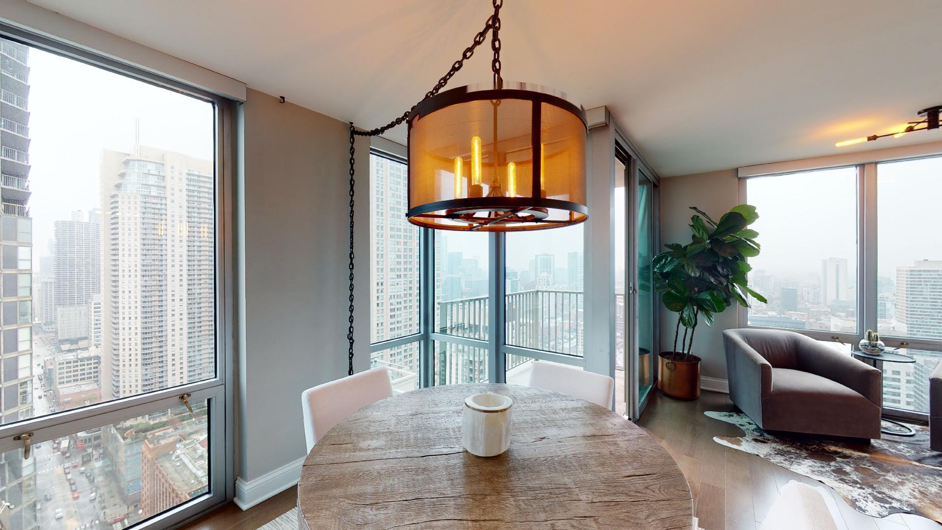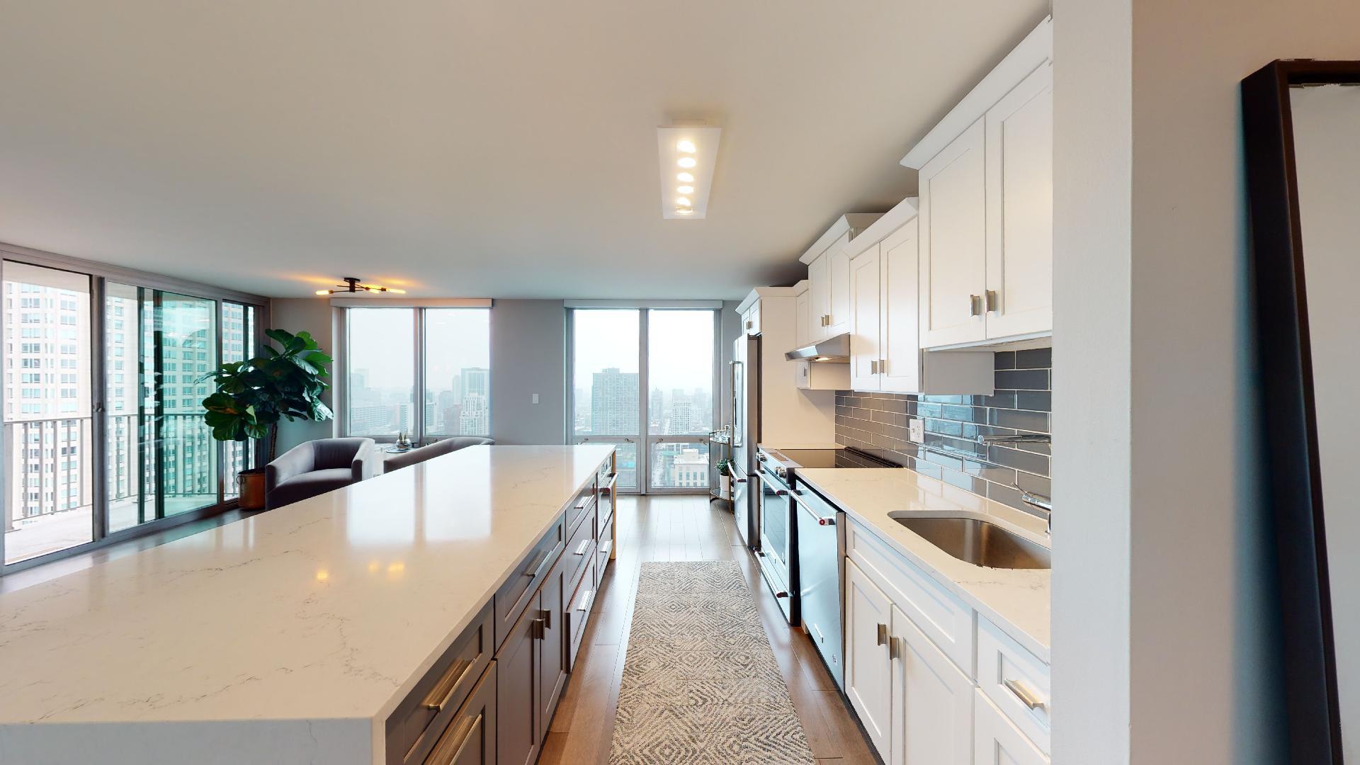 Must see!!! Fully updated high floor 1 bedroom 2 full bath unit, approximately 1300 square feet. Formally a 2 bedroom unit converted into a sprawling one bedroom open-floor plan. Can easily be converted back to a two bedroom if you desire. Floor to ceiling windows with power shades throughout, tons of natural sun light, unobstructed south and west views. Beautiful maple floors throughout, in unit washer and dryer, balcony. Full amenity River North building with gym, rooftop sundeck, party room, dry cleaners, 24hr door staff. Additional storage unit included. Within walking distance to Chicago’s best restaurants, shopping, CTA redline, expressway access and more! Prime extra wide deeded indoor parking spot $35,000 additional.