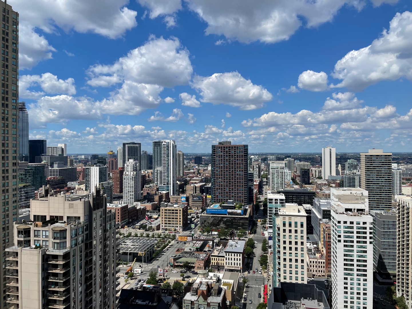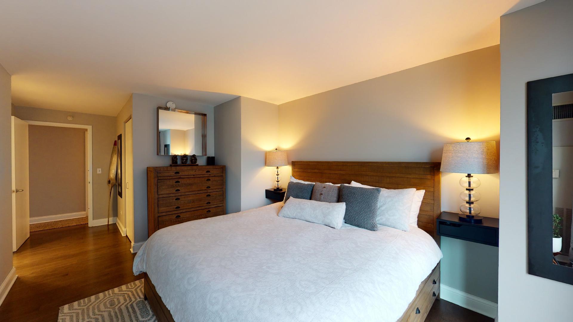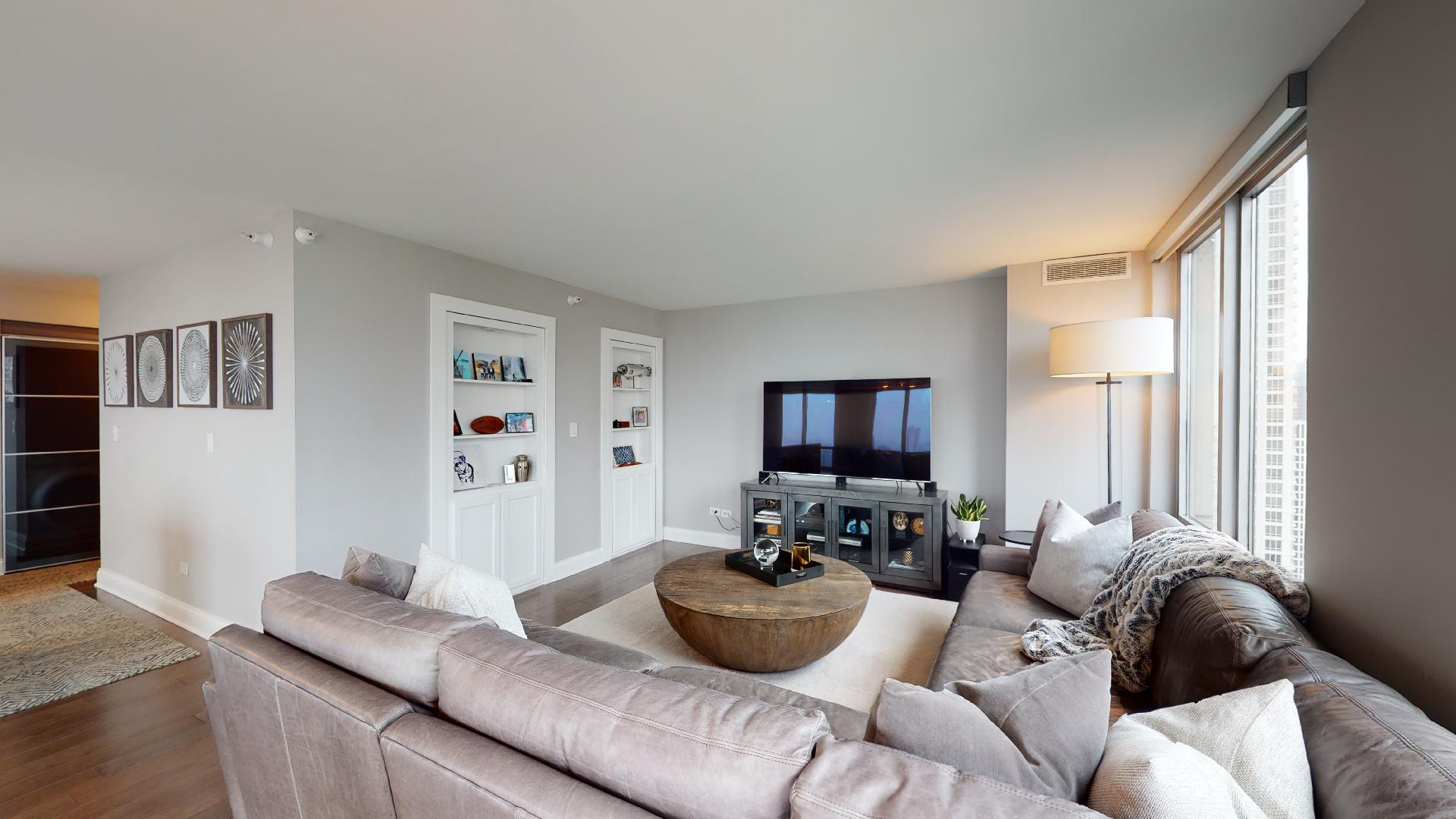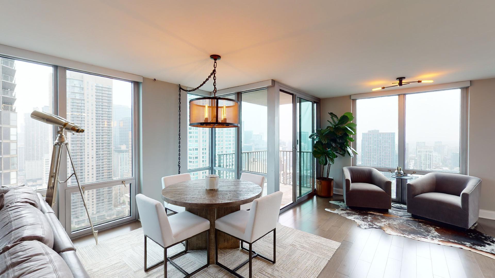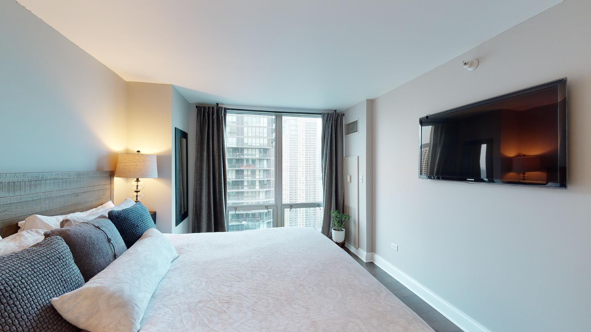 Must see!!! Fully updated high floor 1 bedroom 2 full bath unit, approximately 1300 square feet. Formally a 2 bedroom unit converted into a sprawling one bedroom open-floor plan. Can easily be converted back to a two bedroom if you desire. Floor to ceiling windows with power shades throughout, tons of natural sun light, unobstructed south and west views. Beautiful maple floors throughout, in unit washer and dryer, balcony. Full amenity River North building with gym, rooftop sundeck, party room, dry cleaners, 24hr door staff. Additional storage unit included. Within walking distance to Chicago’s best restaurants, shopping, CTA redline, expressway access and more! Prime extra wide deeded indoor parking spot $35,000 additional.