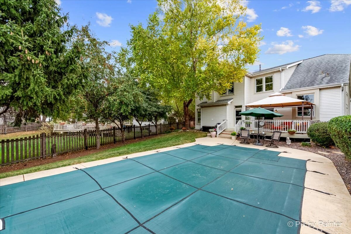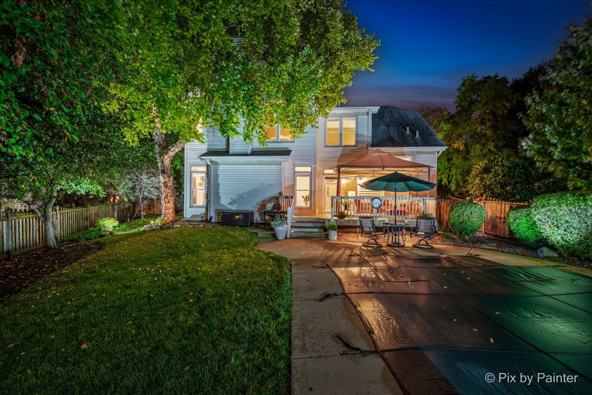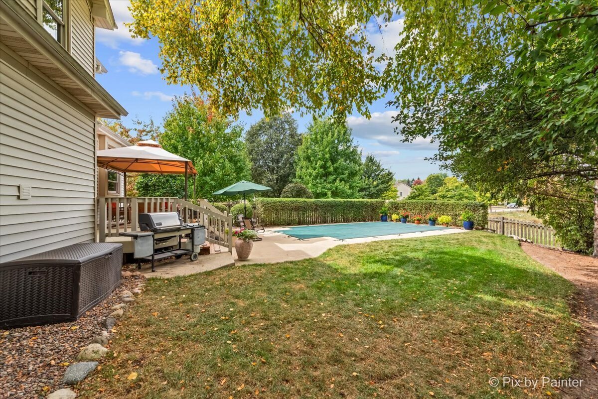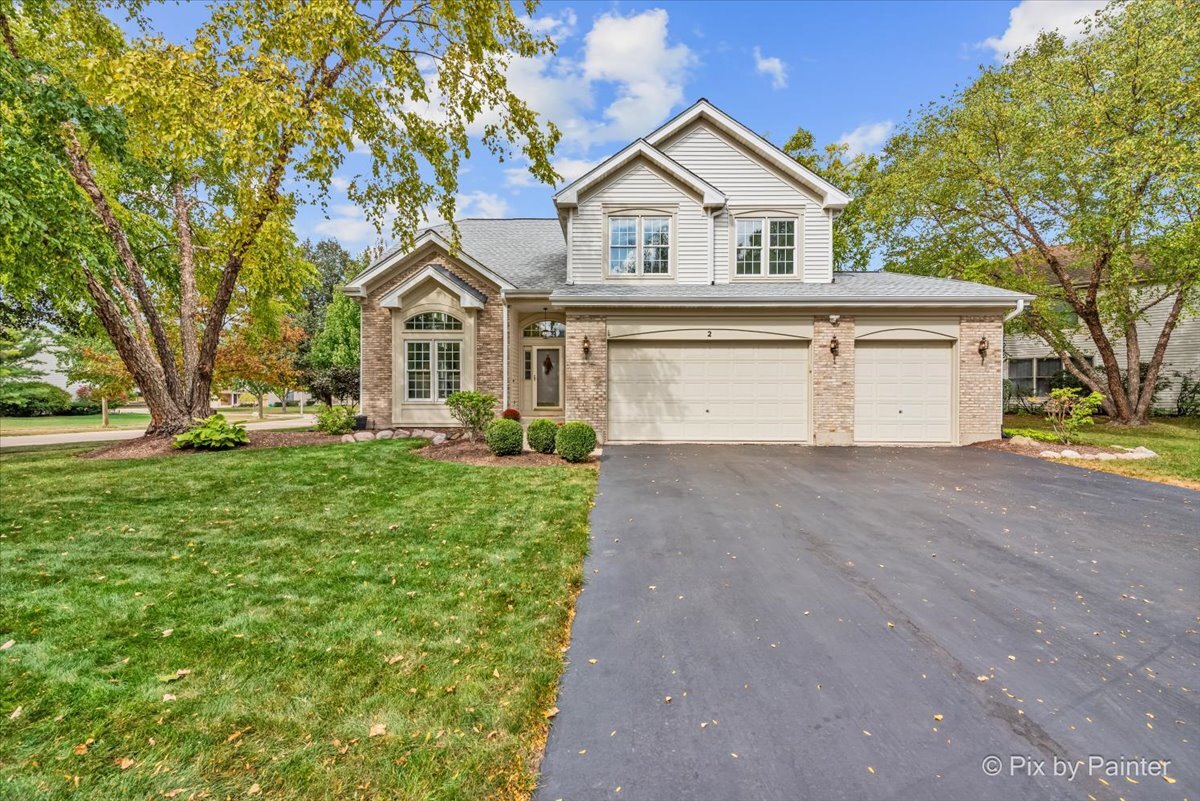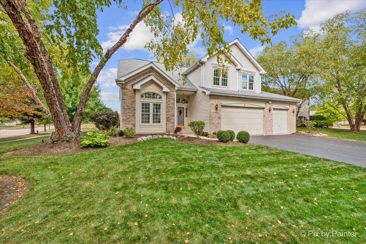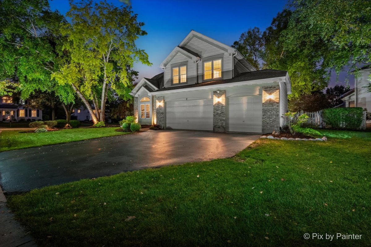 Welcome to 2 White Chapel Ct. – This stunning, desirable and rarely available “Madison” Model home offers 2,612 sq. ft. (above grade) of beautifully designed living space in the highly sought-after Willoughby Farms subdivision of Algonquin. Perfectly situated on a large, professionally landscaped corner lot with underground sprinklers, this 4-bedroom, 3-bath home (including a first-floor in-law/office/craft room with adjacent full bath) with 3 car garage combines timeless style, modern upgrades, and an outdoor oasis featuring your very own deck and in-ground heated pool. From the moment you arrive, the curb appeal is undeniable. With its strategically placed lights that subtly light up the beautiful landscaping at night accenting mature river birch trees, this home will impress from the start. Step inside to be greeted by a soaring two-story foyer and majestic staircase (highlighted by lit recessed built-ins ideal for displaying your favorite artwork or family treasures). Freshly painted and re-carpeted, every inch of this home radiates pride-of-ownership that sets the stage for the elegance found throughout. Off to your left is your formal living and dining areas with voluminous soaring ceilings and stained-glass windows providing the perfect spaces for entertaining and serving an incredible meal. At the heart of the home lies your gourmet kitchen – a true chef’s delight with 42″ maple-glazed cabinetry, dovetail self-closing drawers, granite countertops, stone tile backsplashes, under-cabinet lighting, and a large granite-topped island with added storage. Stainless steel KitchenAid professional series appliances, including a gas cooktop and separate convection oven, make preparing meals a joy. The spacious eat-in area provides casual dining with views of your private backyard retreat through sliding glass doors with built-in blinds. The kitchen flows seamlessly into the family room, where a cozy gas fireplace invites you to unwind after a long day. Nearby, a spacious laundry room with front-loading washer and dryer, sink, shelving, and hanging racks adds everyday convenience. Tucked away on the main level is your flexible office/in-law/guest room, adjacent to a full bath for true multi-generational living. A three-car garage with cabinets and an extended pad ensures plenty of room for vehicles, storage, and hobbies. Upstairs, retreat to your luxurious master suite sanctuary featuring a sitting room, vaulted ceiling, and spa-like en-suite. Pamper yourself with a whirlpool tub, separate stand-up ceramic tiled shower, dual sink vanity, heated bathroom floors, and an expansive walk-in closet with California Closet organizers. Additional bedrooms and a loft area provide ample space for family and guests. The partially finished basement is designed for entertaining, complete with a built-in bar, full-size refrigerator, and a massive crawl space for all your storage needs. Step outside and discover your private backyard oasis. A large deck with canopy overlooks the heated in-ground pool, surrounded by lush landscaping and unmatched privacy with no homes directly behind you – (notice the extra green / conservation space behind gate at rear of property!). Whether it’s morning coffee, weekend barbecues, or evening swims, this is your perfect spot for making memories with family and friends. Updates and upgrades provide peace of mind: new furnace and A/C with UV light purification (2017 – w/transferable warranty), roof w/powered attic vent replaced 2014 (according to previous owners, shingles are a 50 year shingle), siding (2021), new water softener (2024), pool heater (9 years old), whole house water filtration system and recent paint and carpeting. An ADT security system adds an extra layer of comfort. This home is just minutes from downtown Algonquin’s thriving restaurants and shops, award-winning District 300 schools, the tranquil Fox River, Golf Club of Illinois, and easy access to the I-90 corridor. Schedule your showing today!