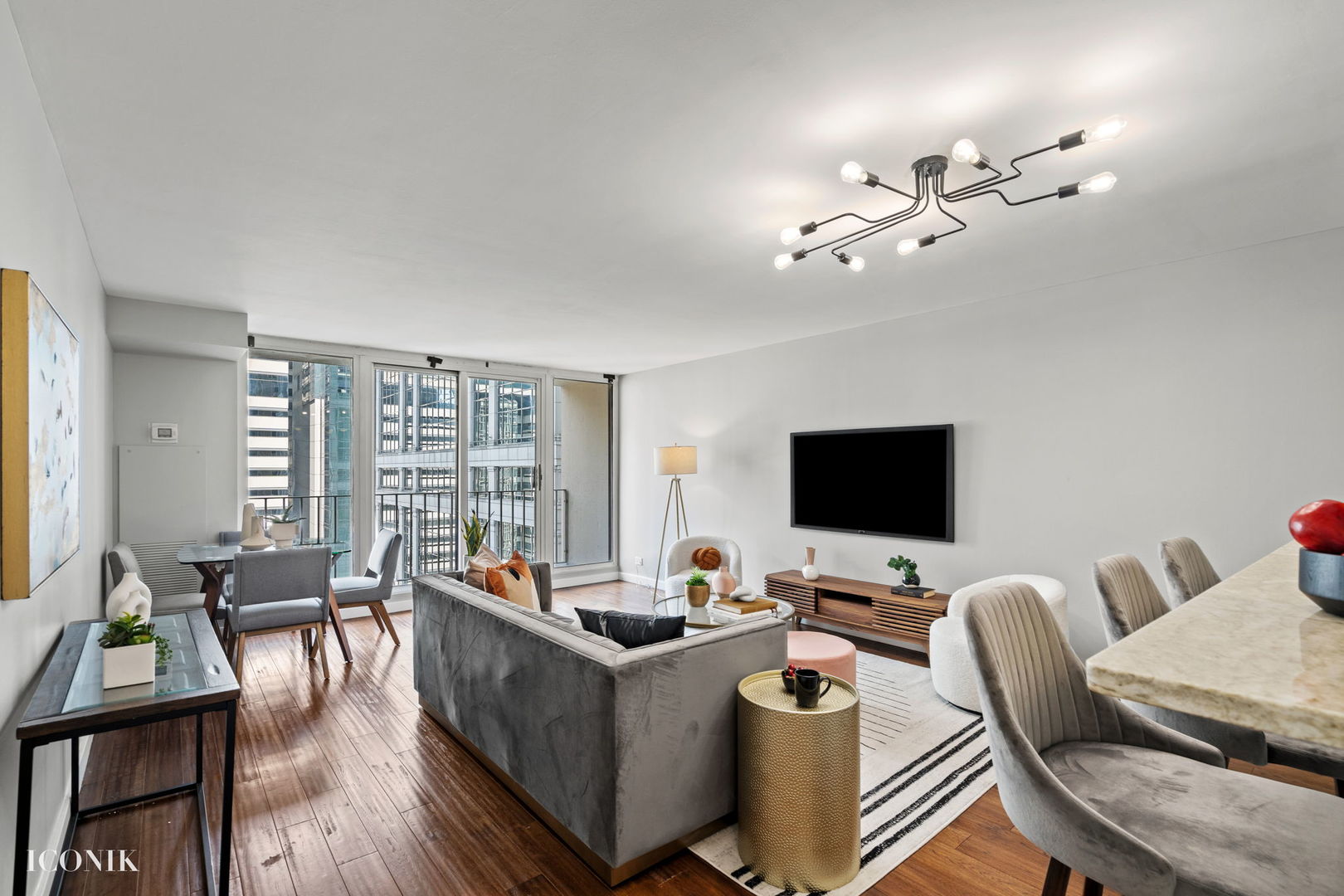 Beautifully updated 2 bedroom/1 bath condo with parking included! Live at the center of it all-just steps from the new Google HQ, Chicago Riverwalk, Millennium Park, Grant Park, the Art Institute, and the vibrant Theatre District while sitting in a full-amenity high-rise building that offers the best of downtown living. This open-concept layout features a spacious kitchen with stainless steel appliances and granite countertops, a breakfast bar that flows seamlessly into the dining and living areas-perfect for everyday comfort and effortless entertaining. Enjoy updated hardwood floors throughout and modern sputnik light fixtures, spacious bedrooms, generous closet space and a private balcony with sweeping city views. One of the rare units in the building with in-unit laundry plus the convenience of a building laundry room for added flexibility. Full-service amenities include a 24-hour fitness center, indoor pool, sundeck with grilling stations, bike room, storage and (1) garage parking spot included in the price! With a 7-Eleven connected to the building, Amazon drop box onsite, and every CTA line just outside your door, this is true downtown convenience. No restrictions on pets or rentals. Welcome home!