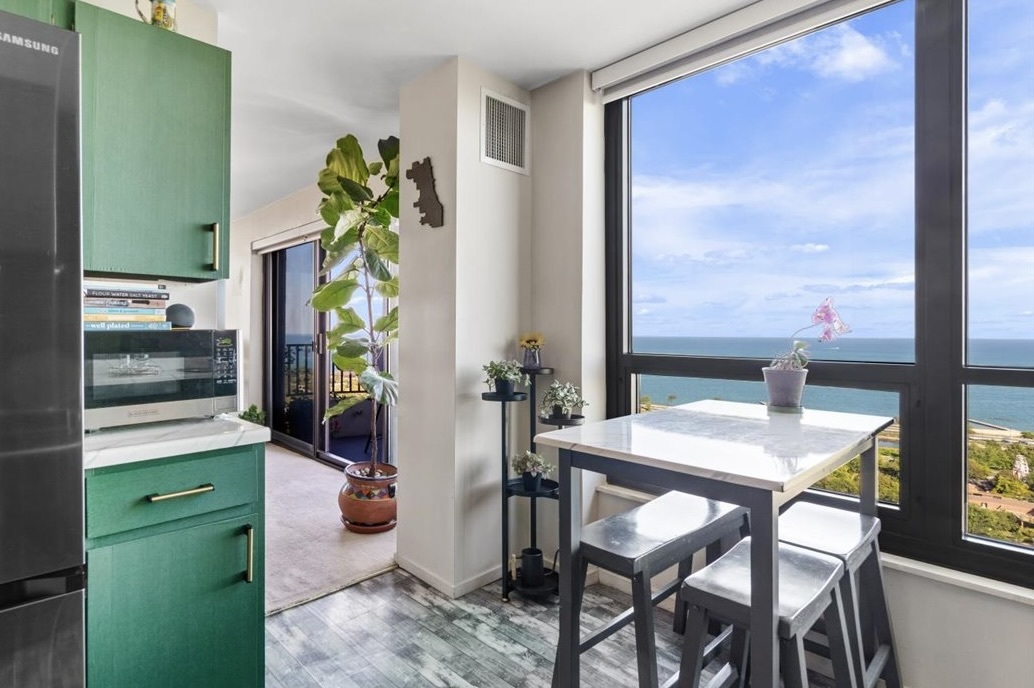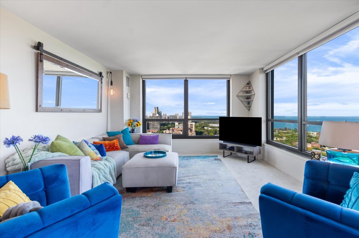 Attention view snobs, this one’s for you! As you enter the home, your eyes are immediately drawn to the breathtaking Unobstructed views of lake, park, Diversey Harbor, Conservatory fountain & gardens as well as the Chicago city skyline. This northeast corner deluxe 1 bedroom has over 45 feet of wall-to-wall windows wrapping around the entire corner. Gorgeous views anytime of the day or season; sunrise over the lake in the morning & shimmering Chicago skyline lights at night. Front row seat to Chicago’s Air & Water Show, Navy Pier fireworks & zoo holiday night lights. Private, uniquely curved balcony overlooks this picturesque scene; a great place to entertain family & friends with a barbecue. Largest 1 bedroom floor plan in building. Bright and sunny home offers exceptional natural light, just installed brand new double pane windows in entire home excluding balcony doors, NO special. Features: high end remote control window treatments, newer lighting, Recently remodeled beautiful large bathroom with double sinks, gorgeous shower & flooring. The largest bath layout in the building (even larger than the standard 2 bedroom unit bath). The Kitchen has a huge picture window to watch the sailboats go by while you cook! Kitchen wall can be removed if open kitchen is desired. Spacious bedroom offers wall of windows with fabulous unobstructed views of lake, park, harbor and conservatory. This home has a great deal of closet space, including an additional closet across from the bedroom & linen closet next to bath. The gracious oversized foyer has a large closet and is spacious enough for a desk and office work area. Assessments include heat, central air, internet and wifi, cable TV with Showtime and numerous premium channels, Tivo, On Demand, 24-hour door staff/maintenance. Association offers the best amenities, brand new just remodeled large Mezzanine outdoor area featuring tennis court, basketball court, walking/jogging track, golf putting, bean bag toss, seating area with fire pits, grills, large fitness center, yoga room, outdoor swimming pool with picnic area, sauna, whirlpool, recently remodeled hospitality/party room with full kitchen, library, plus 24-hour access package room. No special assessments for over 28 years, yet major projects completed, HVAC, chillers, windows, mezzanine and more. Located in the heart of Lincoln Park, across street from park. Close to lake, park, zoo, jogging & bike paths, nature & history museum, conservatory, lily pond, farmers market, shopping, grocery, restaurants, nightlife and public transportation. Attached garage parking-$210 month, currently have a wait. If desire 2 spaces – must be tandem. You will rarely find a home with this UNOBSTRUCTED view & over abundance of building amenities. A true sanctuary in the sky, ideal for city living at its best!