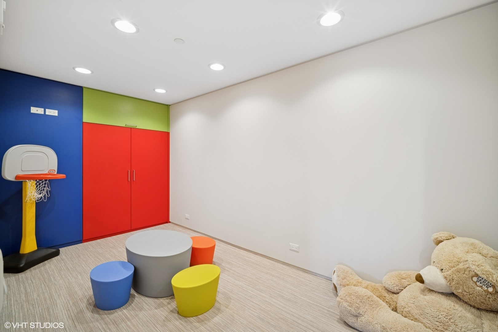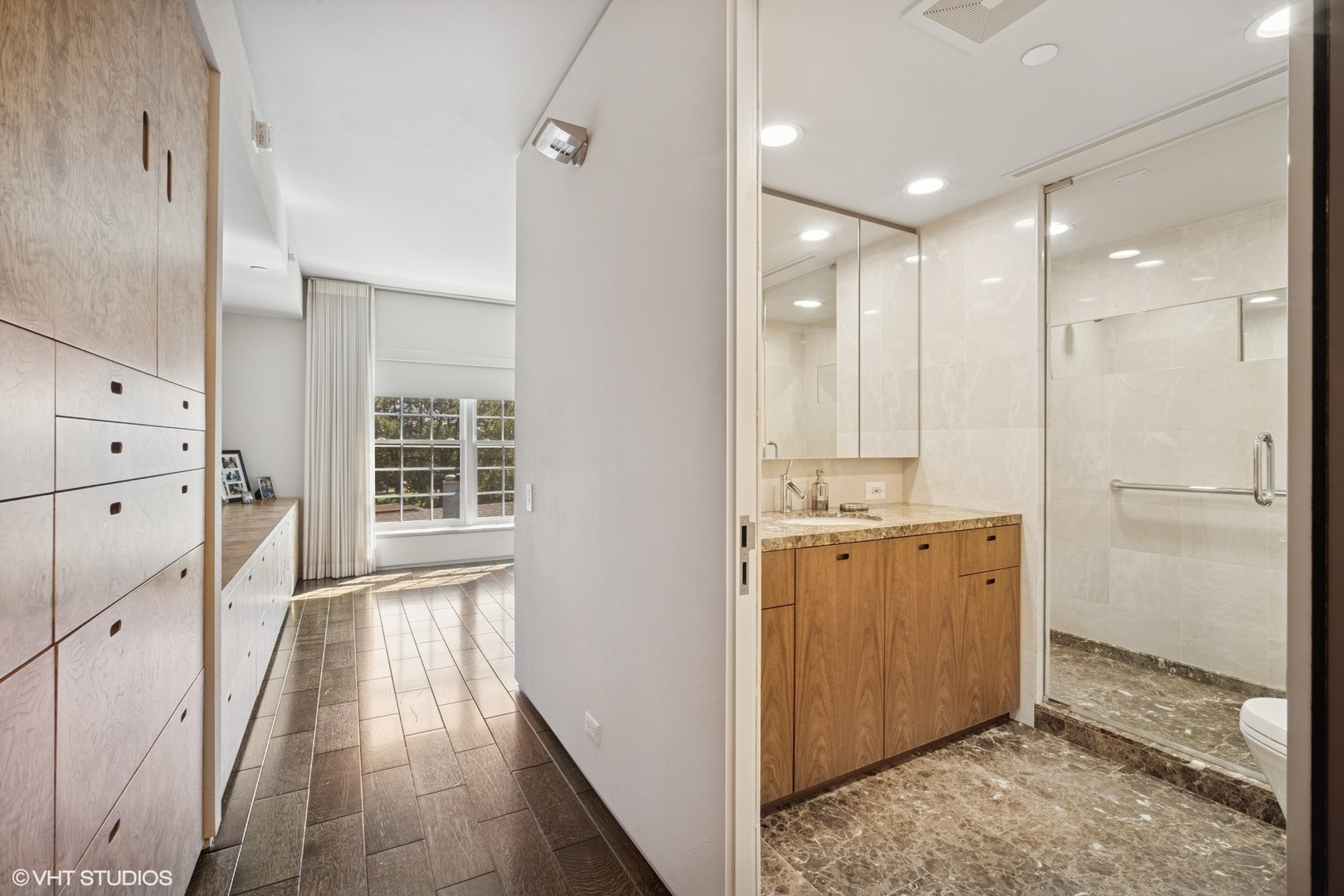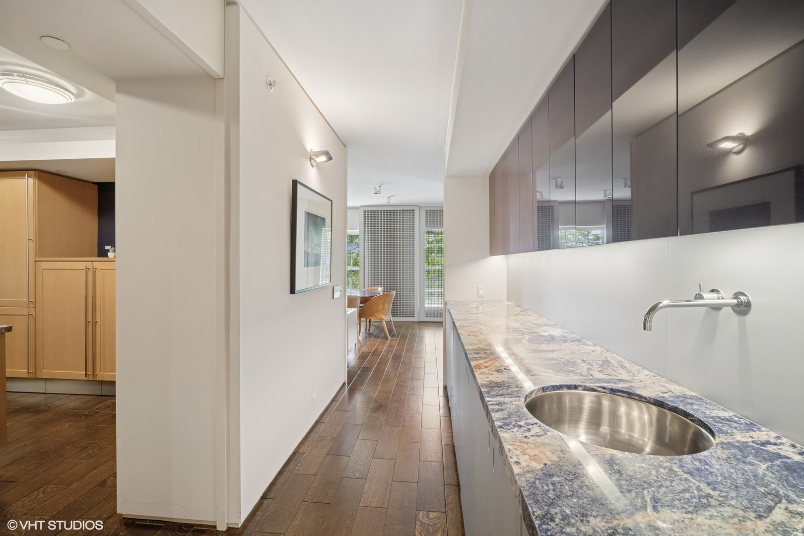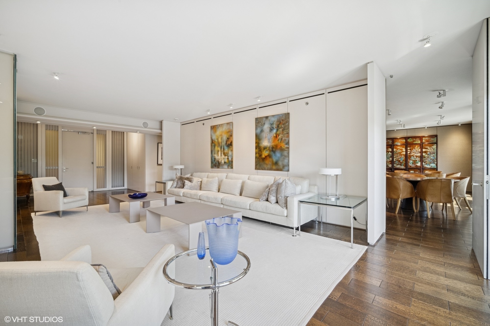 Simply striking & palatial condo ripped right from the pages of Architectural Digest located in-town just blocks from Lake Michigan in one of Highland Park’s most prestigious concierge buildings. Designed by renowned architects Powel/Kleinschmidt this unique and timeless unit is like living inside of a masterpiece. A grand foyer leads into the sunny & sleek living room featuring floating frosted glass shelving, strategic track lighting designed to highlight beautiful works of art and a sliding glass door to one of two stone balconies. The Chef’s De Giulio designed eat-in kitchen is a work of art featuring a 48″ Viking SS range & double oven w/ professional grade hood & convenient pot filler, enormous granite work island with overhang for stool seating, two side-by-side Sub Zero fridge/freezers (one SS, one cabinet integrated), Miele dishwasher, pull out shelving, under cabinet & cove lighting, and display shelves. The 12′ long granite butler’s pantry between the kitchen & formal dining room operates as a wet bar with its own Fisher Paykel dishwasher, Sub Zero mini fridge, wine fridge and ice maker for easy entertaining. The dining room features sophisticated floating buffet cabinetry w/ natural stone tops for storage, serving, displaying. A dramatic & symmetrical gallery style hallway leads to the primary bedroom suite and is quintessential luxury. Designed to accommodate “Him & Her” in every way, the large bedroom has built-in burlwood cabinetry, an MTV Cribs worth dressing room for “Her” (just under 200 sqft) w/ built-in dressers, shoe shelving, translucent glass door hanging wardrobes, frosted display shelving, and a lovely make-up vanity with natural lighting. “Her” bath has a white marble glass enclosed shower, soaking tub & private lav room with bidet, plus “His” separate WIC and handsome marble full bath. The two secondary bedrooms each have their own beautiful natural stone private baths & exceptional closet space & built-in dressers. Casual entertainment takes place in the stylish family room with gorgeous wood paneled walls, built-in media center and slider to the 2nd stone balcony. Working is a breeze in the big & bright office with serene treetop views, and playtime is easy in the adorable playroom featuring playful & colorful built-ins. The laundry/mud room is home to the extra Sub-Zero fridge/freezer for storage/overflow, full sized Neptune front load W/D with tremendous counterspace for folding, prepping, etc. Multiple in-unit storage rooms means no need to downsize here, plus additional storage space in the garage near the unit’s 3 indoor garage parking spots. Additional features include beautiful hardwood flooring, custom paneled walls T/O, zoned HVAC (3 units), on-site concierge from 7am-10pm 7 days a week including holidays, access to the building exercise room, conveniently close to shopping, recreation, transportation, Ravinia and so much more. Lovingly maintained and upgraded, you will not find an equal to this unique & stunning unit. Seller would prefer to sell furnished as much of the furniture was custom designed.