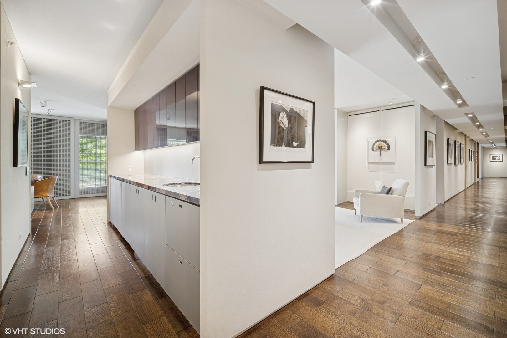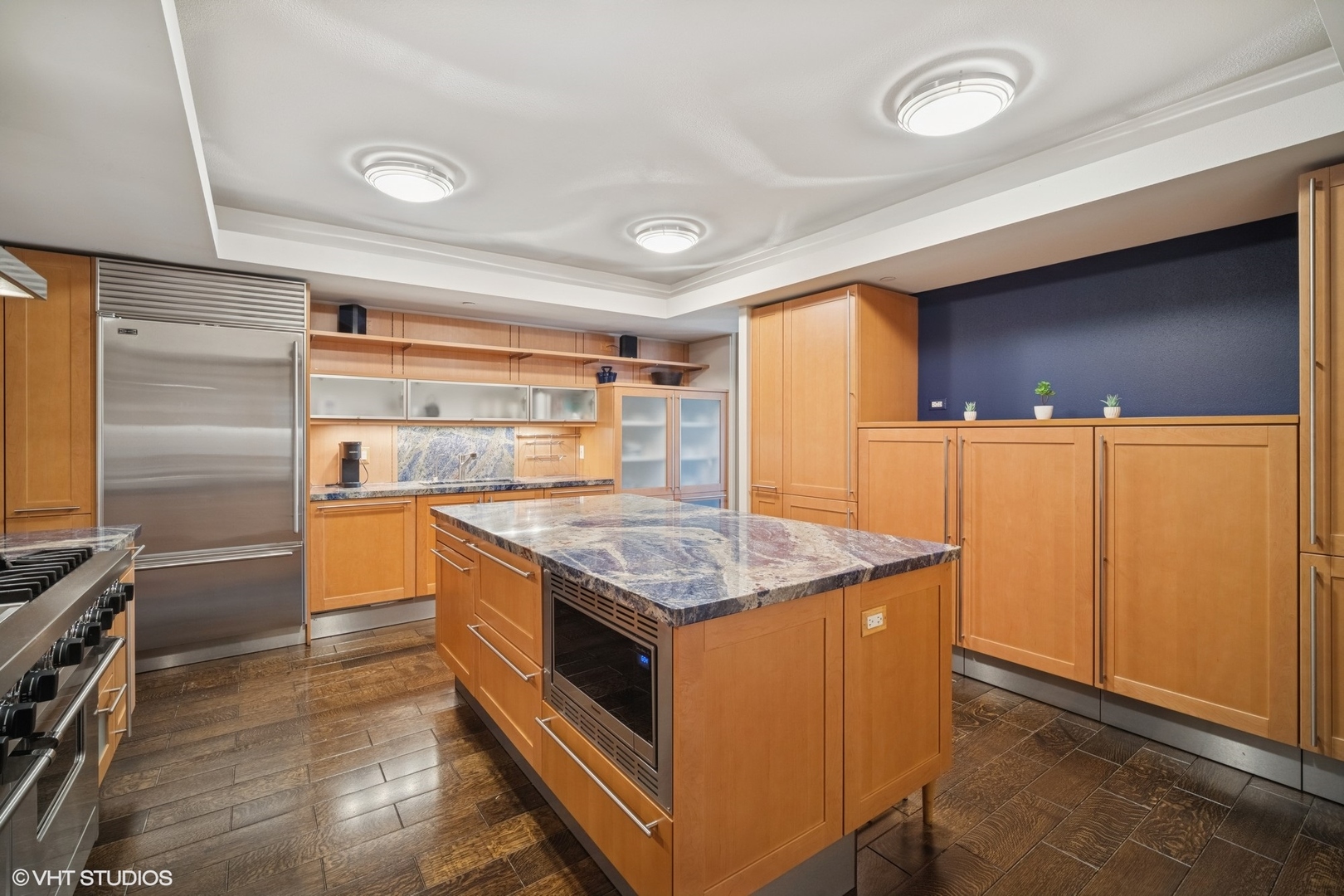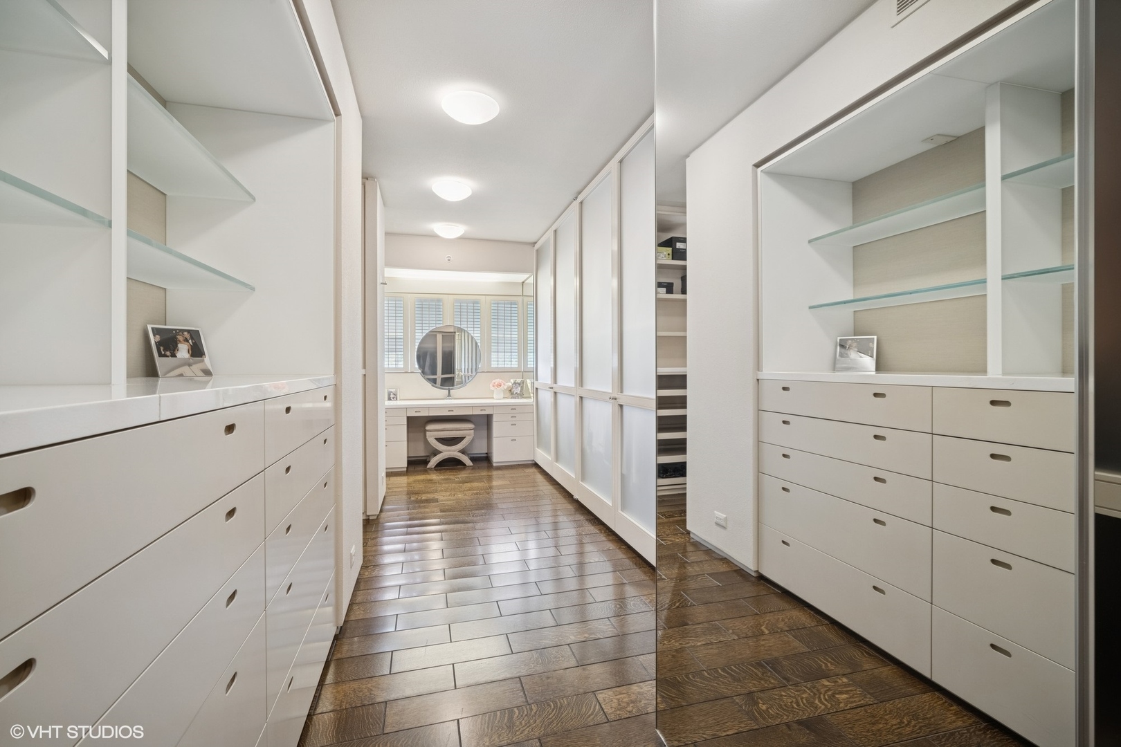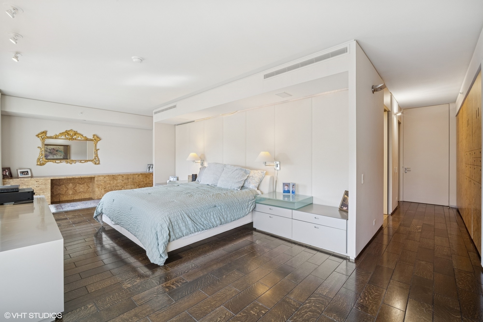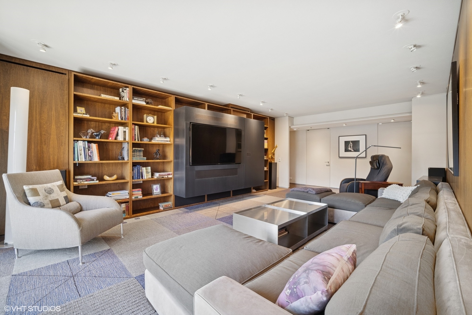 Simply striking & palatial condo ripped right from the pages of Architectural Digest located in-town just blocks from Lake Michigan in one of Highland Park’s most prestigious concierge buildings. Designed by renowned architects Powel/Kleinschmidt this unique and timeless unit is like living inside of a masterpiece. A grand foyer leads into the sunny & sleek living room featuring floating frosted glass shelving, strategic track lighting designed to highlight beautiful works of art and a sliding glass door to one of two stone balconies. The Chef’s De Giulio designed eat-in kitchen is a work of art featuring a 48″ Viking SS range & double oven w/ professional grade hood & convenient pot filler, enormous granite work island with overhang for stool seating, two side-by-side Sub Zero fridge/freezers (one SS, one cabinet integrated), Miele dishwasher, pull out shelving, under cabinet & cove lighting, and display shelves. The 12′ long granite butler’s pantry between the kitchen & formal dining room operates as a wet bar with its own Fisher Paykel dishwasher, Sub Zero mini fridge, wine fridge and ice maker for easy entertaining. The dining room features sophisticated floating buffet cabinetry w/ natural stone tops for storage, serving, displaying. A dramatic & symmetrical gallery style hallway leads to the primary bedroom suite and is quintessential luxury. Designed to accommodate “Him & Her” in every way, the large bedroom has built-in burlwood cabinetry, an MTV Cribs worth dressing room for “Her” (just under 200 sqft) w/ built-in dressers, shoe shelving, translucent glass door hanging wardrobes, frosted display shelving, and a lovely make-up vanity with natural lighting. “Her” bath has a white marble glass enclosed shower, soaking tub & private lav room with bidet, plus “His” separate WIC and handsome marble full bath. The two secondary bedrooms each have their own beautiful natural stone private baths & exceptional closet space & built-in dressers. Casual entertainment takes place in the stylish family room with gorgeous wood paneled walls, built-in media center and slider to the 2nd stone balcony. Working is a breeze in the big & bright office with serene treetop views, and playtime is easy in the adorable playroom featuring playful & colorful built-ins. The laundry/mud room is home to the extra Sub-Zero fridge/freezer for storage/overflow, full sized Neptune front load W/D with tremendous counterspace for folding, prepping, etc. Multiple in-unit storage rooms means no need to downsize here, plus additional storage space in the garage near the unit’s 3 indoor garage parking spots. Additional features include beautiful hardwood flooring, custom paneled walls T/O, zoned HVAC (3 units), on-site concierge from 7am-10pm 7 days a week including holidays, access to the building exercise room, conveniently close to shopping, recreation, transportation, Ravinia and so much more. Lovingly maintained and upgraded, you will not find an equal to this unique & stunning unit. Seller would prefer to sell furnished as much of the furniture was custom designed.