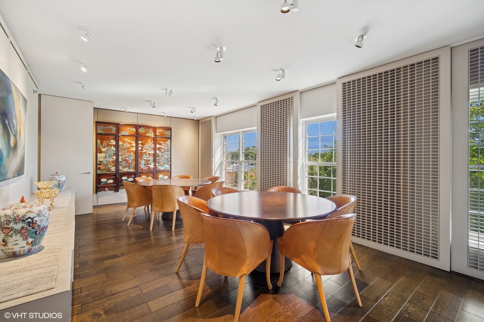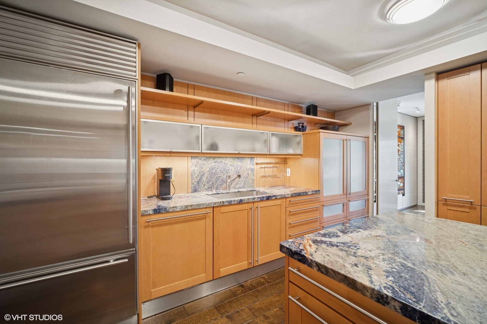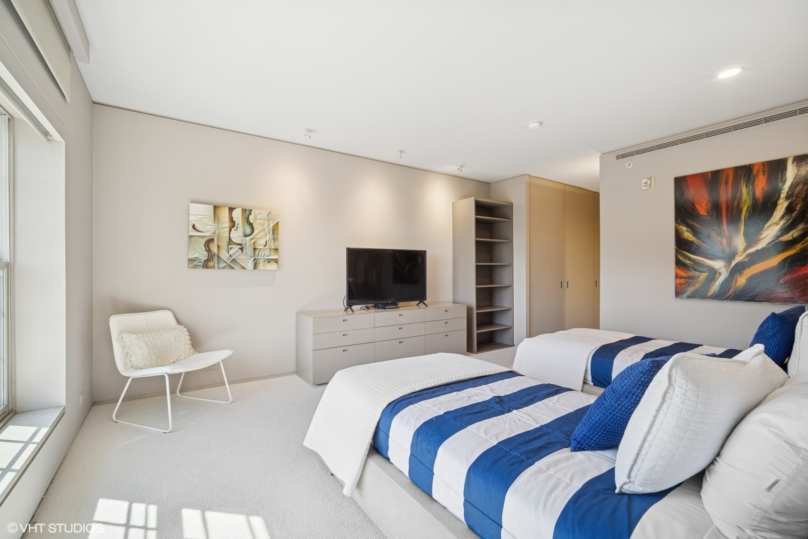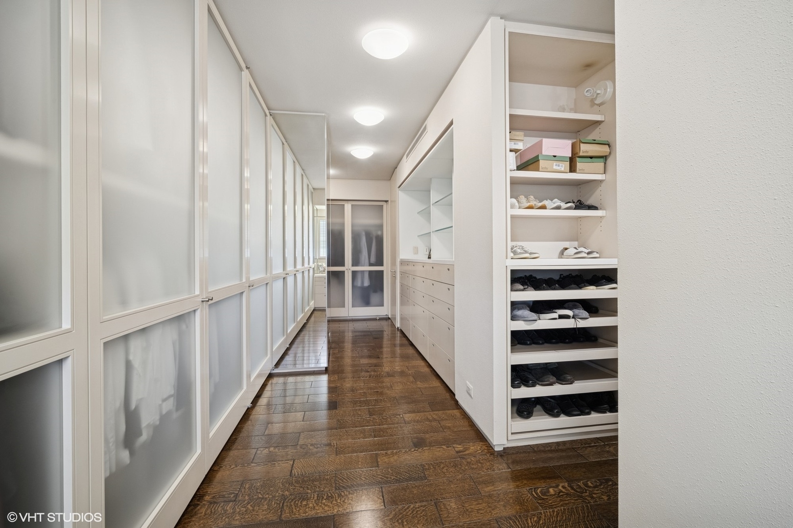Simply striking & palatial condo ripped right from the pages of Architectural Digest located in-town just blocks from Lake Michigan in one of Highland Park’s most prestigious concierge buildings. Designed by renowned architects Powel/Kleinschmidt this unique and timeless unit is like living inside of a masterpiece. A grand foyer leads into the sunny & sleek living room featuring floating frosted glass shelving, strategic track lighting designed to highlight beautiful works of art and a sliding glass door to one of two stone balconies. The Chef’s De Giulio designed eat-in kitchen is a work of art featuring a 48″ Viking SS range & double oven w/ professional grade hood & convenient pot filler, enormous granite work island with overhang for stool seating, two side-by-side Sub Zero fridge/freezers (one SS, one cabinet integrated), Miele dishwasher, pull out shelving, under cabinet & cove lighting, and display shelves. The 12′ long granite butler’s pantry between the kitchen & formal dining room operates as a wet bar with its own Fisher Paykel dishwasher, Sub Zero mini fridge, wine fridge and ice maker for easy entertaining. The dining room features sophisticated floating buffet cabinetry w/ natural stone tops for storage, serving, displaying. A dramatic & symmetrical gallery style hallway leads to the primary bedroom suite and is quintessential luxury. Designed to accommodate “Him & Her” in every way, the large bedroom has built-in burlwood cabinetry, an MTV Cribs worth dressing room for “Her” (just under 200 sqft) w/ built-in dressers, shoe shelving, translucent glass door hanging wardrobes, frosted display shelving, and a lovely make-up vanity with natural lighting. “Her” bath has a white marble glass enclosed shower, soaking tub & private lav room with bidet, plus “His” separate WIC and handsome marble full bath. The two secondary bedrooms each have their own beautiful natural stone private baths & exceptional closet space & built-in dressers. Casual entertainment takes place in the stylish family room with gorgeous wood paneled walls, built-in media center and slider to the 2nd stone balcony. Working is a breeze in the big & bright office with serene treetop views, and playtime is easy in the adorable playroom featuring playful & colorful built-ins. The laundry/mud room is home to the extra Sub-Zero fridge/freezer for storage/overflow, full sized Neptune front load W/D with tremendous counterspace for folding, prepping, etc. Multiple in-unit storage rooms means no need to downsize here, plus additional storage space in the garage near the unit’s 3 indoor garage parking spots. Additional features include beautiful hardwood flooring, custom paneled walls T/O, zoned HVAC (3 units), on-site concierge from 7am-10pm 7 days a week including holidays, access to the building exercise room, conveniently close to shopping, recreation, transportation, Ravinia and so much more. Lovingly maintained and upgraded, you will not find an equal to this unique & stunning unit. Seller would prefer to sell furnished as much of the furniture was custom designed.