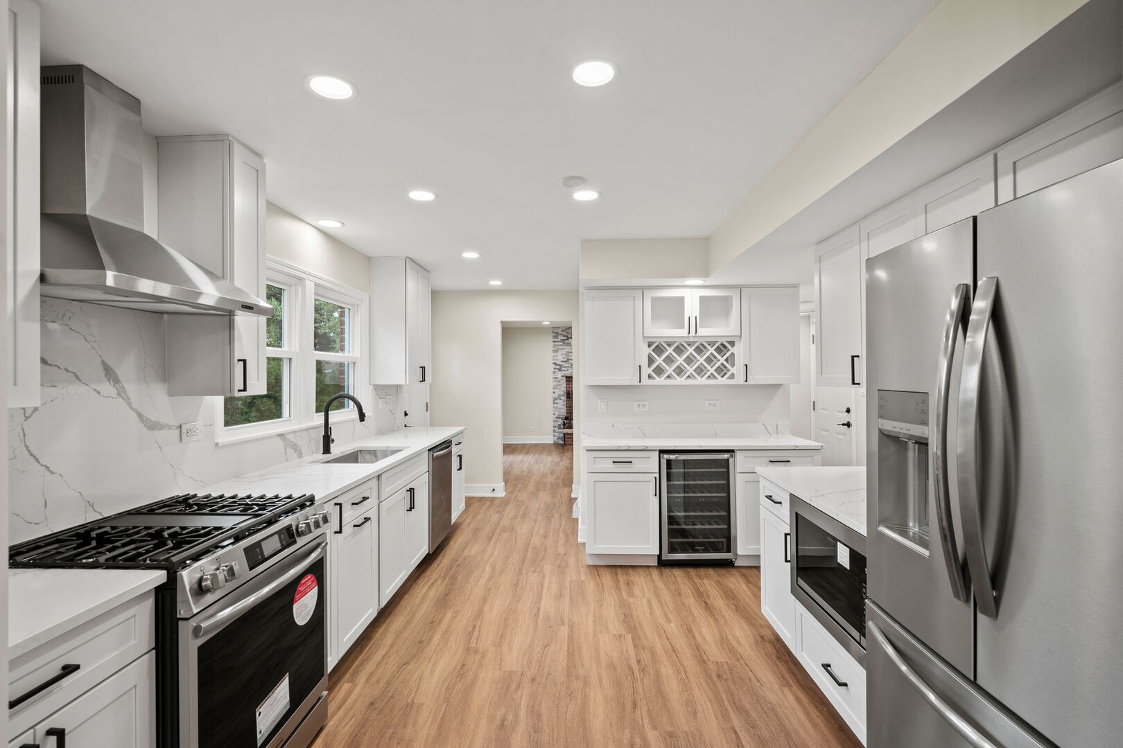SPECIAL NOTICE 5 CAR GARAGE ON This colonial home has 4 bedrooms, 2.5 bathrooms, and a CUSTOM AND modern renovation with luxurious vinyl plank flooring on the first floor and refinished hardwood on the second. Upgrades include new windows, recessed lighting, and stylish doors. The spacious living room flows into the dining area and brand-new kitchen with white cabinets, stainless steel appliances, and quartz countertops. Additional living space in the cozy family room with wood burning (gas starter) fireplace. Please note there are 2 laundry areas as well (including one on the second floor). The good-sized primary suite has a beautifully re-done bathroom and an outfitted walk-in closet. Outside, there’s new landscaping, a concrete patio, a 2-car attached garage with epoxy floor, and a detached 3 car garage. Located on a charming tree-lined street in Woodview Manor subdivision, near shopping and Metra train. The perfect blend of modern amenities and classic charm.