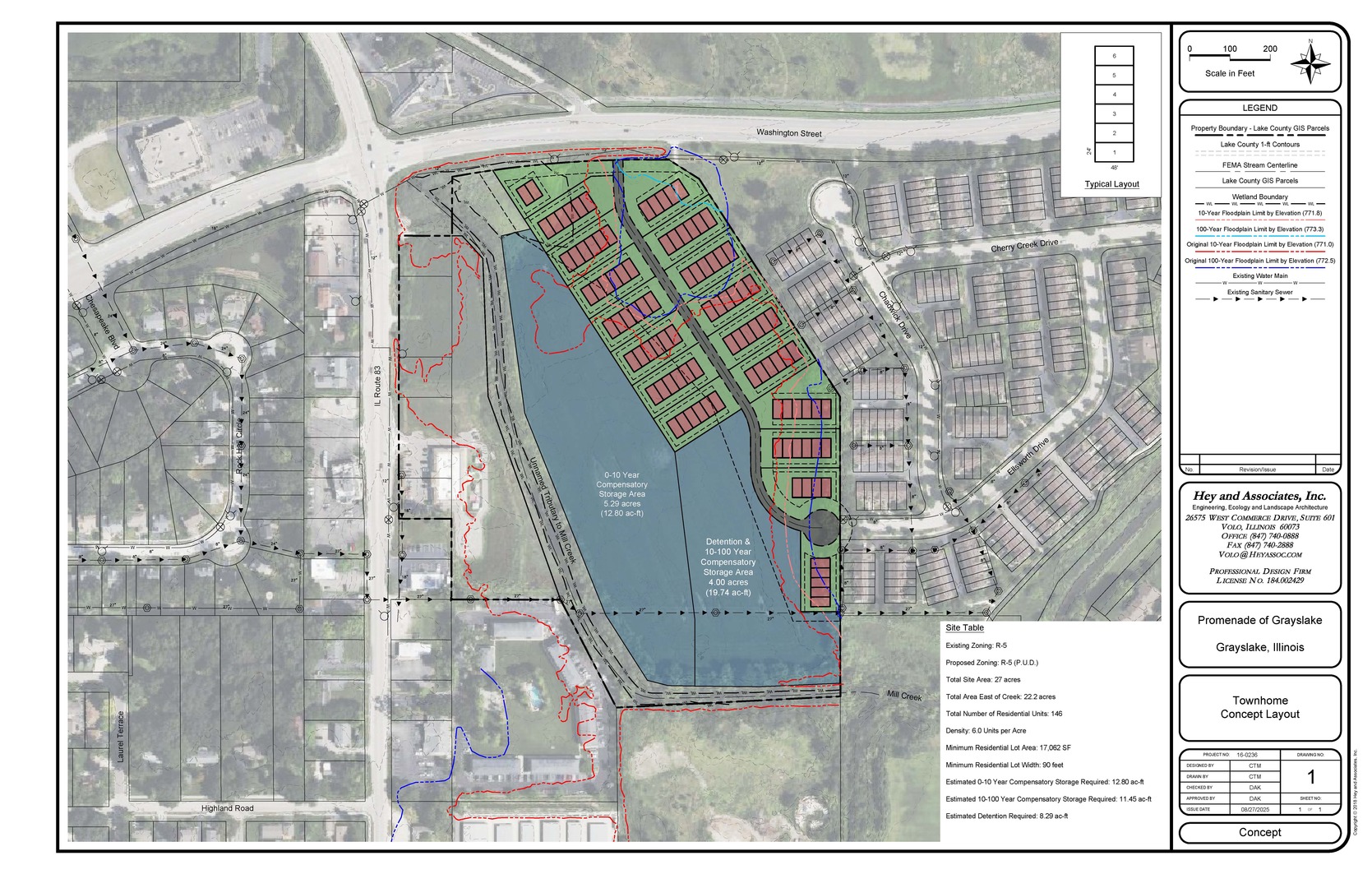 Attention Developers: Grayslake infill site is ready for new construction single family or townhome product. This approximately 22 acre parcel is primarily zoned R5 and partially zoned SCB. Adjoining Cherry Creek Townhome Subdivision has access road already stubbed into the site with possible additional access off Washington Street. Preliminary site plans have been prepared by Hey and Associates. Sewer and water nearby. Recent area improvements include Washington Street RR underpass west of Lake Street, Washington Street bike/pedestrian sidewalks, T5 DATA Center adjoining Medline. Meijer’s and Jewel Foods nearby. This site is in Grayslake School district. Lake County Forest Preserve trail across the street and Grayslake Village Center is a short drive away.