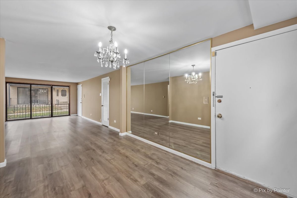 Welcome to this beautiful and well maintained first floor spacious 1 bedroom condo offering both comfort and convenience. The open-concept living room features large sliding doors that lead to your private outdoor patio. The unit is freshly painted with new vinyl flooring throughout. The kitchen provides plenty of cabinet space for storage. Laundry and additional storage are conveniently located directly across the hall. This condo is located in a prime location close to shopping, dining, and public transit. Move-in ready! Heat, water, and gas are included in the monthly assessment. Unit is being sold AS-IS.
