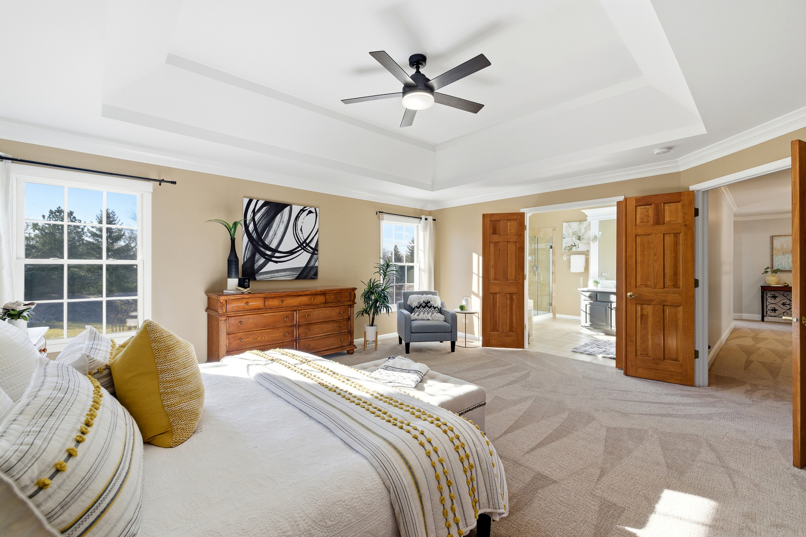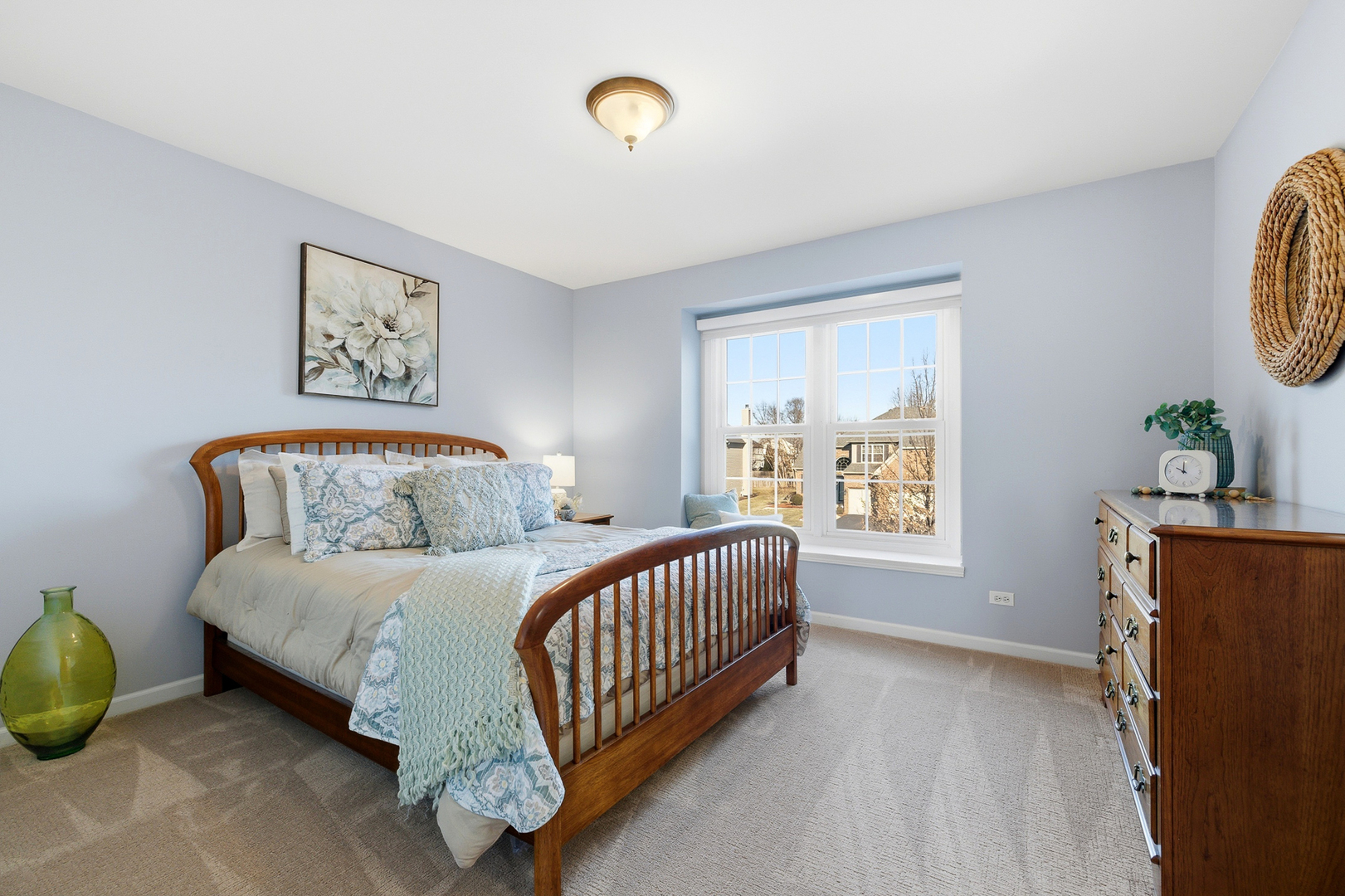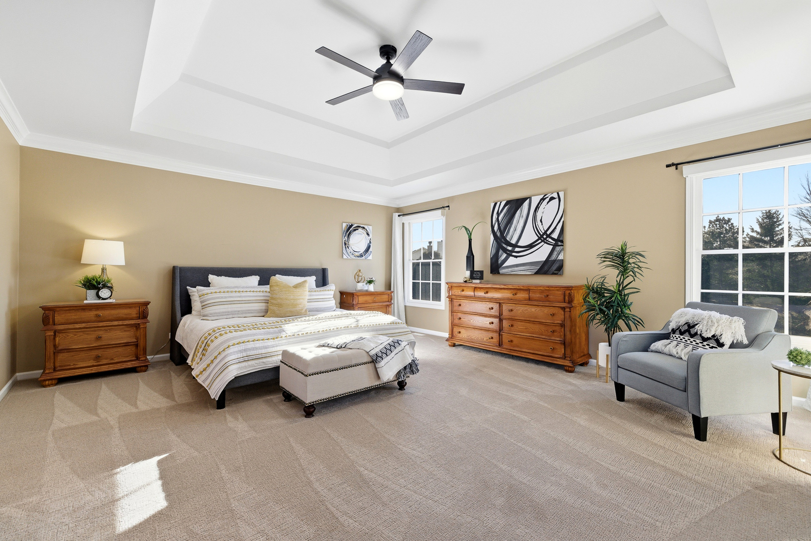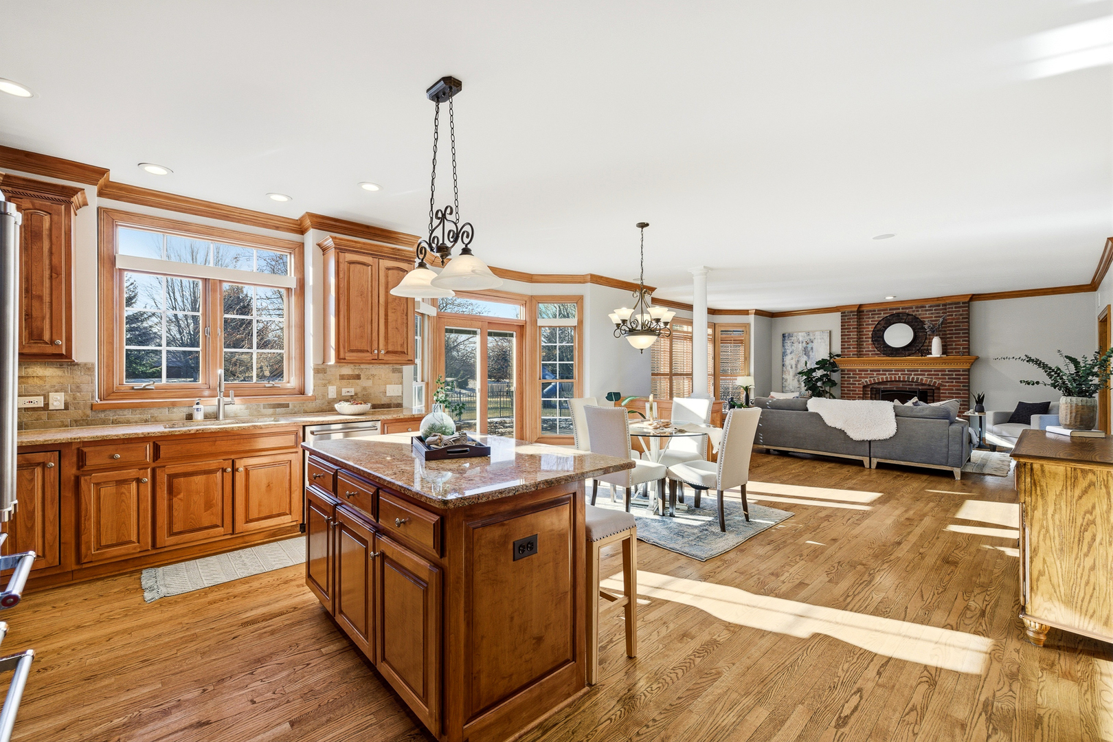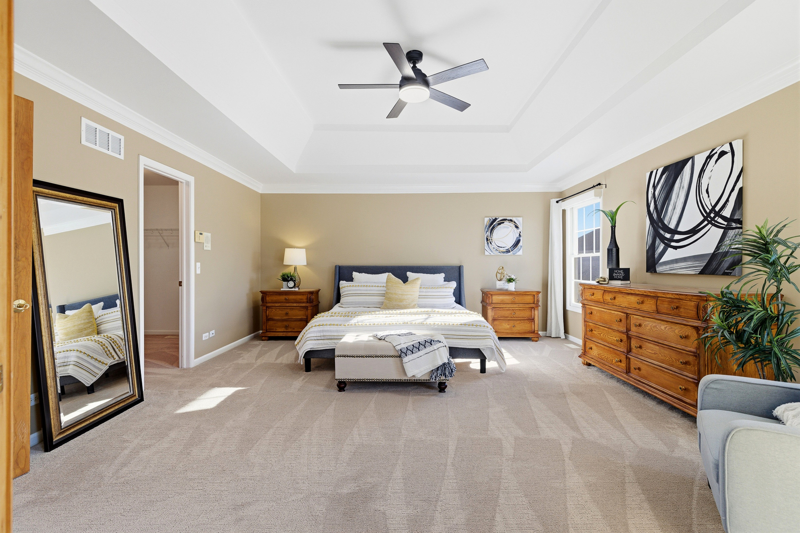 Former Builder’s Model with 4,200 Sq Ft of Finished Living Space! This stunning 6-bedroom, 2.5-bath home offers exceptional design, space, and craftsmanship throughout. The striking brick and stone exterior welcomes you into a dramatic two-story foyer accented by crown moulding. The open floor plan features hardwood floors in the foyer, kitchen, and family room, along with 9-foot ceilings and abundant natural light. The family room is anchored by a gas-start, wood-burning fireplace-perfect for cozy evenings. The expansive kitchen is a chef’s dream with 42″ solid wood cabinetry, under-cabinet lighting, granite countertops, travertine backsplash, recessed lighting, a large island with seating, dry bar area, and KitchenAid stainless steel appliances including a double oven. A generous eating area completes the space. The main level also offers a private den with new carpet, and maple wainscoting and crown moulding. First floor laundry with sink and closet. Many freshly painted rooms throughout the home. Upstairs, the luxurious primary suite impresses with a tray ceiling, an incredible 30′ walk-in closet, and a spa-like bath featuring new quartz countertops, a skylight, soaking tub, separate shower, dual vanities, and a private water closet. Three additional well-sized bedrooms-each with walk-in closets-and a hall bath with quartz counters and vaulted ceiling complete the second level. The finished basement expands the living space with new carpet, a massive recreation room, two spacious rooms ideal for bedrooms, fitness, or flex space, and a large storage area. Enjoy outdoor living in the professionally landscaped backyard featuring a brick paver patio, sprinkler system, fenced ornate garden enclosure, and additional open yard space beyond. Backyard goes all the way to the berm. Major updates include furnace and A/C (2019). Ideally located near lakes, walking paths, shopping, and dining-this home truly has it all. (Agent related to seller)