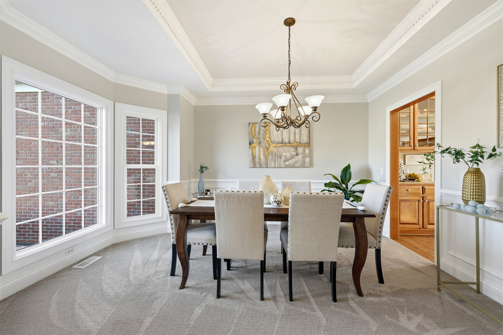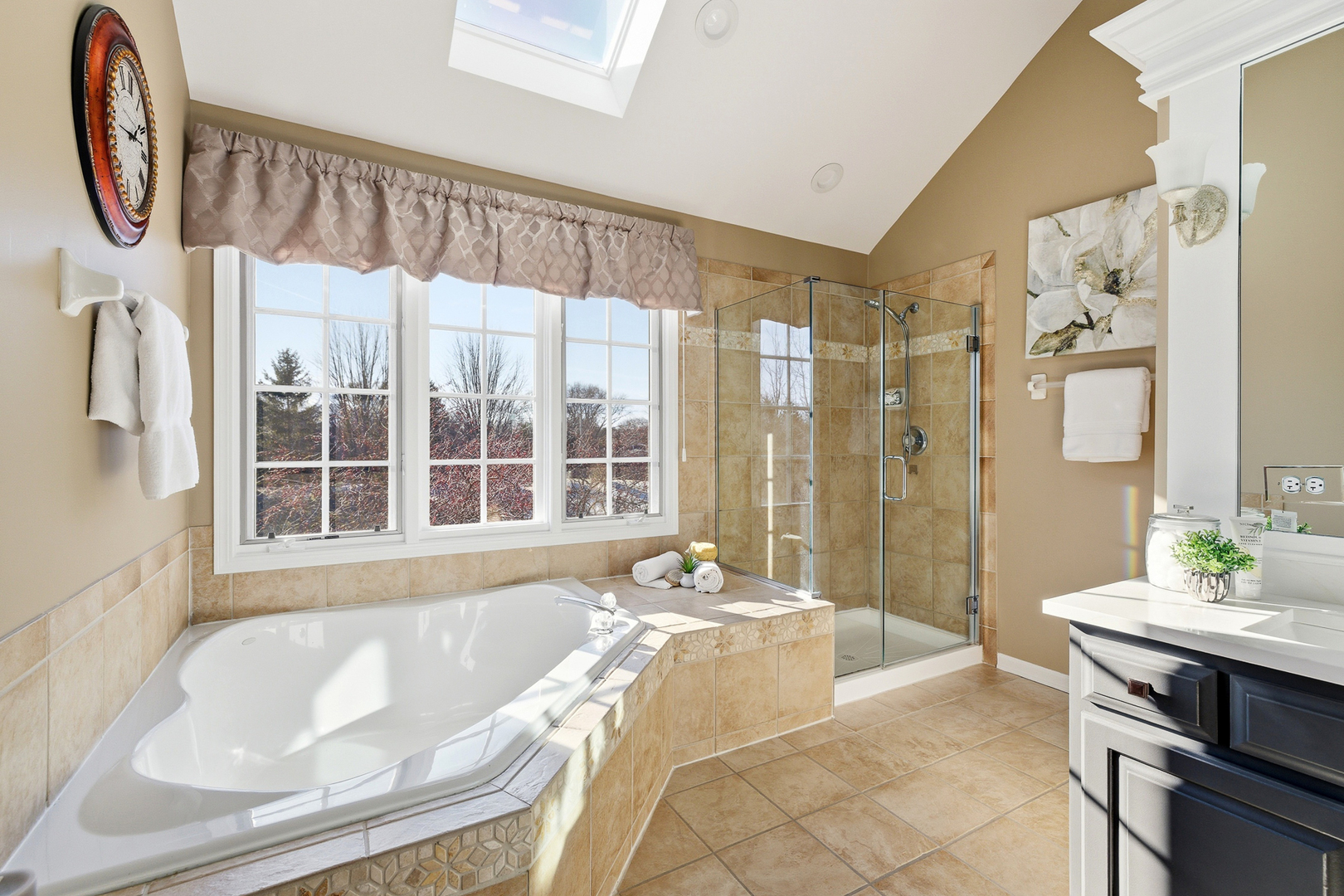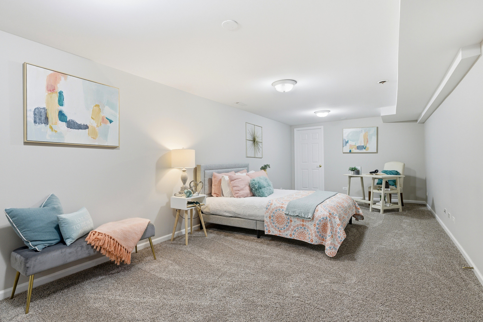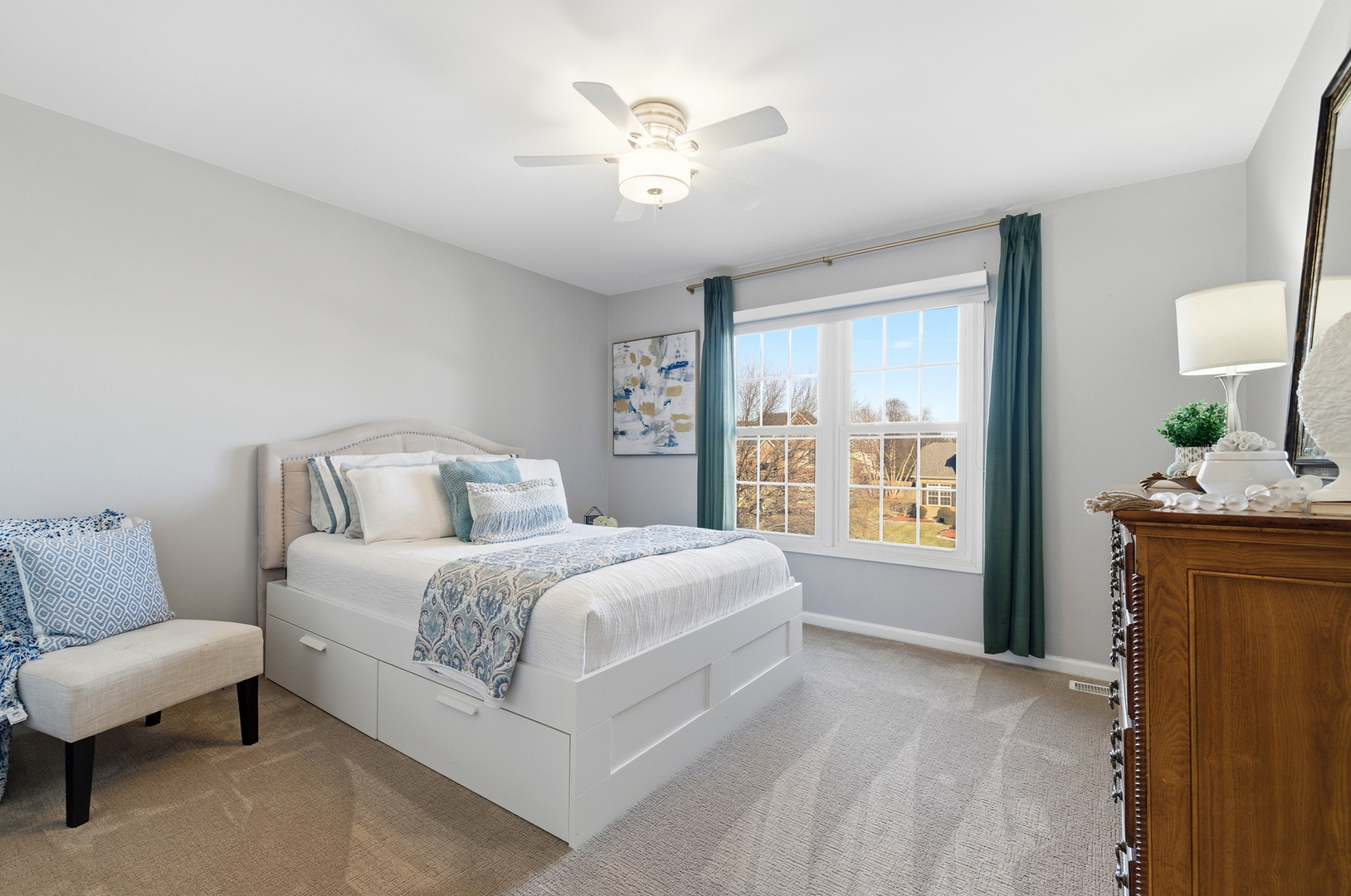 Former Builder’s Model with 4,200 Sq Ft of Finished Living Space! This stunning 6-bedroom, 2.5-bath home offers exceptional design, space, and craftsmanship throughout. The striking brick and stone exterior welcomes you into a dramatic two-story foyer accented by crown moulding. The open floor plan features hardwood floors in the foyer, kitchen, and family room, along with 9-foot ceilings and abundant natural light. The family room is anchored by a gas-start, wood-burning fireplace-perfect for cozy evenings. The expansive kitchen is a chef’s dream with 42″ solid wood cabinetry, under-cabinet lighting, granite countertops, travertine backsplash, recessed lighting, a large island with seating, dry bar area, and KitchenAid stainless steel appliances including a double oven. A generous eating area completes the space. The main level also offers a private den with new carpet, and maple wainscoting and crown moulding. First floor laundry with sink and closet. Many freshly painted rooms throughout the home. Upstairs, the luxurious primary suite impresses with a tray ceiling, an incredible 30′ walk-in closet, and a spa-like bath featuring new quartz countertops, a skylight, soaking tub, separate shower, dual vanities, and a private water closet. Three additional well-sized bedrooms-each with walk-in closets-and a hall bath with quartz counters and vaulted ceiling complete the second level. The finished basement expands the living space with new carpet, a massive recreation room, two spacious rooms ideal for bedrooms, fitness, or flex space, and a large storage area. Enjoy outdoor living in the professionally landscaped backyard featuring a brick paver patio, sprinkler system, fenced ornate garden enclosure, and additional open yard space beyond. Backyard goes all the way to the berm. Major updates include furnace and A/C (2019). Ideally located near lakes, walking paths, shopping, and dining-this home truly has it all. (Agent related to seller)