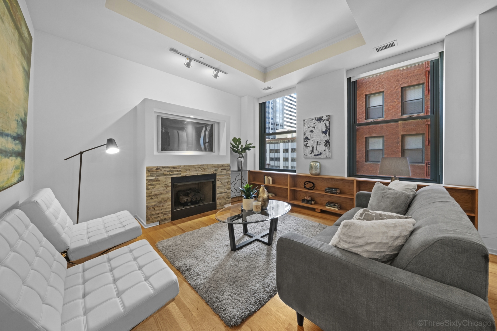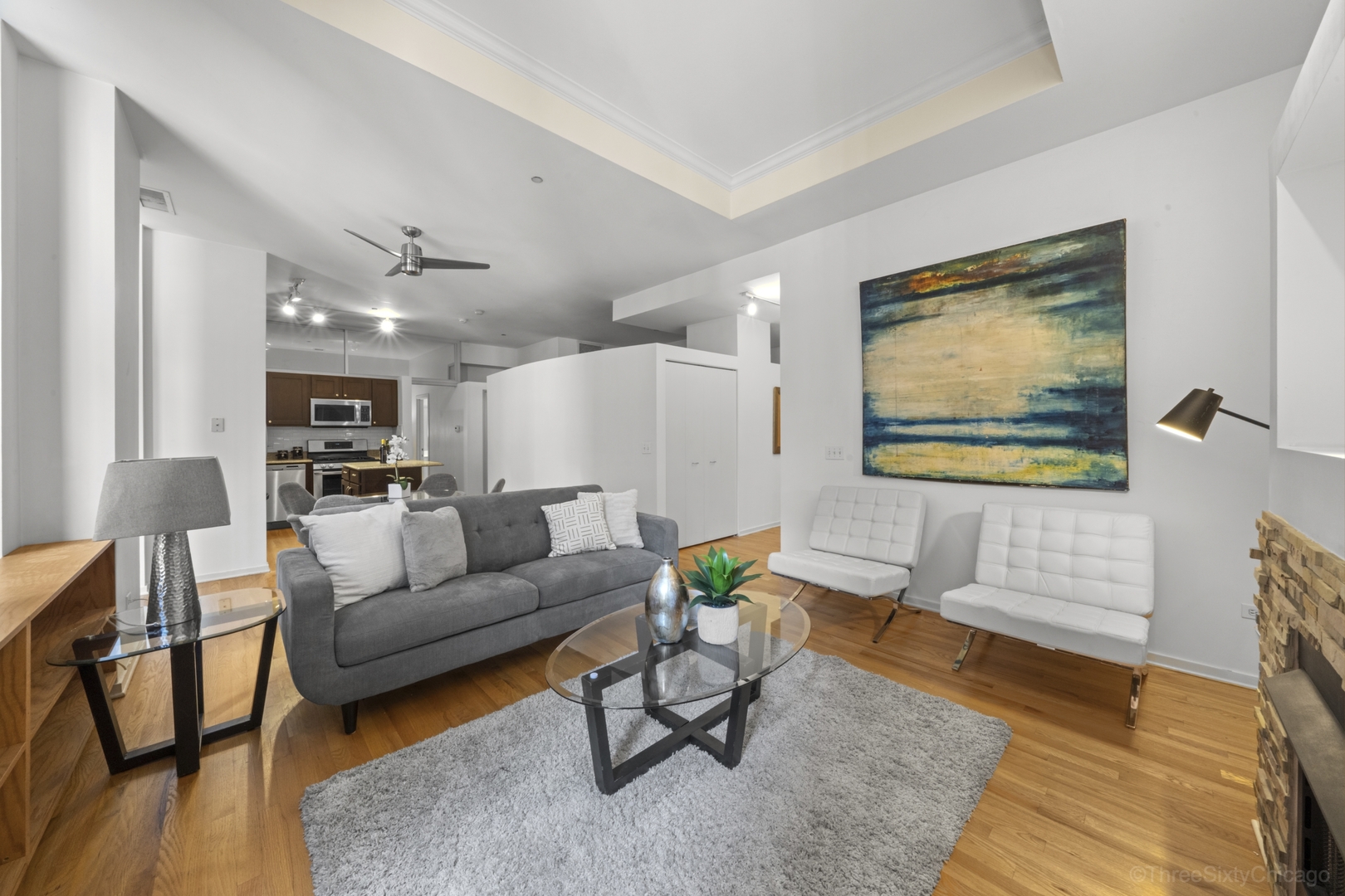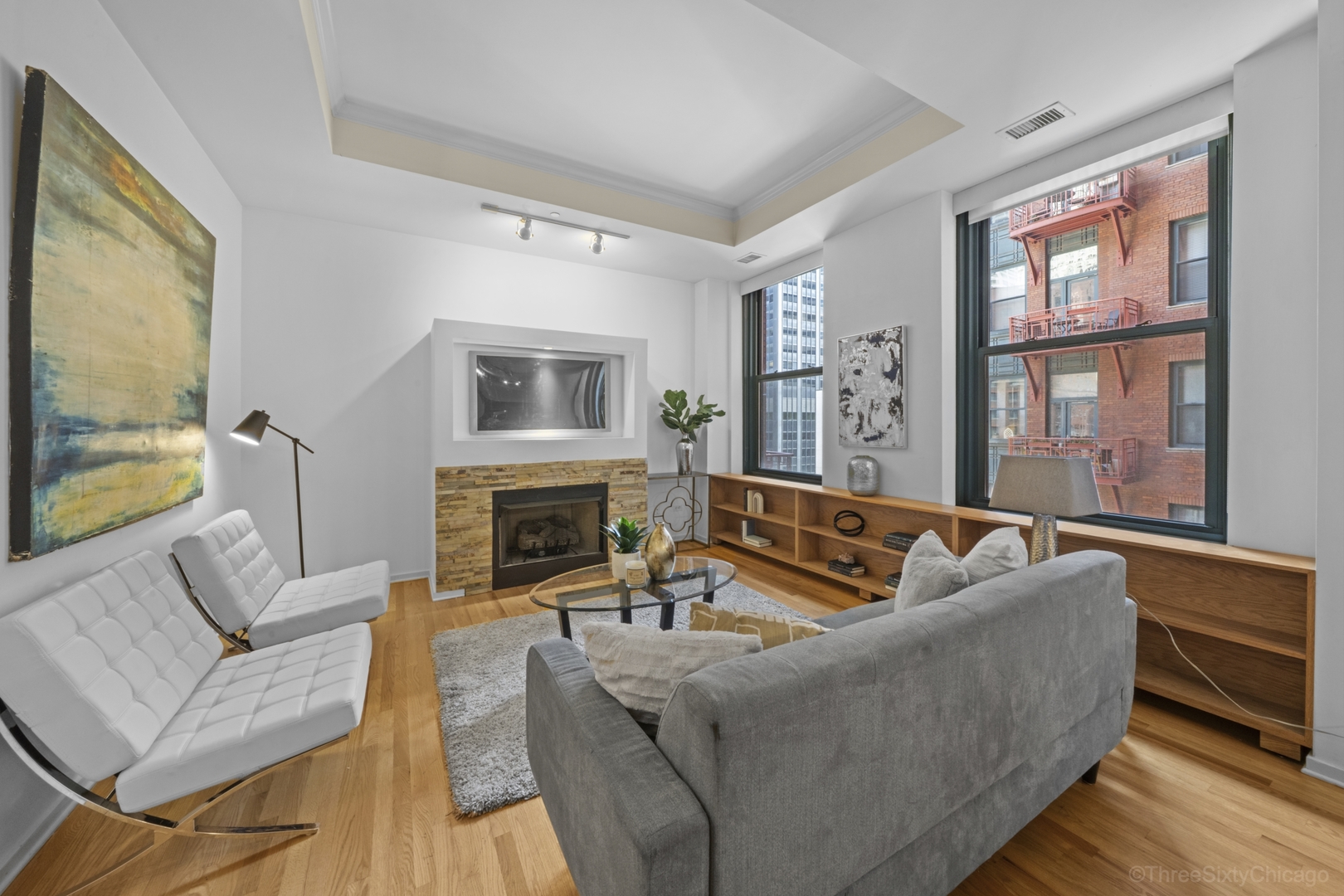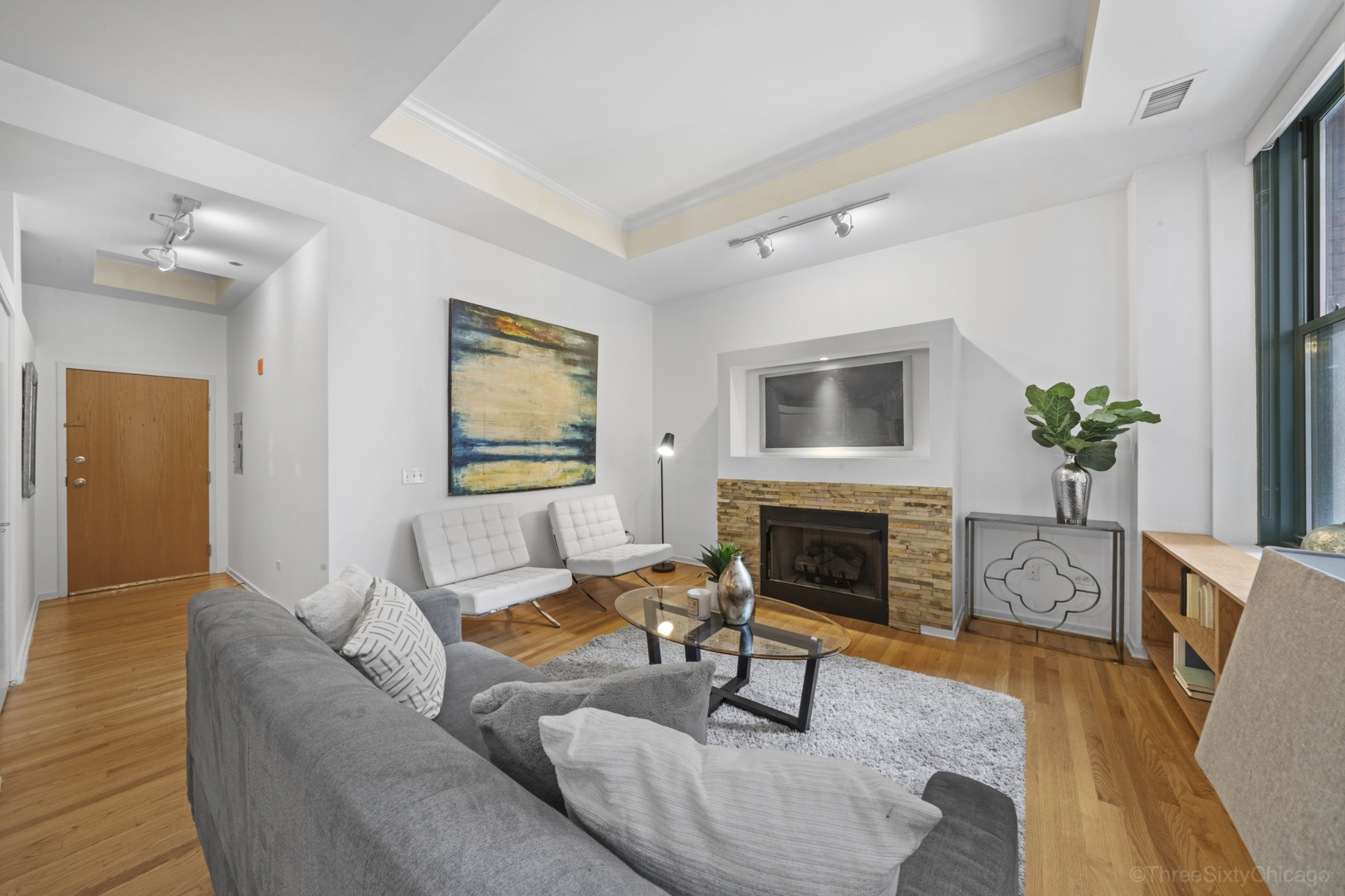 Beautiful, sunny 2 bedroom 2 bath with hardwood floors throughout. Open floor plan. Granite counters and stainless appliances in kitchen. Fireplace. South facing windows. In-unit laundry. Fully enclosed master bedroom suite. Full amenity building with 24hr door staff, roof deck, exercise room, business center. Walkable to the great city life of Chicago: restaurants, theatre, movies, libraries, shopping, parks, museums – and the great Lake. Go Home Happy!