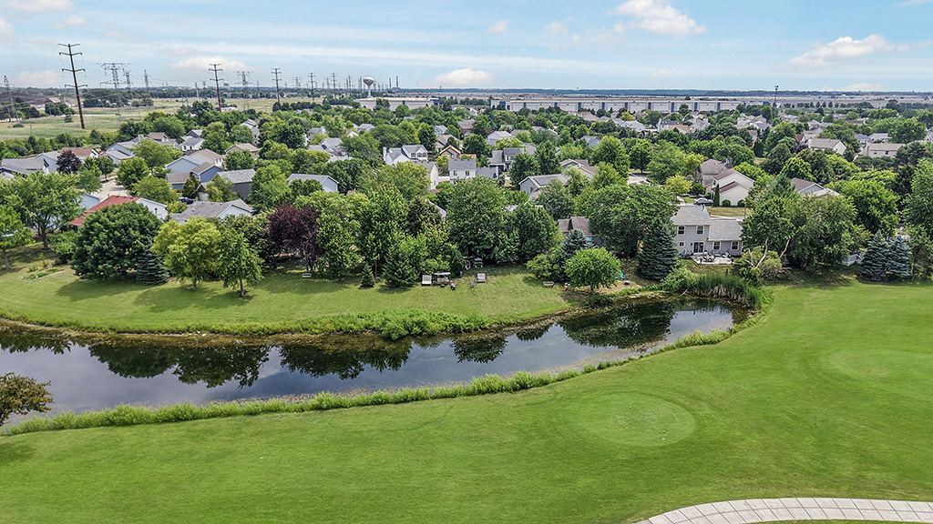 Situated on a premium golf course lot that backs to a serene pond, nestled within the desirable Lakewood Falls community. Lakewood Falls offers year-round events such as fireworks, a visit with Santa, and an Easter egg hunt. The exterior of the home features blue window shutters complemented by blossoming landscape. Inside, the highly functional floor plan is filled with natural sunlight and new luxury laminate flooring throughout. The formal living room and dining room are ideal for hosting family gatherings. The beautifully updated kitchen includes painted cabinetry, hardware, stainless steel appliances, and a quaint eat-in area. The kitchen and family room flow seamlessly which is ideal for entertaining and the family room has a stunning brick fireplace. The second level offers a spacious master retreat with a fully updated bathroom. Two additional bedrooms on this level have ample closet space and share a full bathroom. The basement offers potential for a fourth bedroom, playroom, or office, along with a laundry area and a massive crawl space for extra storage. The tranquil backyard includes an expansive brick patio, pond views, and golf course views. This home is perfect for any buyer seeking a great location and amenities. Updates include; Water Heater (2025), Kitchen appliances, Microwave (2024), Fridge (2022), Sump Pump (2021), HVAC systems, Humidifer, laminate flooring, Washer & Dryer (2020), Painted kitchen cabinetry hardware (2019), Master bath remodel and lighting throughout (2018).