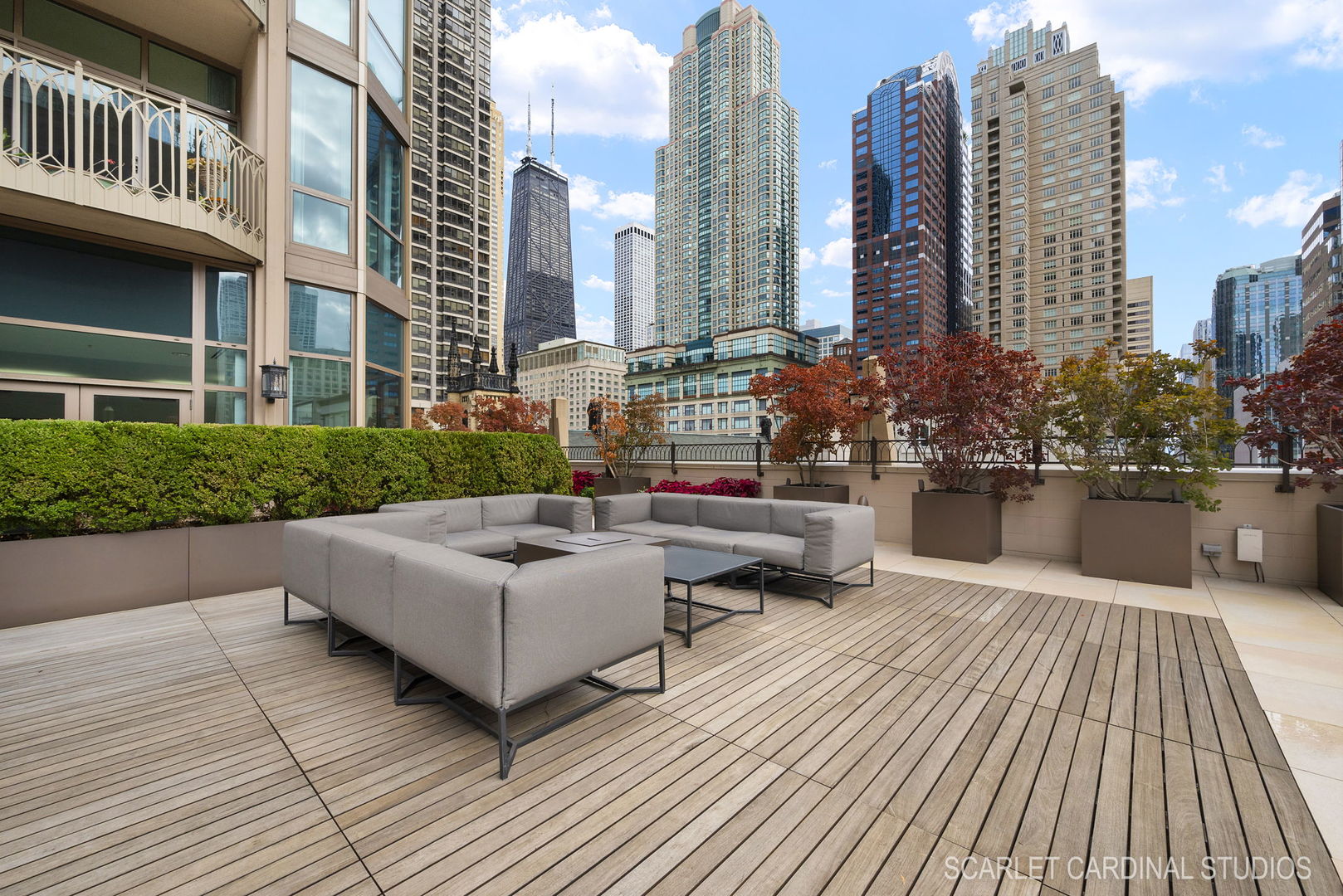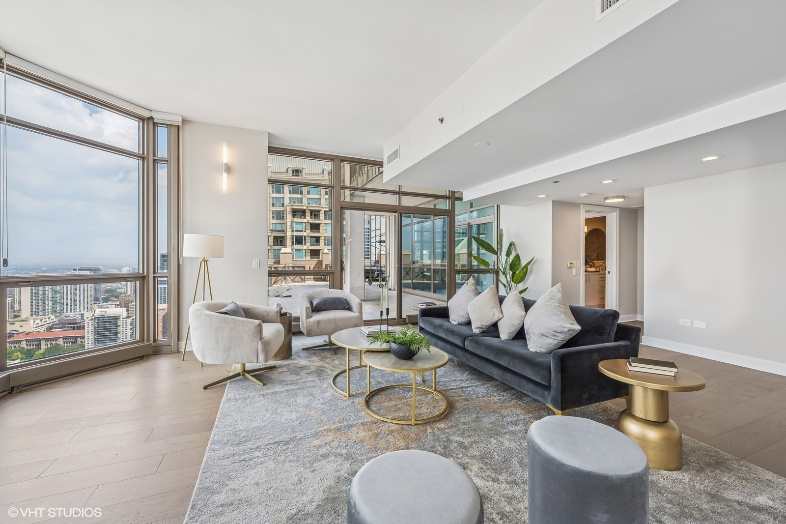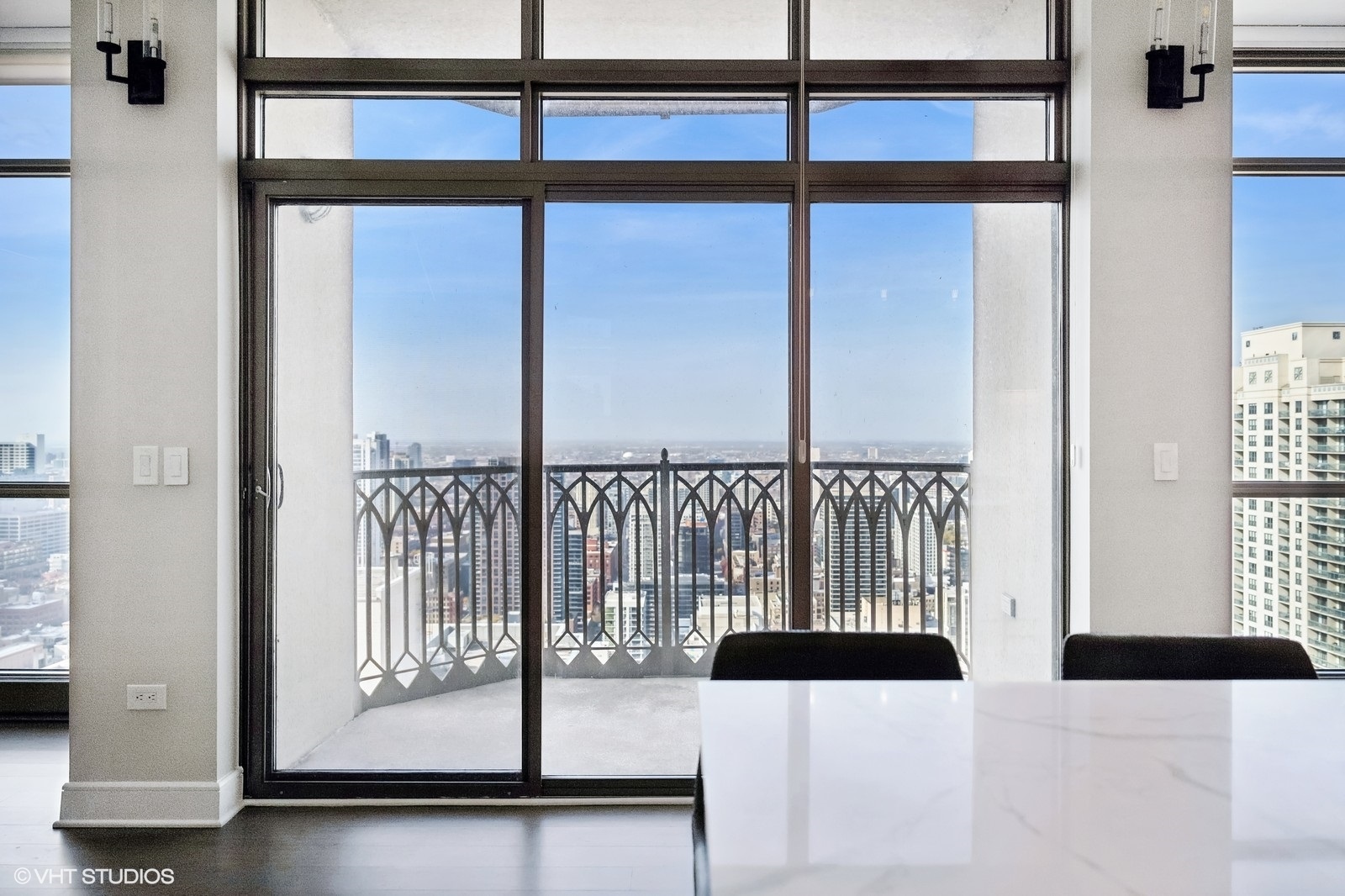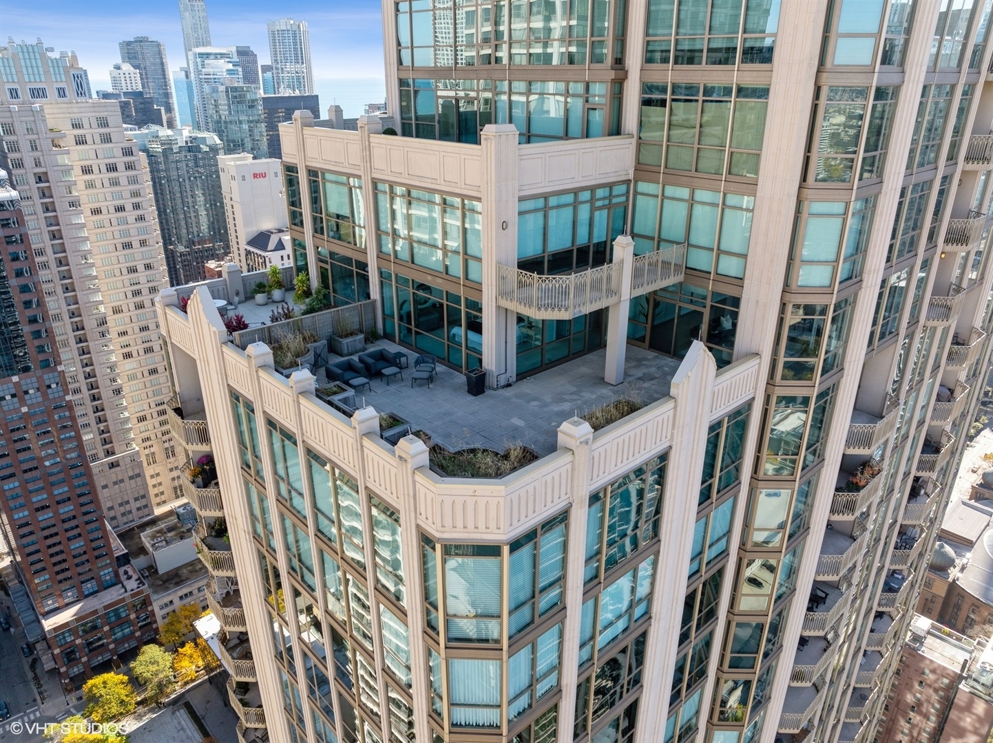 Unmatched LUXURY in the Heart of the Cathedral District. Welcome to an extraordinary PENTHOUSE RESIDENCE in the prestigious PINNACLE BUILDING-a half-floor home that blends sophisticated design with sweeping, unobstructed skyline views. This ONE-OF-A-KIND property offers TWO EXPANSIVE TERRACES AND A PRIVATE BALCONY, creating over 1,900 SQUARE FEET OF OUTDOOR LIVING SPACE, 43 floors above the city. A Grand First Impression as you enter through a gracious foyer with CUSTOM INLAY TILE and an elegant tray ceiling, setting the stage for the LIGHT FILLED, open-concept interiors. The dining and family rooms feature FLOOR-TO-CEILING WINDOWS, soaring 10′ ceilings, and a GAS FIREPLACE. From here, step onto the sprawling 41′ x 39′ MAIN TERRACE-complete with IRRIGATION AND ELECTRICAL-ideal for an elevated garden retreat, private entertaining, or simply taking in the panoramic views. The PRIMARY BEDROOM is a sanctuary, featuring two walk-in closets and a spa-inspired ensuite with radiant heated floors, a heated towel rack, soaking tub, and walk-in shower. Direct access to the main terrace allows you to start and end your day surrounded by breathtaking views. The designer CHEF KITCHEN is equipped with sleek light-gray cabinetry, quartz countertops, and a large center island. HIGH-END APPLIANCES include a Wolf oven, Sub-Zero refrigerator, and Miele dishwasher. A sunny breakfast room and beverage bar with wine fridge provide casual elegance, while the SEMI-CIRCLE BALCONY offers a serene spot for morning coffee above the city. Two additional ensuite bedrooms, each with 10′ ceilings and stunning views, ensure privacy and comfort. One suite opens directly to the 21′ x 18′ SECOND TERRACE, perfect for hosting guests or creating a private outdoor escape. Living at the Pinnacle means enjoying a wealth of world-class amenities. Residents have access to an indoor pool and whirlpool, fully renovated cardio and strength-training gyms, and relaxing steam and sauna rooms. An expansive outdoor sundeck is equipped with grills and a fire pit, perfect for gatherings under the city lights. For pet lovers, there’s a PRIVATE DOG WALK AND PLAY AREA, while entertainment options include a theater room, a hospitality suite with terrace, and private wine lockers. Additional conveniences include bike storage, a personal storage room, and two deeded parking spaces, with the option to purchase a third. PRIME LOCATION-Just blocks from Northwestern Memorial Hospital, Northwestern Law & Medical School, Lurie Children’s Hospital, Michigan Avenue shopping, Ohio Street Beach, and acclaimed dining. This penthouse delivers UNPARALLELED INDOOR-OUTDOOR LIVING in one of the city’s most sought-after addresses. Opportunities like this are rare-experience the Pinnacle lifestyle today.