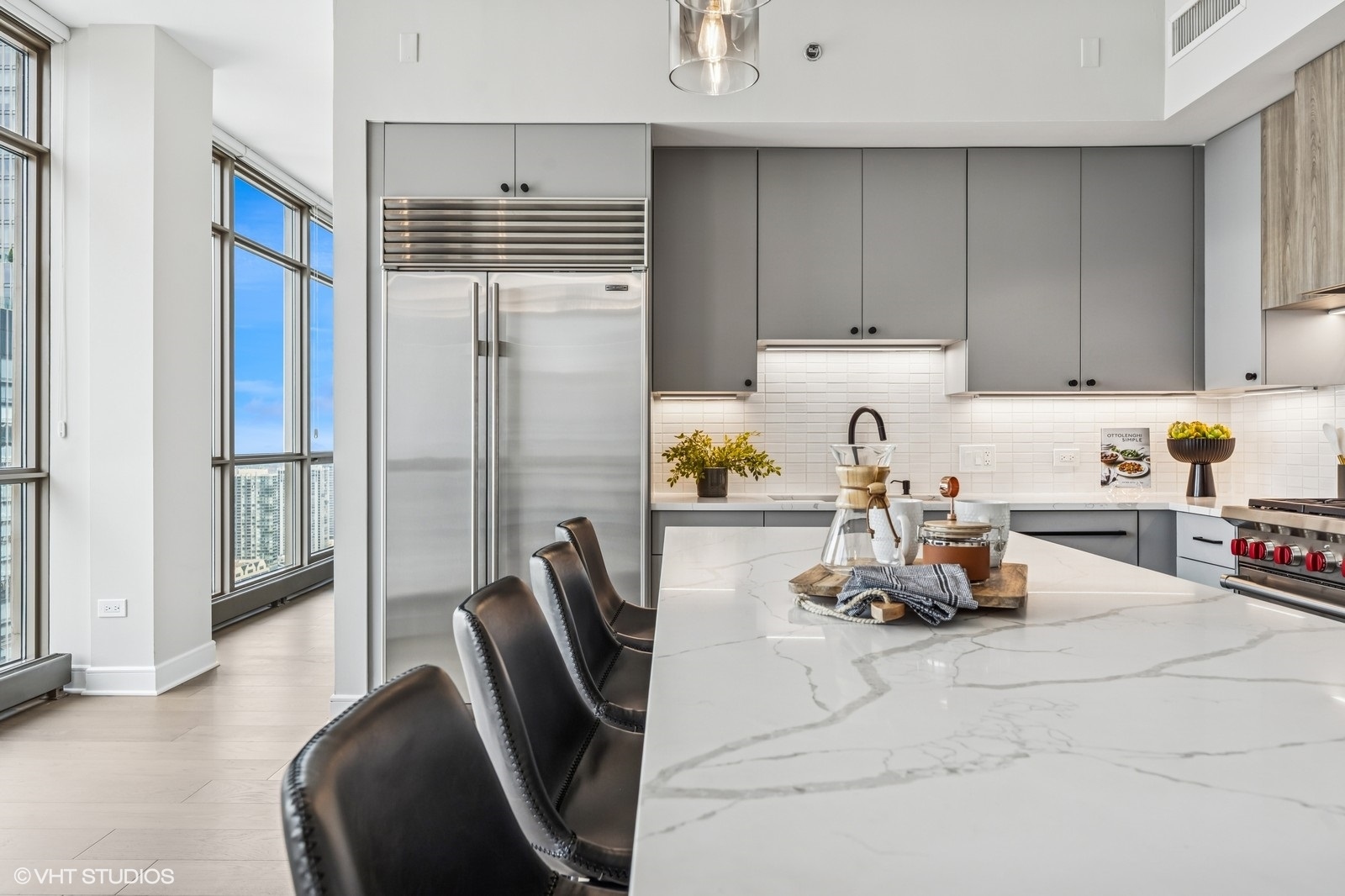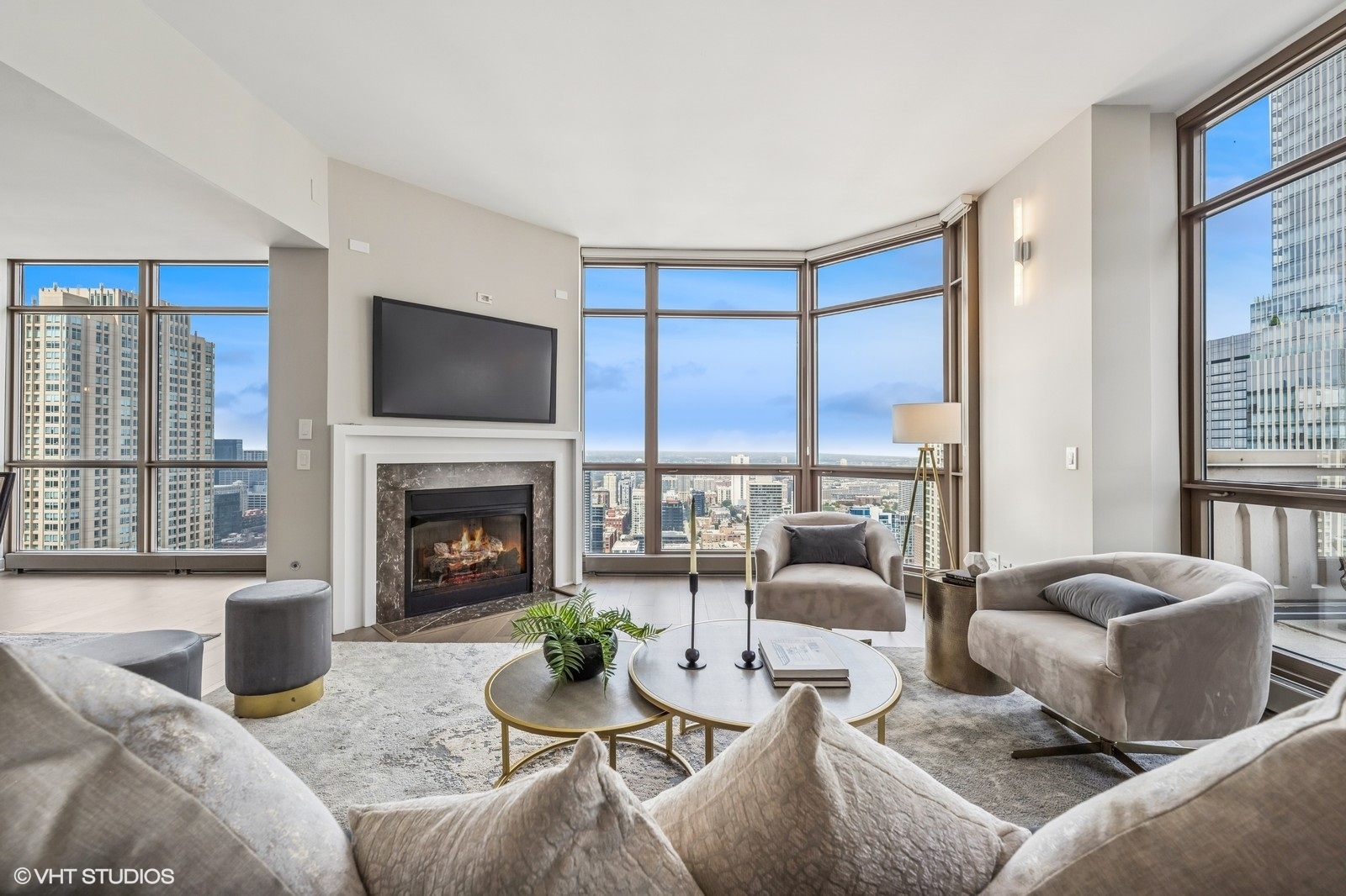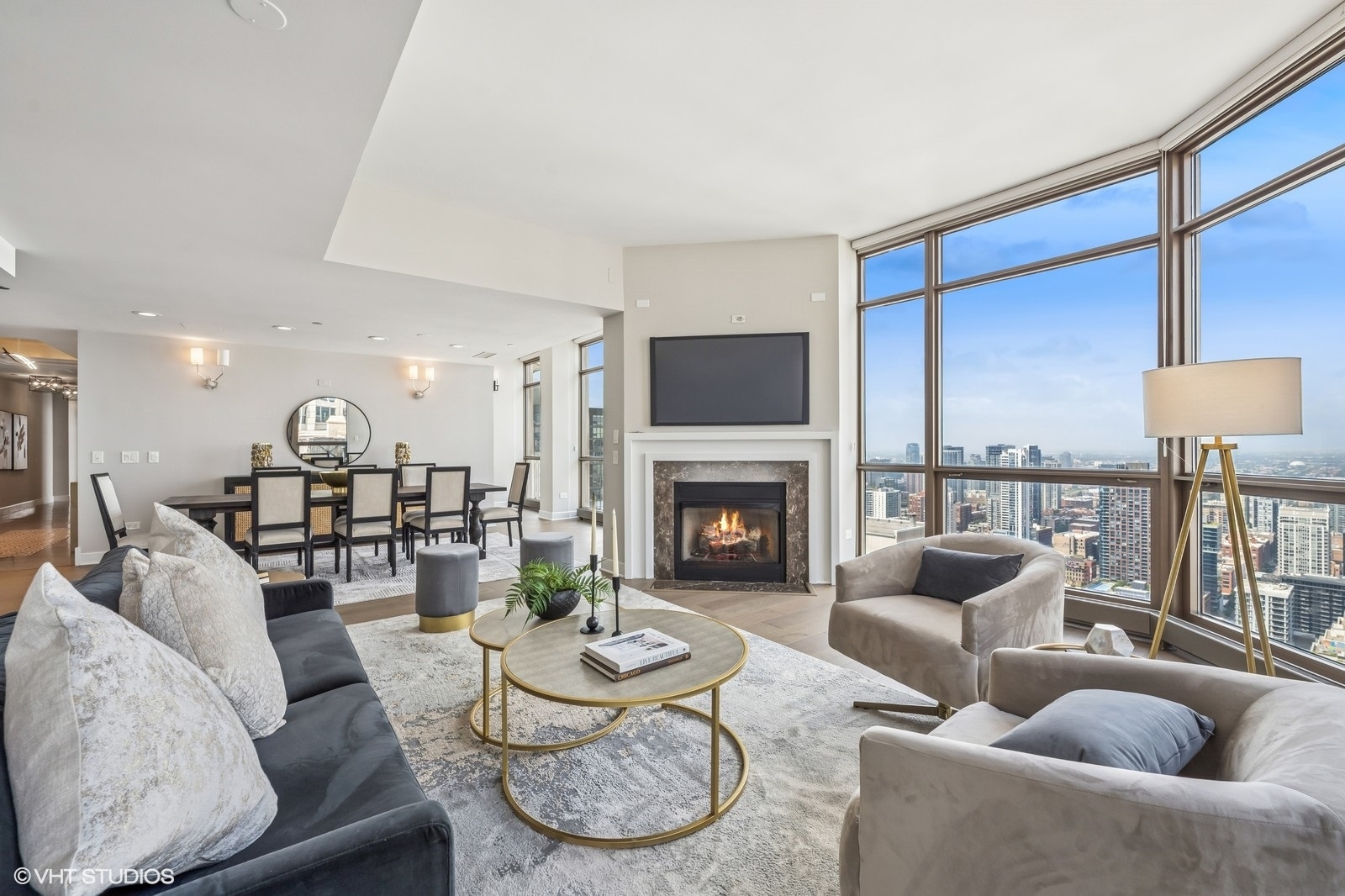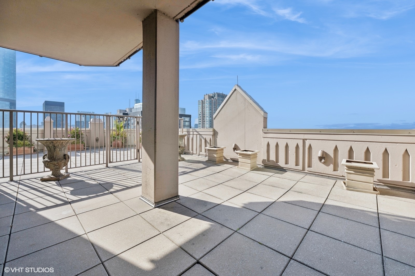 Unmatched LUXURY in the Heart of the Cathedral District. Welcome to an extraordinary PENTHOUSE RESIDENCE in the prestigious PINNACLE BUILDING-a half-floor home that blends sophisticated design with sweeping, unobstructed skyline views. This ONE-OF-A-KIND property offers TWO EXPANSIVE TERRACES AND A PRIVATE BALCONY, creating over 1,900 SQUARE FEET OF OUTDOOR LIVING SPACE, 43 floors above the city. A Grand First Impression as you enter through a gracious foyer with CUSTOM INLAY TILE and an elegant tray ceiling, setting the stage for the LIGHT FILLED, open-concept interiors. The dining and family rooms feature FLOOR-TO-CEILING WINDOWS, soaring 10′ ceilings, and a GAS FIREPLACE. From here, step onto the sprawling 41′ x 39′ MAIN TERRACE-complete with IRRIGATION AND ELECTRICAL-ideal for an elevated garden retreat, private entertaining, or simply taking in the panoramic views. The PRIMARY BEDROOM is a sanctuary, featuring two walk-in closets and a spa-inspired ensuite with radiant heated floors, a heated towel rack, soaking tub, and walk-in shower. Direct access to the main terrace allows you to start and end your day surrounded by breathtaking views. The designer CHEF KITCHEN is equipped with sleek light-gray cabinetry, quartz countertops, and a large center island. HIGH-END APPLIANCES include a Wolf oven, Sub-Zero refrigerator, and Miele dishwasher. A sunny breakfast room and beverage bar with wine fridge provide casual elegance, while the SEMI-CIRCLE BALCONY offers a serene spot for morning coffee above the city. Two additional ensuite bedrooms, each with 10′ ceilings and stunning views, ensure privacy and comfort. One suite opens directly to the 21′ x 18′ SECOND TERRACE, perfect for hosting guests or creating a private outdoor escape. Living at the Pinnacle means enjoying a wealth of world-class amenities. Residents have access to an indoor pool and whirlpool, fully renovated cardio and strength-training gyms, and relaxing steam and sauna rooms. An expansive outdoor sundeck is equipped with grills and a fire pit, perfect for gatherings under the city lights. For pet lovers, there’s a PRIVATE DOG WALK AND PLAY AREA, while entertainment options include a theater room, a hospitality suite with terrace, and private wine lockers. Additional conveniences include bike storage, a personal storage room, and two deeded parking spaces, with the option to purchase a third. PRIME LOCATION-Just blocks from Northwestern Memorial Hospital, Northwestern Law & Medical School, Lurie Children’s Hospital, Michigan Avenue shopping, Ohio Street Beach, and acclaimed dining. This penthouse delivers UNPARALLELED INDOOR-OUTDOOR LIVING in one of the city’s most sought-after addresses. Opportunities like this are rare-experience the Pinnacle lifestyle today.