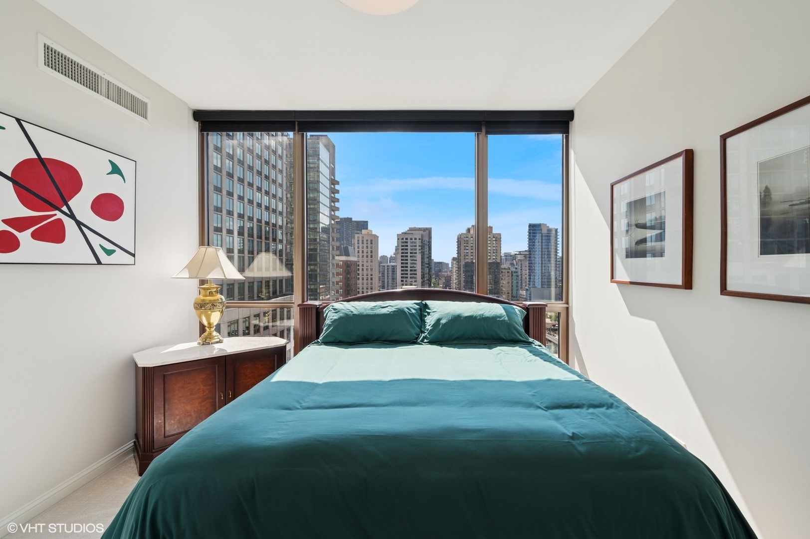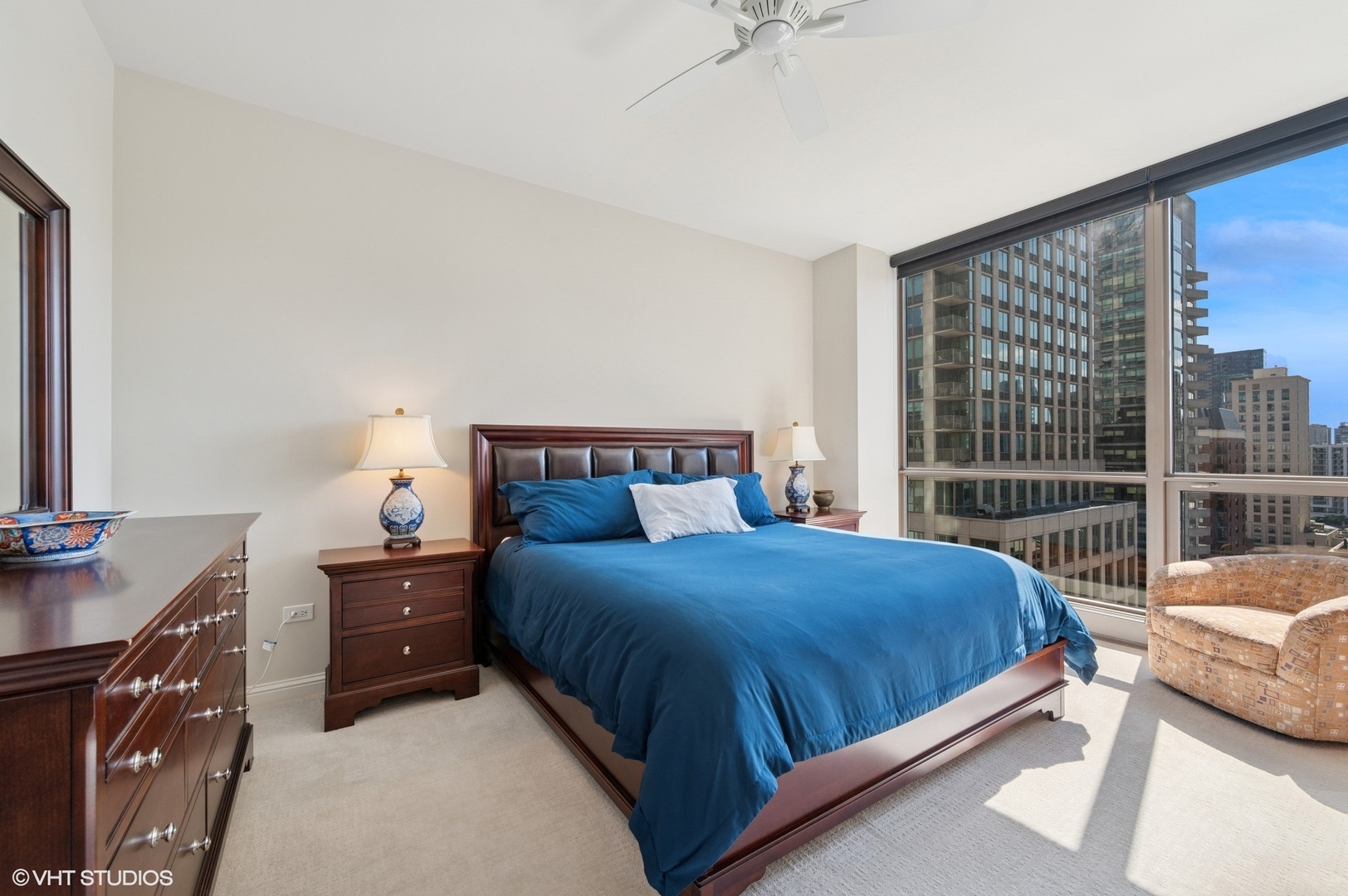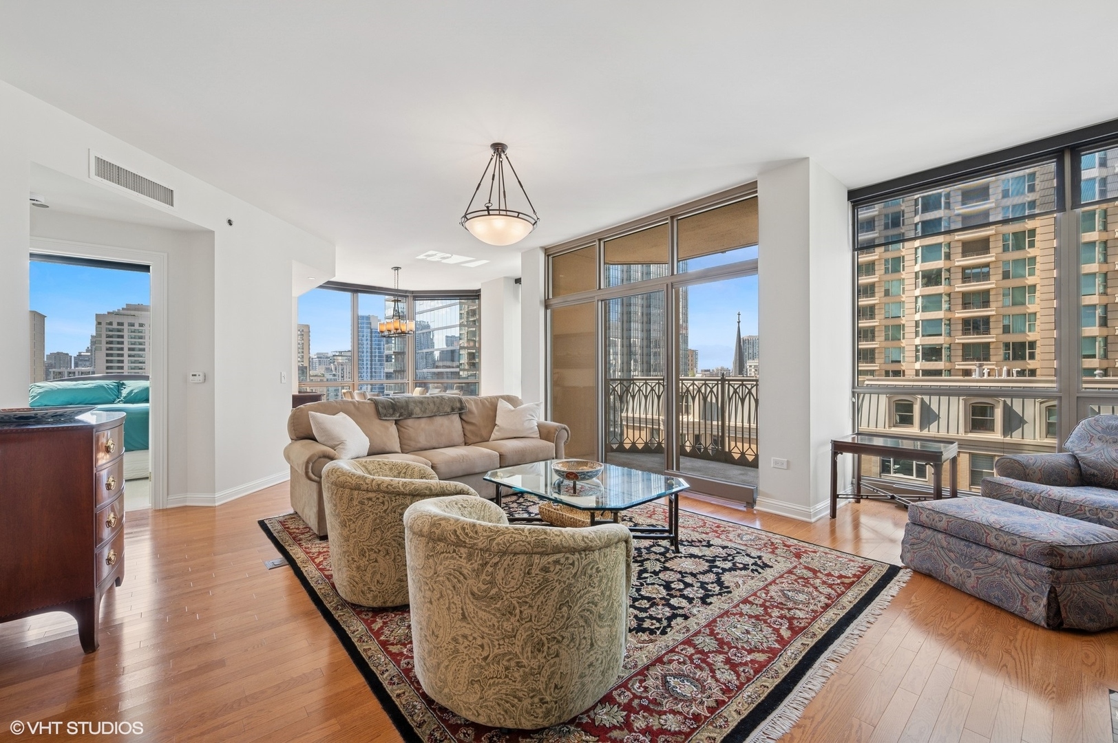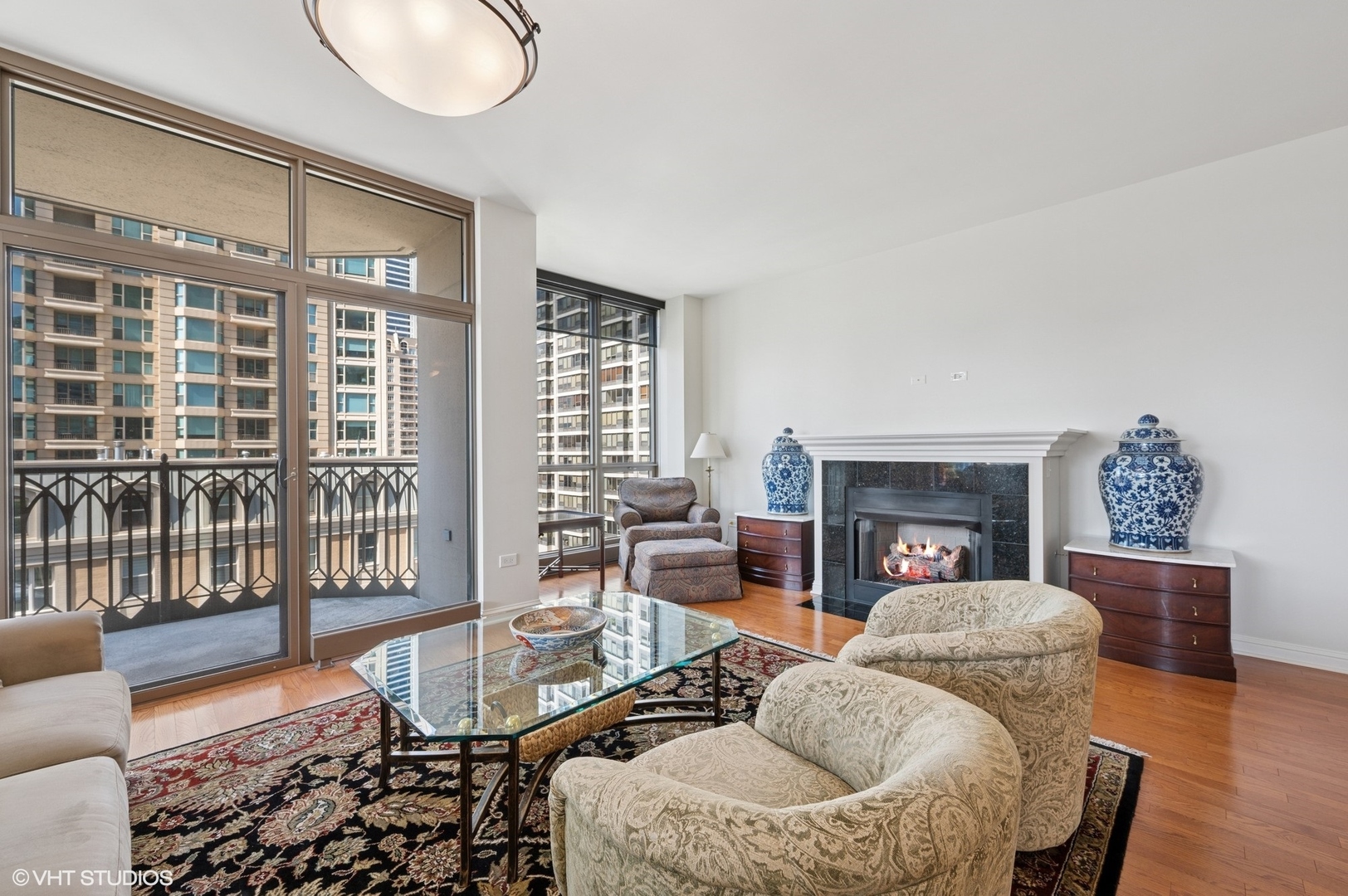 Elegant corner residence at The Pinnacle offering refined city living. This thoughtfully designed split two-bedroom home features high ceilings, beautiful hardwood flooring, and intricate millwork details throughout. The expansive living and dining area is anchored by a stylish fireplace and opens to a private balcony ideal for enjoying morning coffee or evening sunsets. The gourmet Wood-Mode kitchen is appointed with rich custom cabinetry, a breakfast bar, and top-tier finishes. The spacious primary suite boasts a spa-inspired bath with dual sinks, a soaking tub, and a separate glass shower. The second bedroom is highlighted by dramatic floor-to-ceiling windows, filling the space with abundant natural light. Residents enjoy premier amenities including 24-hour door staff, a modern fitness center, lap and resistance pools, and an exclusive private theater.