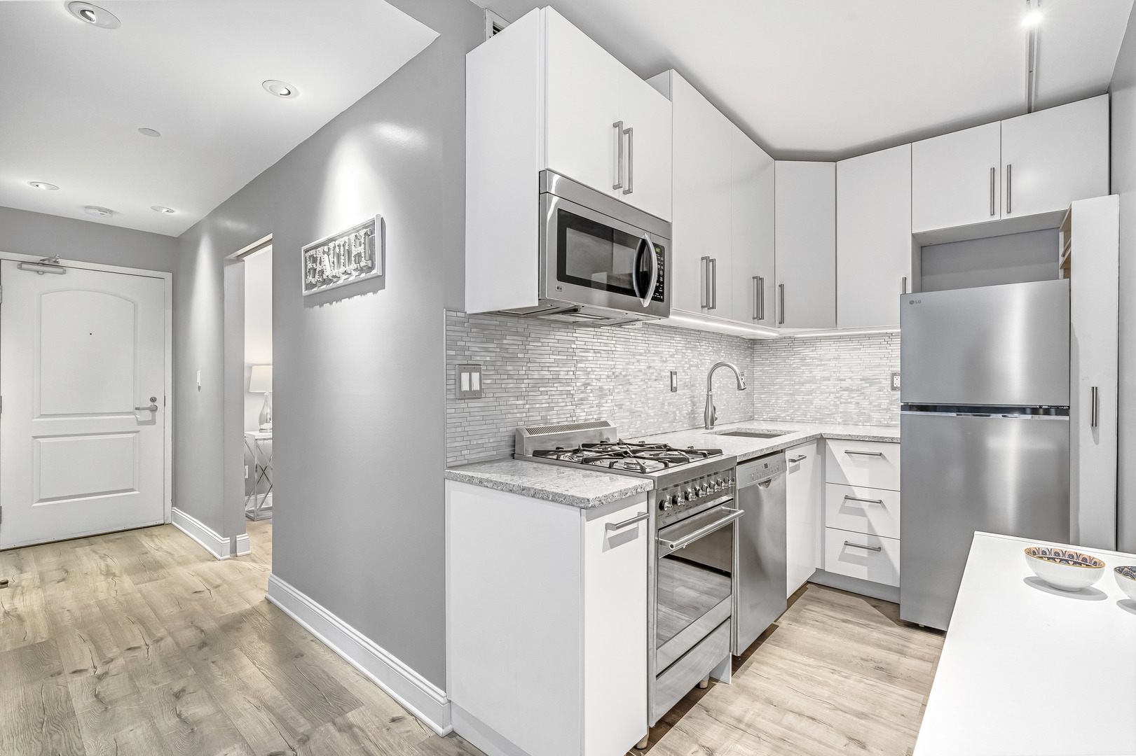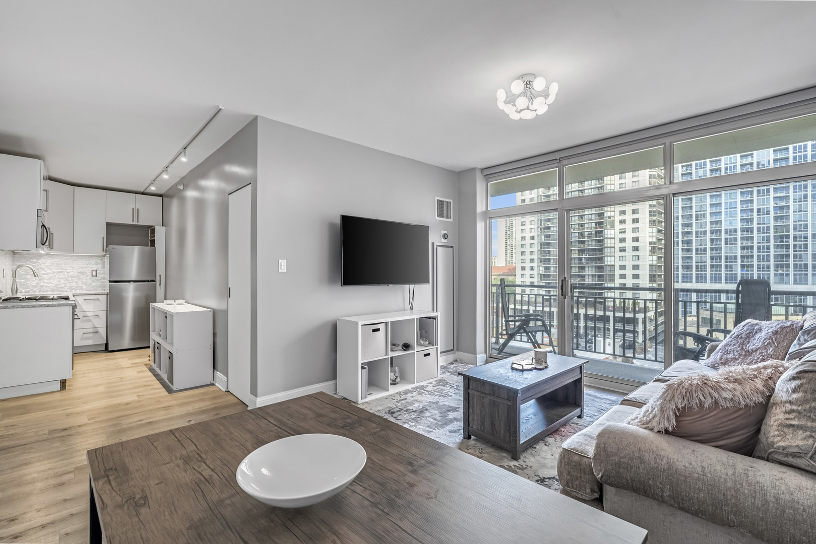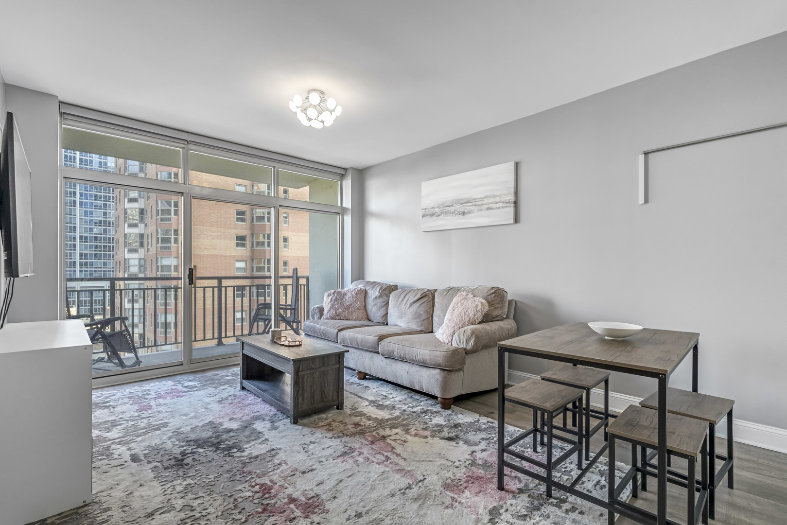 A stylish, updated one bedroom home nestled in a boutique building on a serene, tree lined street in Chicago’s coveted Gold Coast. This bright and inviting condo combines modern finishes with everyday convenience. The open living area features wood laminated flooring, and expansive floor to ceiling windows that lead to a private balcony, perfect for enjoying sweeping city views. The kitchen is thoughtfully designed, offering granite counters, stainless steel appliances, and a chic tile backsplash, thoughtful built-ins-including an armoire and pantry, added to the exceptional storage options throughout. The spa inspired bathroom boasts a floor to ceiling tiled shower, contemporary lighting, a stone backsplash, and a spacious modern vanity. The bedroom, tucked away without exterior windows, creates a quiet, restful retreat perfect for uninterrupted sleep. Additional highlights include in-unit washer & dryer, excellent closet space, smart Nest Thermostat, and a layout that maximizes comfort and usability. Building amenities include 24-hour door staff, a spacious fitness center, business center, community party room with full kitchen, bike storage, Tide dry-cleaning lockers, package receiving room, vending machines, on-site management, and maintenance services. While deeded parking spaces are not available for purchase, rental options are almost always available within the building. Just outside your door, enjoy world-class restaurants, boutique shopping, Whole Foods, Oak Street Beach, the lakefront, Washington Square Park, the Riverwalk, and easy access to the Brown and Purple lines. Experience elevated city living at its finest, schedule your private showing today!!