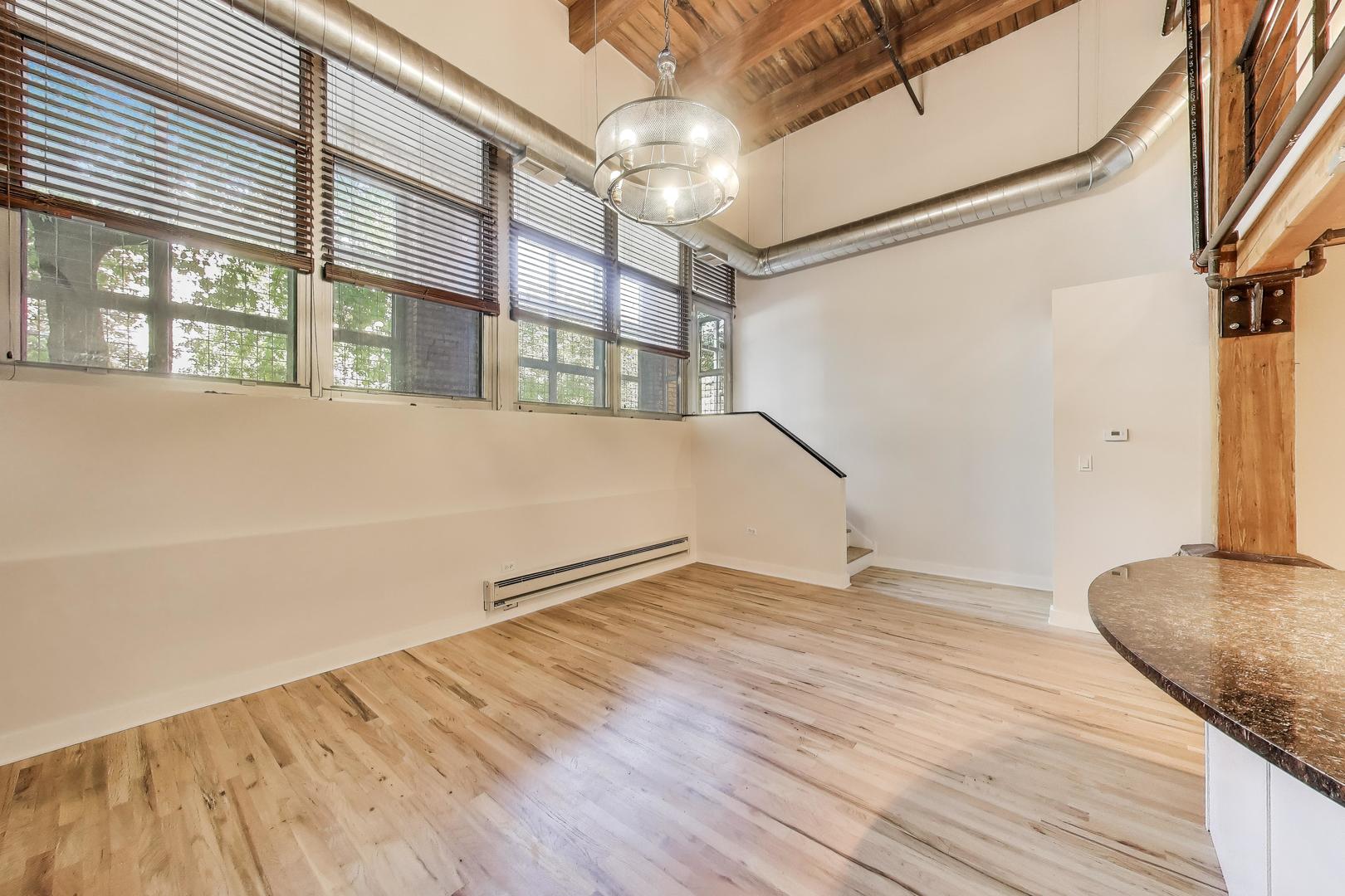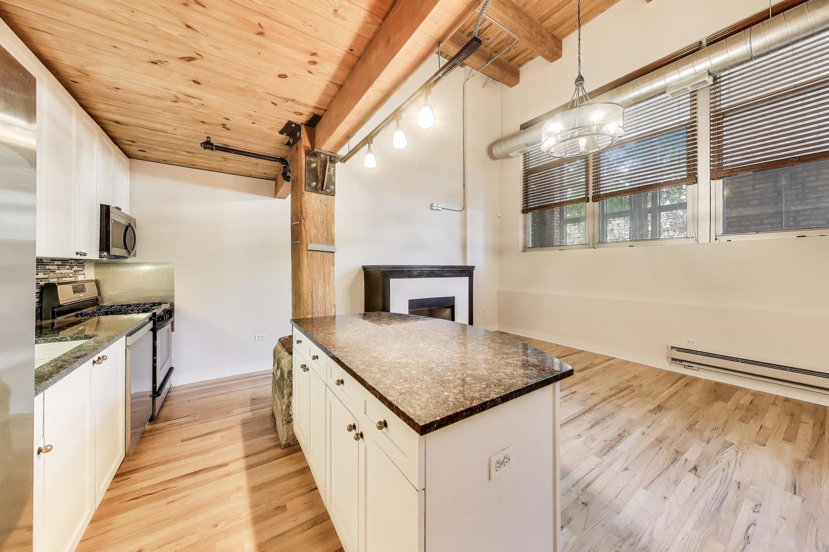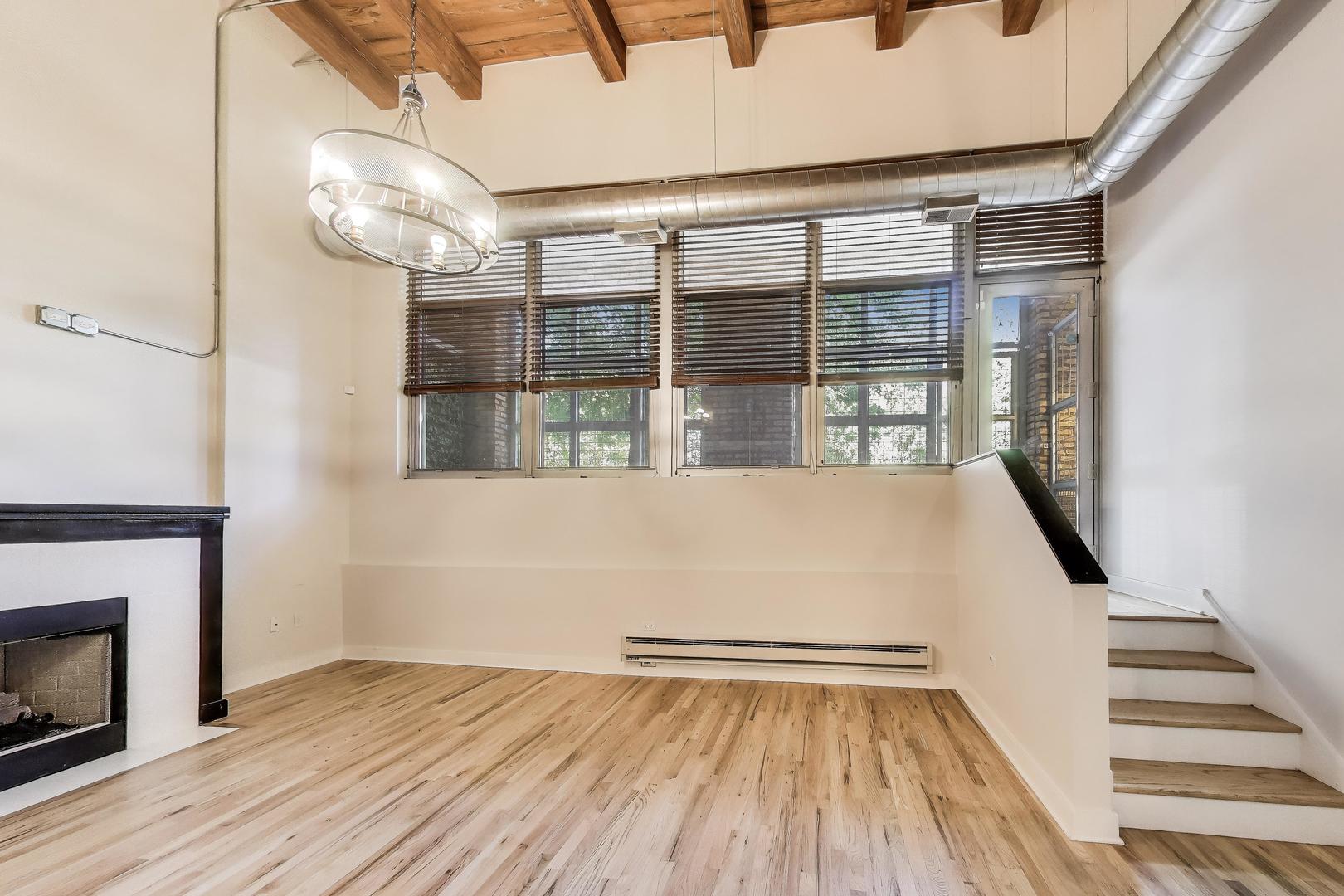 This fantastic two level loft is the larger one bedroom floor plan in the building which includes five closets. Located in the historic Churchill Row Lofts building on a quiet tree-lined street with luxury single family homes in the heart of Bucktown/Wicker. Just off the 606 Trail and very close to the bustling Damen & Milwaukee Corridors, night life, shopping & Blue Line. Enjoy the rustic and inviting charm of a true Chicago loft with its soaring 17′ timber ceiling, exposed wood beams & columns, ductwork, hardwood floors and a gas fireplace. The spacious bathroom was updated in 2023. The large lofted bedroom with three customized closets overlooks the living room with views to the outside through a full wall of 13′ tall windows which allows the sun in winter months and shade in the summer. The kitchen includes granite counters, SS appliances, solid wood white cabinetry, tiled backsplash and a three seat island. Access this unit through your own convenient gated and secured private patio entrance, through the garage or main lobby. New furnace in 2022. New in-unit washer/dryer and microwave 2023. New refrigerator 2025. Deeded indoor parking space and ample street parking. Storage locker also included! The architectural details make this property one you won’t forget!