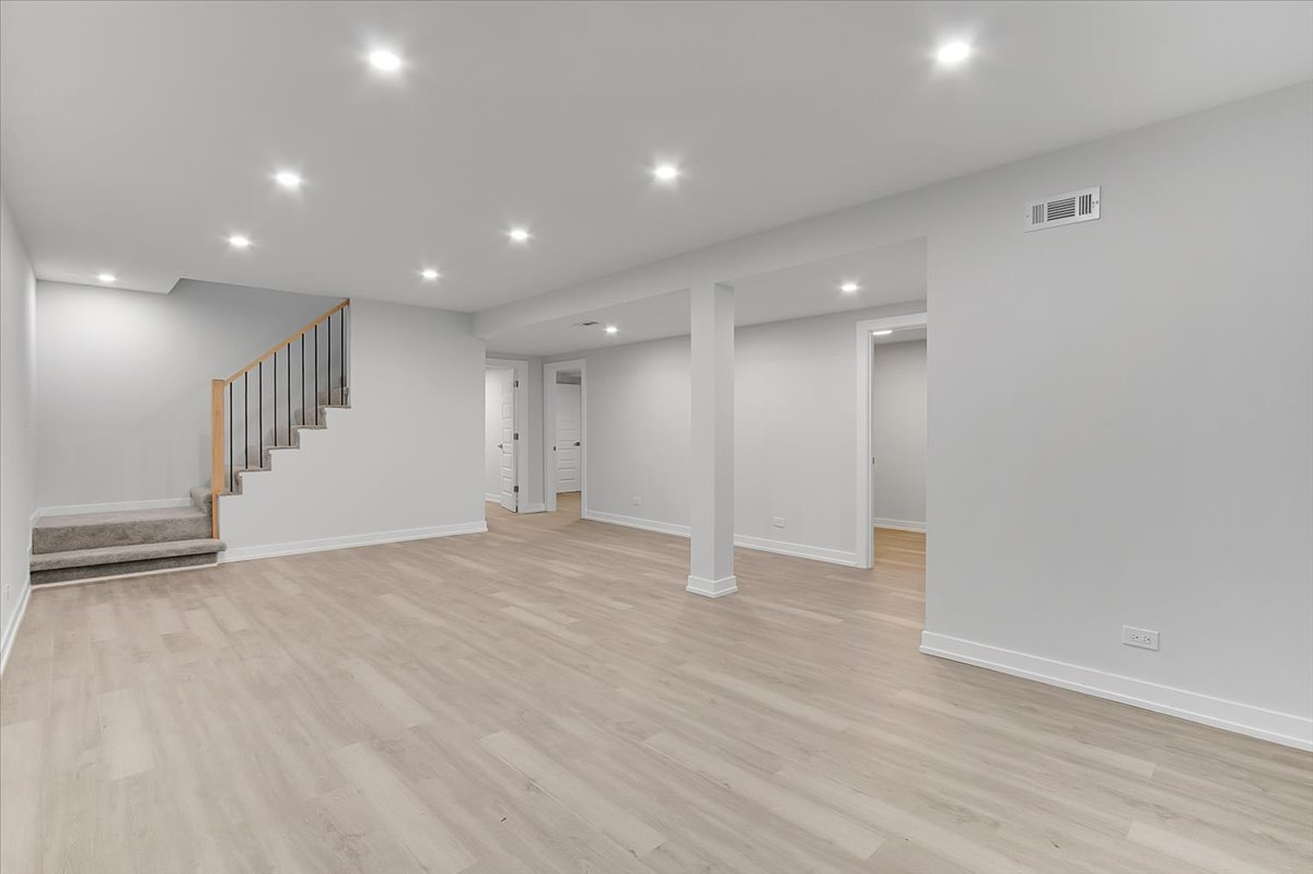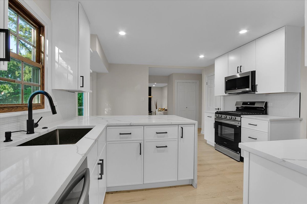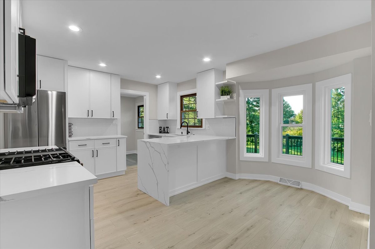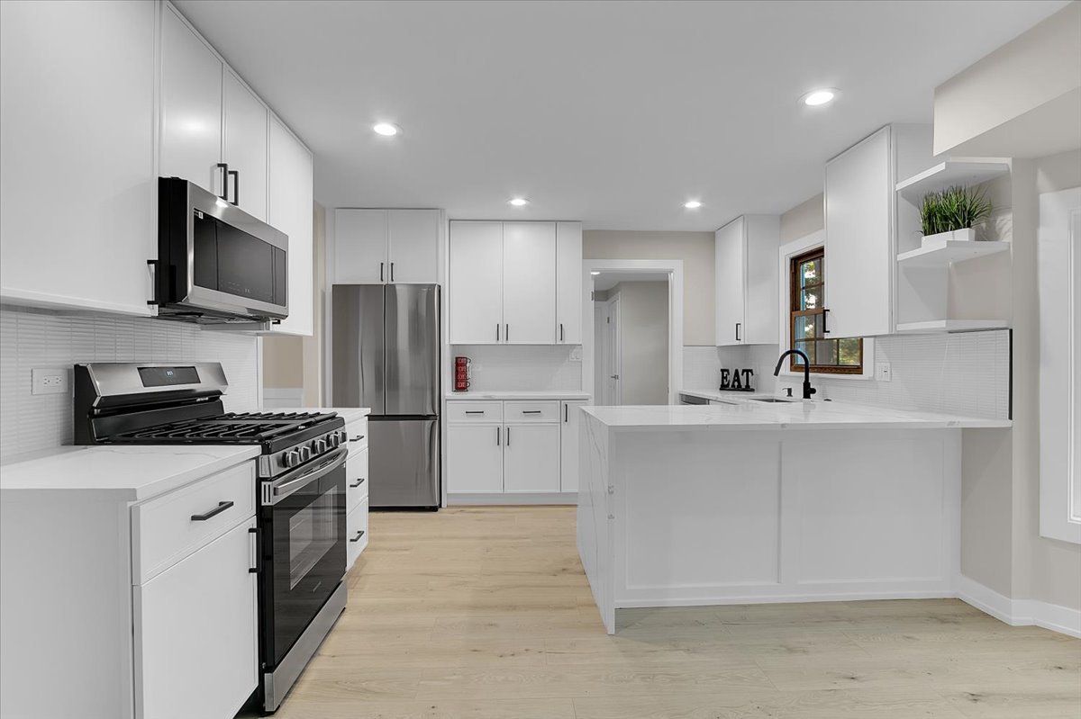 Discover refined comfort in this stunning two-story home offering 5 bedrooms,. 2,5 bathrooms, and over 3,400 sgft of elegant living space. Step inside to a bright, open-concept main level featuring designer finishes, including hardwood laminate floors and a gourmet kitchen with custom white shaker cabinetry, sleek quartz countertops, and brand-new stainless steal appliances. The upper level showcases four spacious bedrooms with walk in closets including a serene primary suite, and two modern full bathrooms.Gleaming hardwood floors add timeless sophistication throughout. personal retreat. Finished basement provides an additional bedroom and flexible living space for work or leisure. Outdoors, an oversized deck invites you to relax or entertain in style, surrounded by ample space for gathering This move-in ready house combines modern design, thoughtful details, and luxurious comfort -a rare opportunity you won’t want to miss.