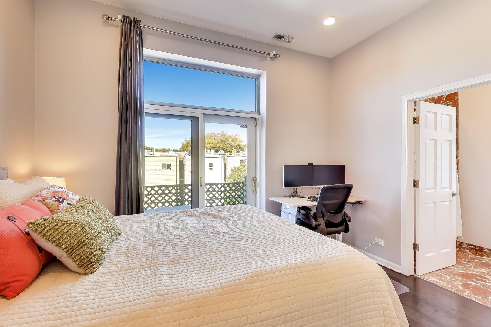 Beautifully bright and spacious 3-Bedroom Duplex-Up in Prime Wicker Park Location. The main level features a fully renovated kitchen with sleek white cabinetry, quartz countertops, a marble backsplash, and a custom dry bar providing ample storage. The open-concept living and dining area easily accommodates a large table and oversized sectional, enhanced by surround sound and a updated cozy gas fireplace and custom shelving surround. Upstairs, the primary suite boasts a generous bedroom with blackout window treatments, a massive organized walk-in closet, and full bath with soaking tub. Step out onto the 400 SF private deck, complete with a wet bar and custom pergola-ideal for grilling, entertaining, or simply enjoying panoramic views of the Chicago skyline. Two additional bedrooms on the main level (one en suite, one featuring a custom murphy bed) offer flexible options for guest space, home offices, or fitness areas. Additional highlights include refinished hardwood floors throughout, new baseboards and casings (2019), crown molding, and custom window treatments. Mechanical updates include a new humidifier (2019), high-efficiency AC (2018), and furnace/air handler (2015), new windows (2024), washer/dryer, and new trim. The building received a new roofs/repairs in 2018/2025, tuck pointing and sealing in 2019, with a common entry and stair refresh in 2020. Gated parking included. Unbeatable location with easy access to expressways, public transit, the 606 Trail, and Wicker Park’s best restaurants and entertainment. HOA monthly: $366