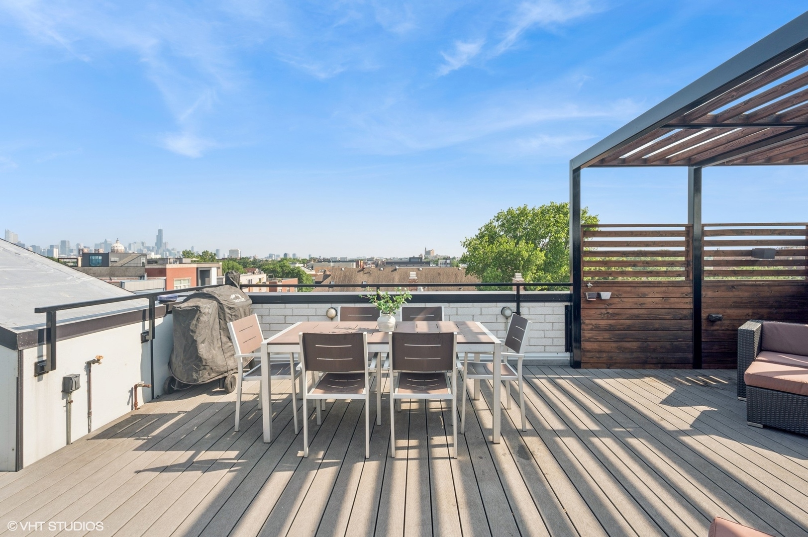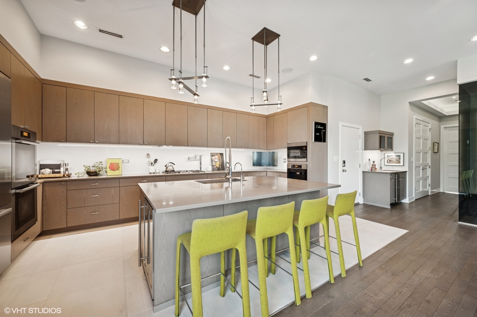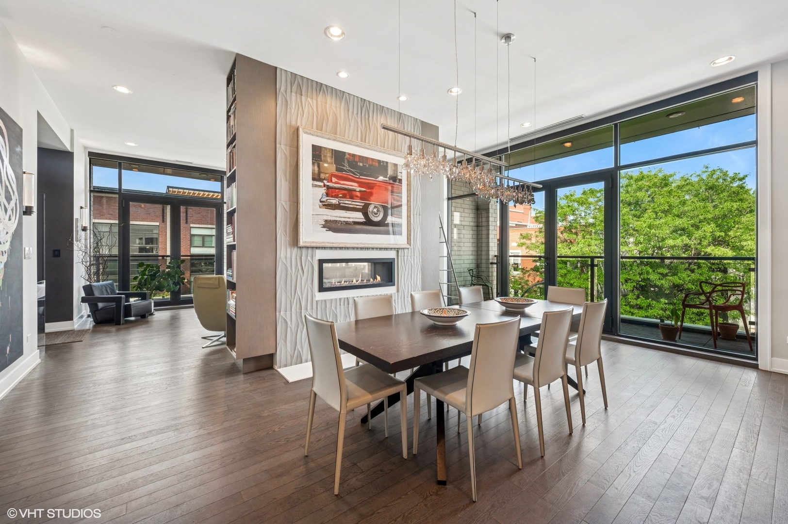 Spectacular full-floor 3 bed, 3.1 bath penthouse condo with direct and private elevator access is perfectly situated in prime Bucktown at the corner of Damen and Shakespeare. Soaring 18′ ceilings and dramatic windows flood this home with natural light, while an expansive private rooftop terrace offers unmatched skyline views. Rare, boutique elevator building offers 2-car attached and heated garage parking. Designed for luxurious living and effortless entertaining with more than 2,800 square feet of living space and open-concept living. The spacious living room is framed by dramatic floor-to-ceiling east and north facing windows and a sleek dual-sided fireplace. The adjacent dining area is anchored by a full wet bar and a striking, floor to ceiling, custom glass wine cellar. The ultimate chef’s kitchen offers sleek quartz countertops, generous custom cabinetry, and high-end appliances-including a built-in Miele coffee system, double ovens, pot filler, dual dishwashers, and two beverage/wine refrigerators. Just off the living room, two private balconies extend your entertaining space and offer the perfect setting for morning coffee or evening cocktails. The luxurious primary suite features a generous walk-in closet and spa-like bath with dual vanities, a jetted soaking tub, and steam shower. Two spacious secondary bedrooms, each with its own en-suite bath for comfort and privacy. Upstairs, an expansive private rooftop deck offers a true outdoor oasis with sweeping panoramic views of the city skyline. Thoughtfully designed for entertaining and relaxation, this incredible space features built-in seating, an outdoor TV/lounge area, a pergola offering shade and style, and both water and gas lines for easy outdoor cooking and hosting. Attached and heated two-car garage and dedicated storage. Ideally located near Bucktown’s best dining, shopping, the 606 Trail, public transport, Midtown Athletic Club and more. Pulaski Elementary School district. Come see this rare offering!