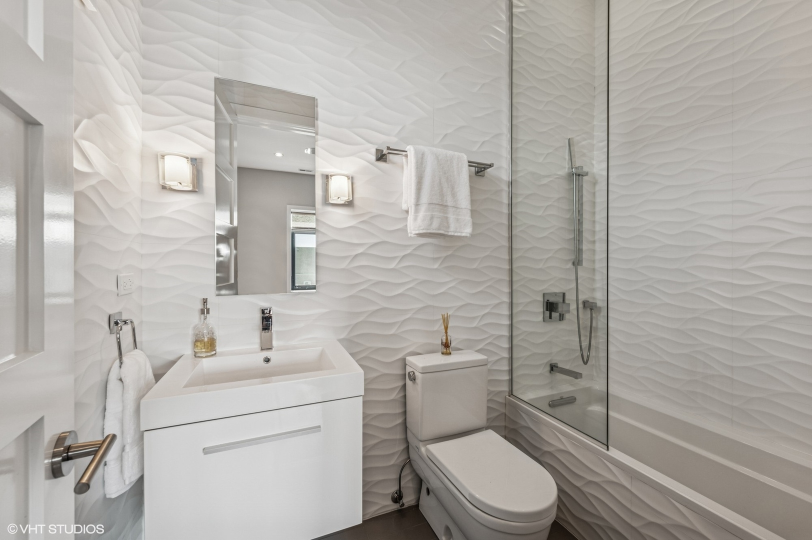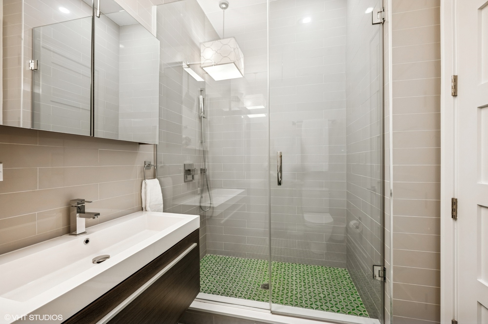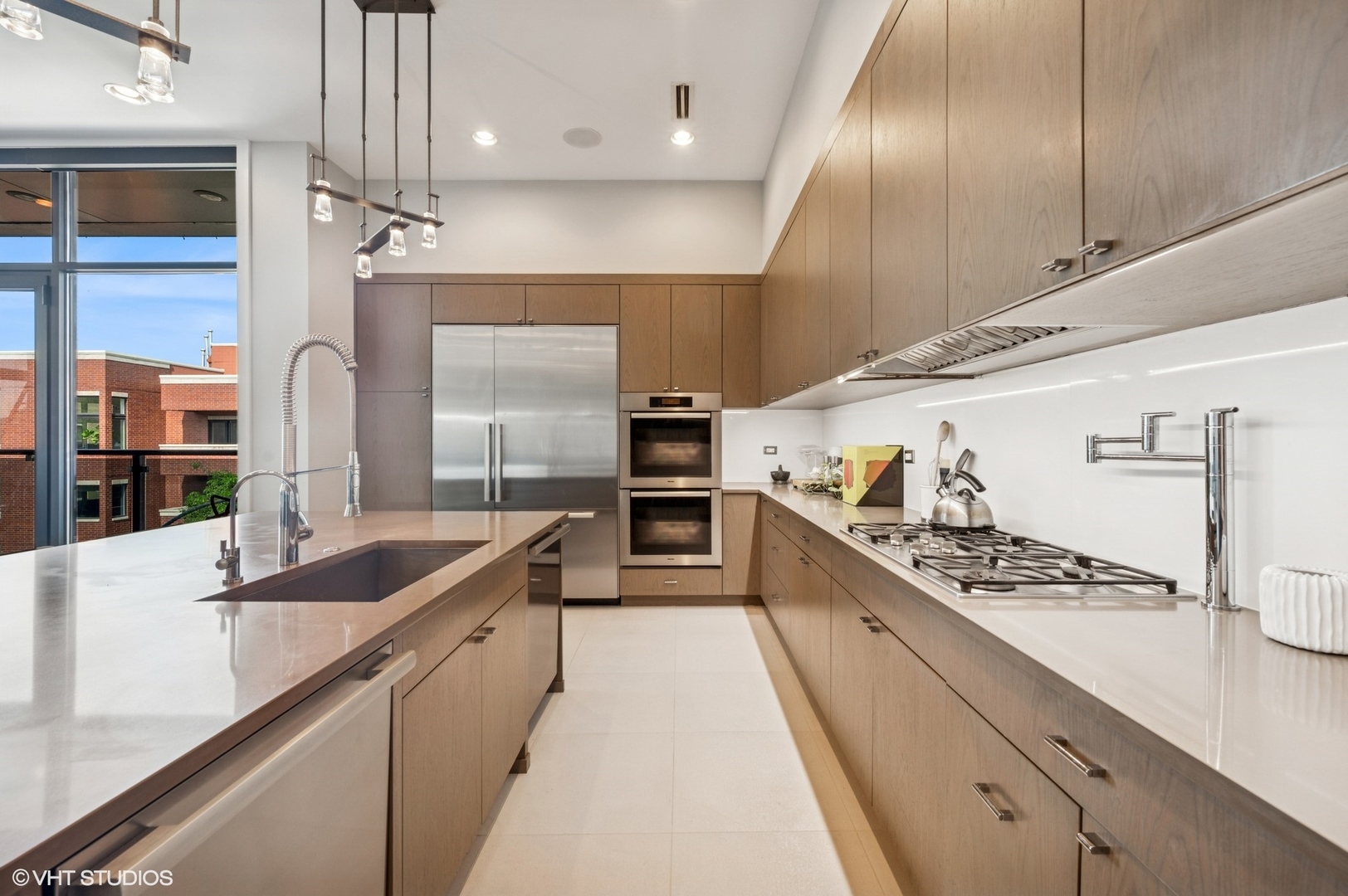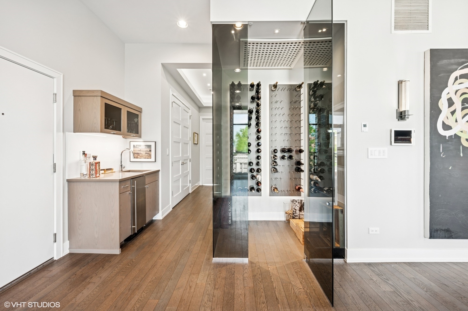 Spectacular full-floor 3 bed, 3.1 bath penthouse condo with direct and private elevator access is perfectly situated in prime Bucktown at the corner of Damen and Shakespeare. Soaring 18′ ceilings and dramatic windows flood this home with natural light, while an expansive private rooftop terrace offers unmatched skyline views. Rare, boutique elevator building offers 2-car attached and heated garage parking. Designed for luxurious living and effortless entertaining with more than 2,800 square feet of living space and open-concept living. The spacious living room is framed by dramatic floor-to-ceiling east and north facing windows and a sleek dual-sided fireplace. The adjacent dining area is anchored by a full wet bar and a striking, floor to ceiling, custom glass wine cellar. The ultimate chef’s kitchen offers sleek quartz countertops, generous custom cabinetry, and high-end appliances-including a built-in Miele coffee system, double ovens, pot filler, dual dishwashers, and two beverage/wine refrigerators. Just off the living room, two private balconies extend your entertaining space and offer the perfect setting for morning coffee or evening cocktails. The luxurious primary suite features a generous walk-in closet and spa-like bath with dual vanities, a jetted soaking tub, and steam shower. Two spacious secondary bedrooms, each with its own en-suite bath for comfort and privacy. Upstairs, an expansive private rooftop deck offers a true outdoor oasis with sweeping panoramic views of the city skyline. Thoughtfully designed for entertaining and relaxation, this incredible space features built-in seating, an outdoor TV/lounge area, a pergola offering shade and style, and both water and gas lines for easy outdoor cooking and hosting. Attached and heated two-car garage and dedicated storage. Ideally located near Bucktown’s best dining, shopping, the 606 Trail, public transport, Midtown Athletic Club and more. Pulaski Elementary School district. Come see this rare offering!