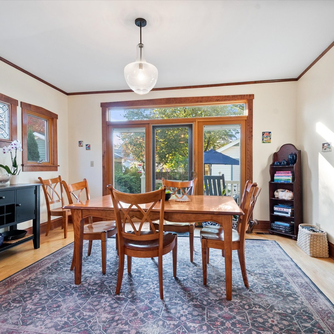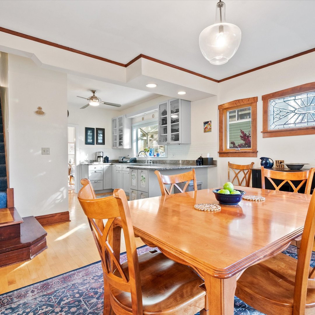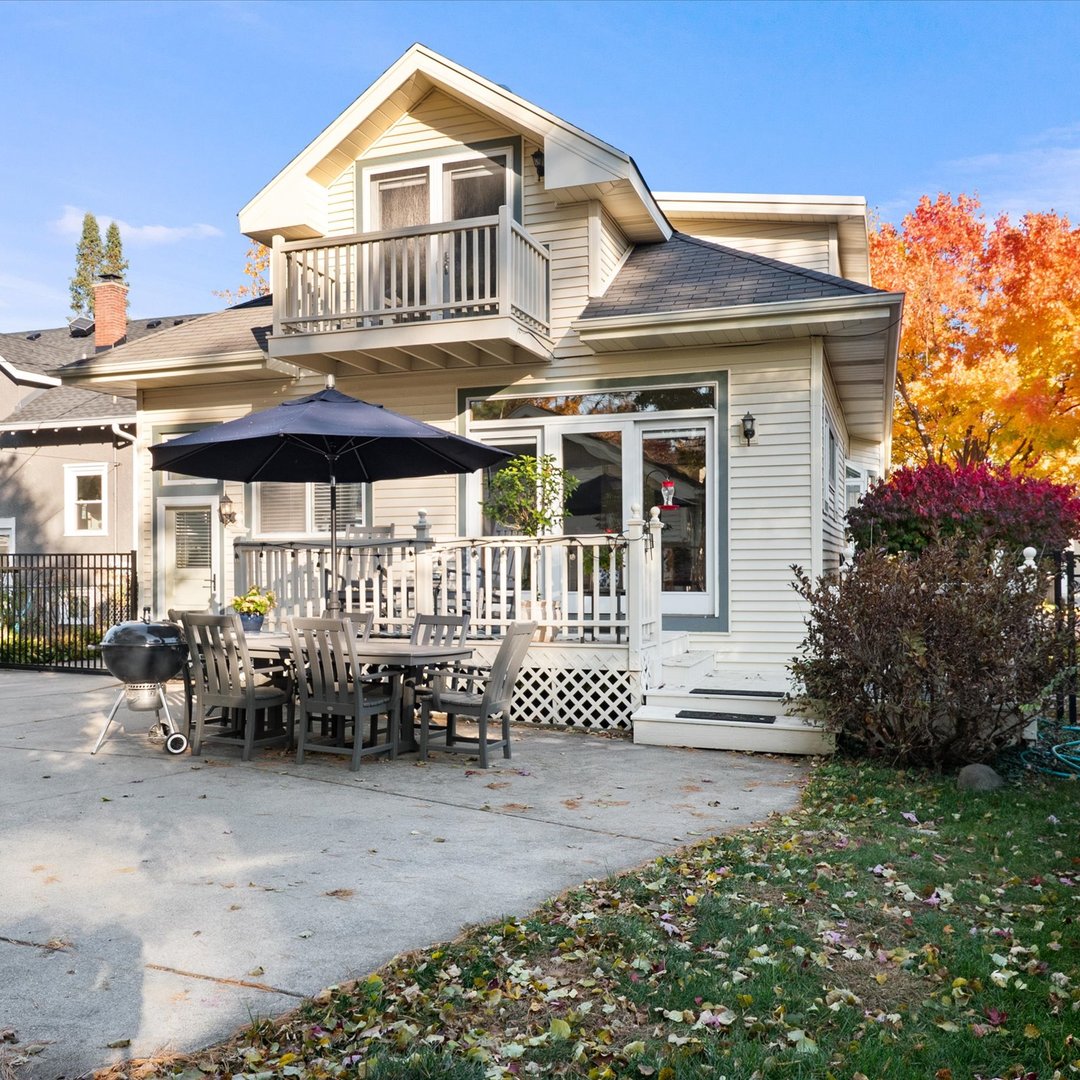 Just two blocks to downtown Arlington Heights, this charming expanded bungalow is much larger than it looks from the outside! The welcoming front porch is perfect for enjoyment much of the year and leads to the formal living and dining room with hardwood floors, crown molding and streaming sunlight from the south facing windows. The delightful kitchen and breakfast room lead to both the deck and casual family room for casual enjoyment. First floor bedroom/office and full bath is great for multiple uses. The primary suite on the second level has many great features including sitting room, walk in closet, skylights, bathroom with soaking tub and separate shower, as well as a balcony overlooking the yard. Three additional family bedrooms plus a hall bathroom complete the second floor. Leading to the lower level is a mudroom area and door to the yard/detached 2 car garage. The lower level offers versatility with a recreation room, abundant storage, and laundry. The manageable yard with perennial landscaping plus deck and patio area are great for outdoor enjoyment and are enclosed with a fully fenced yard with power driveway gate. This home has been nicely updated and well maintained – and is super convenient just 2 blocks to Metra, shops, restaurants and everything Arlington Heights has to offer!