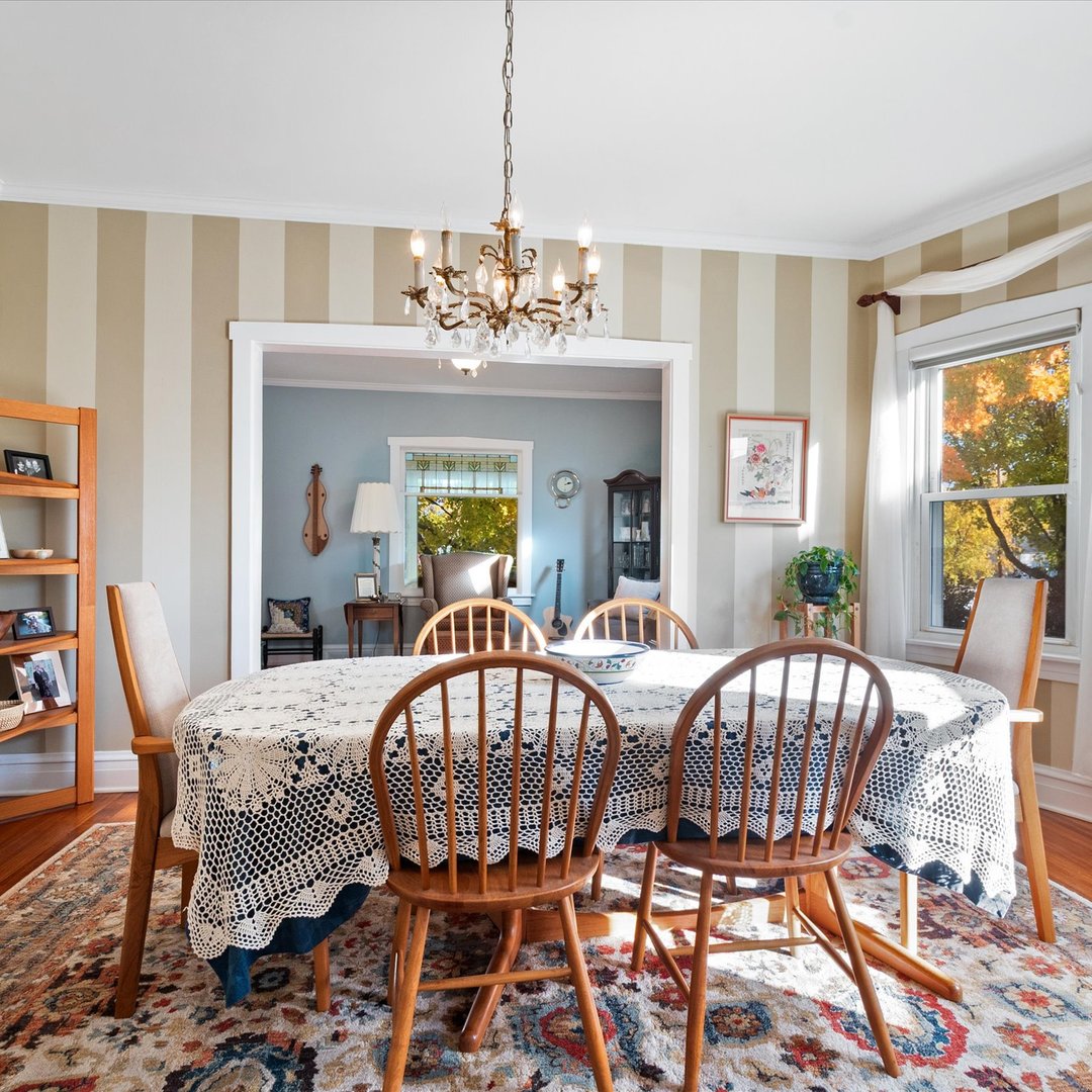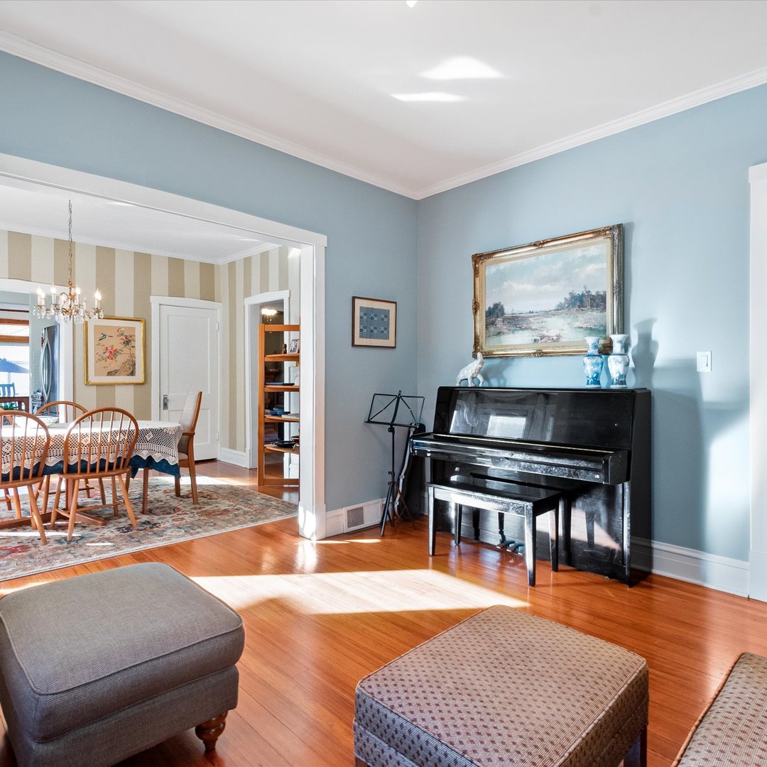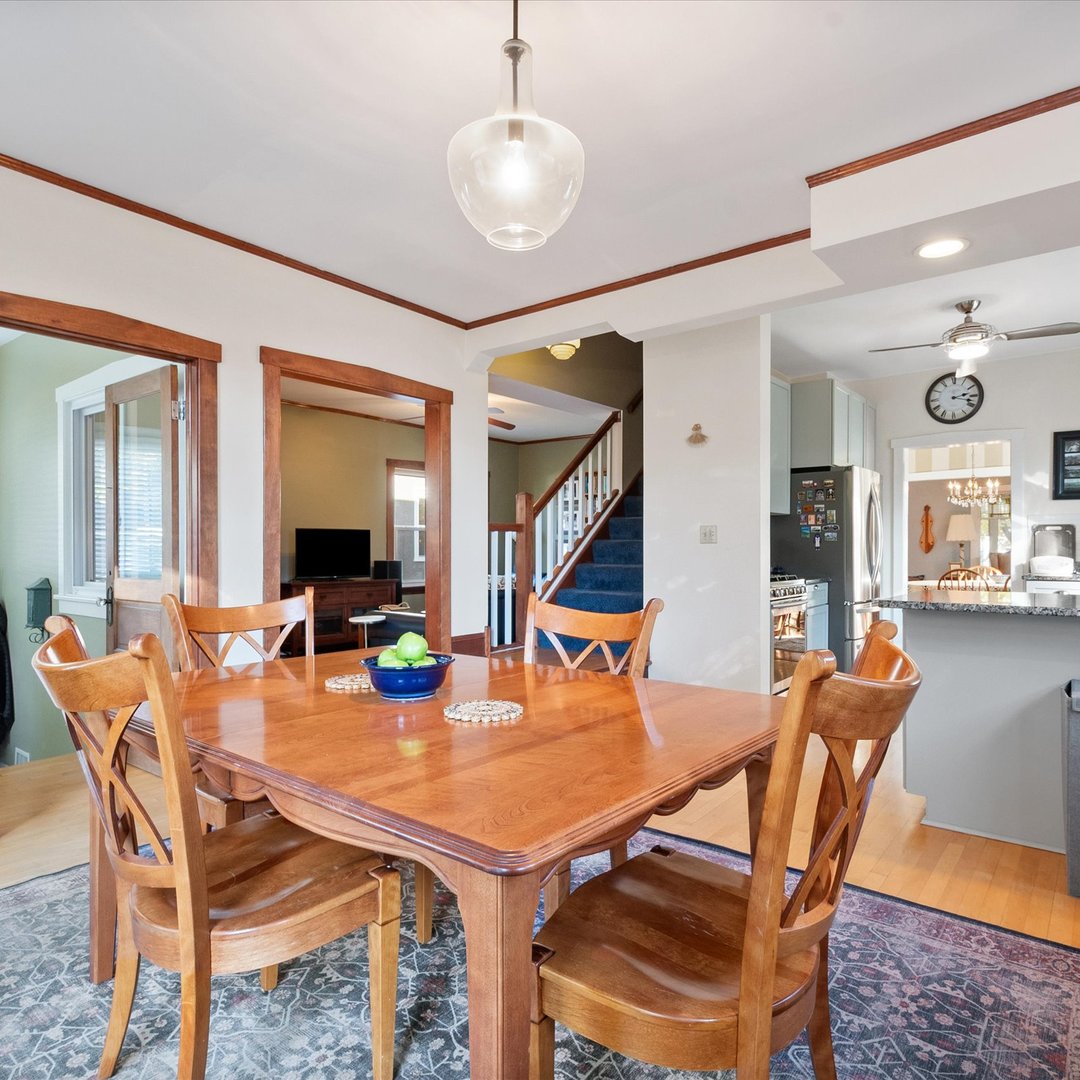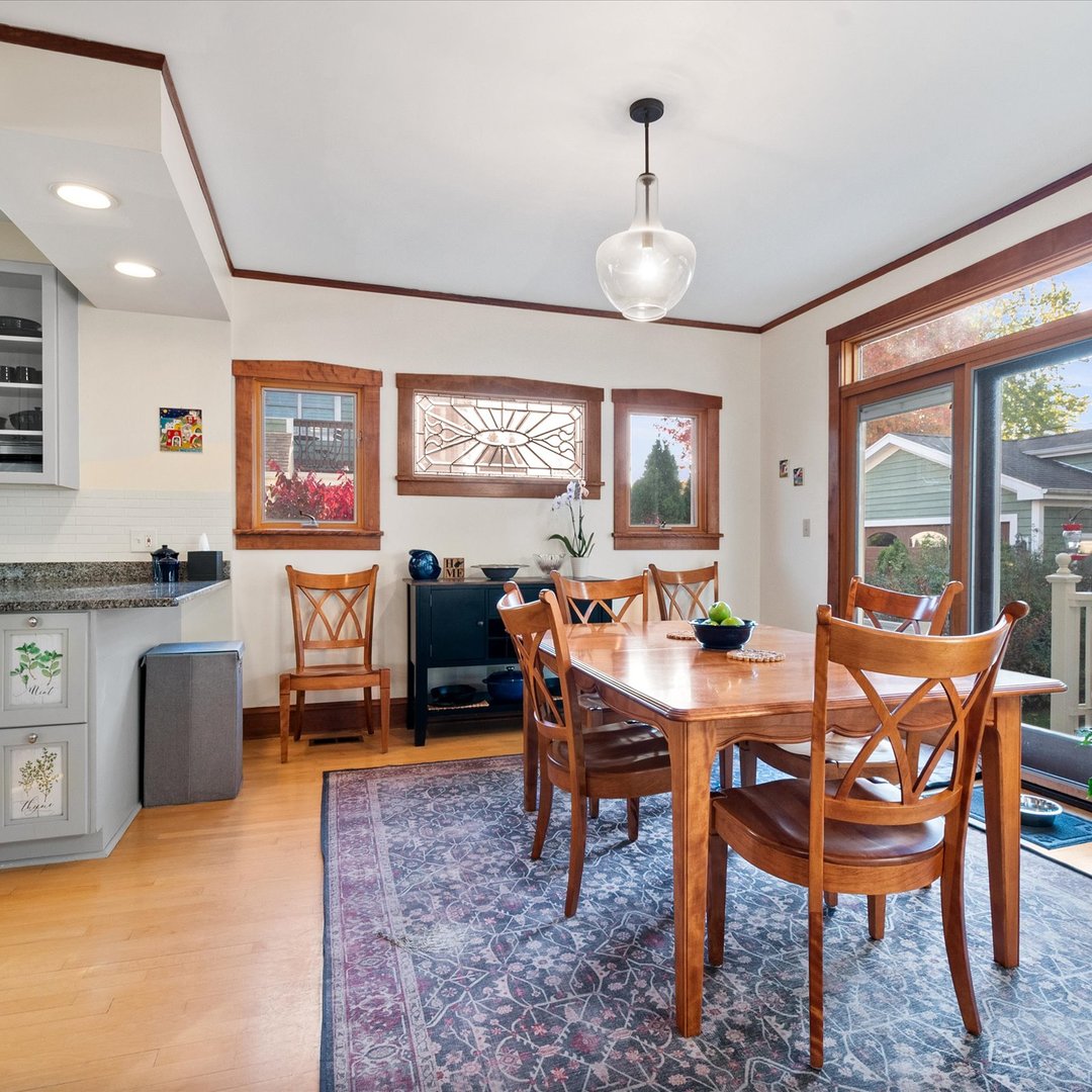 Just two blocks to downtown Arlington Heights, this charming expanded bungalow is much larger than it looks from the outside! The welcoming front porch is perfect for enjoyment much of the year and leads to the formal living and dining room with hardwood floors, crown molding and streaming sunlight from the south facing windows. The delightful kitchen and breakfast room lead to both the deck and casual family room for casual enjoyment. First floor bedroom/office and full bath is great for multiple uses. The primary suite on the second level has many great features including sitting room, walk in closet, skylights, bathroom with soaking tub and separate shower, as well as a balcony overlooking the yard. Three additional family bedrooms plus a hall bathroom complete the second floor. Leading to the lower level is a mudroom area and door to the yard/detached 2 car garage. The lower level offers versatility with a recreation room, abundant storage, and laundry. The manageable yard with perennial landscaping plus deck and patio area are great for outdoor enjoyment and are enclosed with a fully fenced yard with power driveway gate. This home has been nicely updated and well maintained – and is super convenient just 2 blocks to Metra, shops, restaurants and everything Arlington Heights has to offer!
