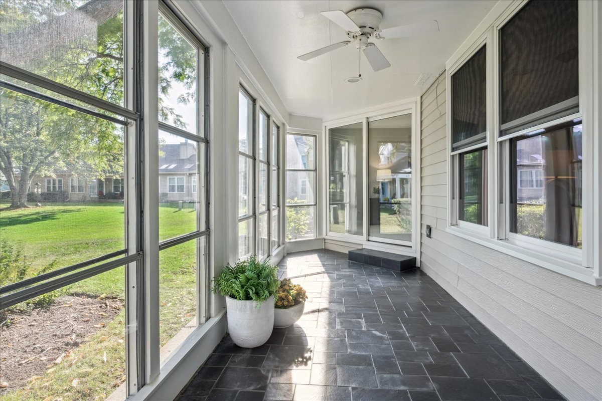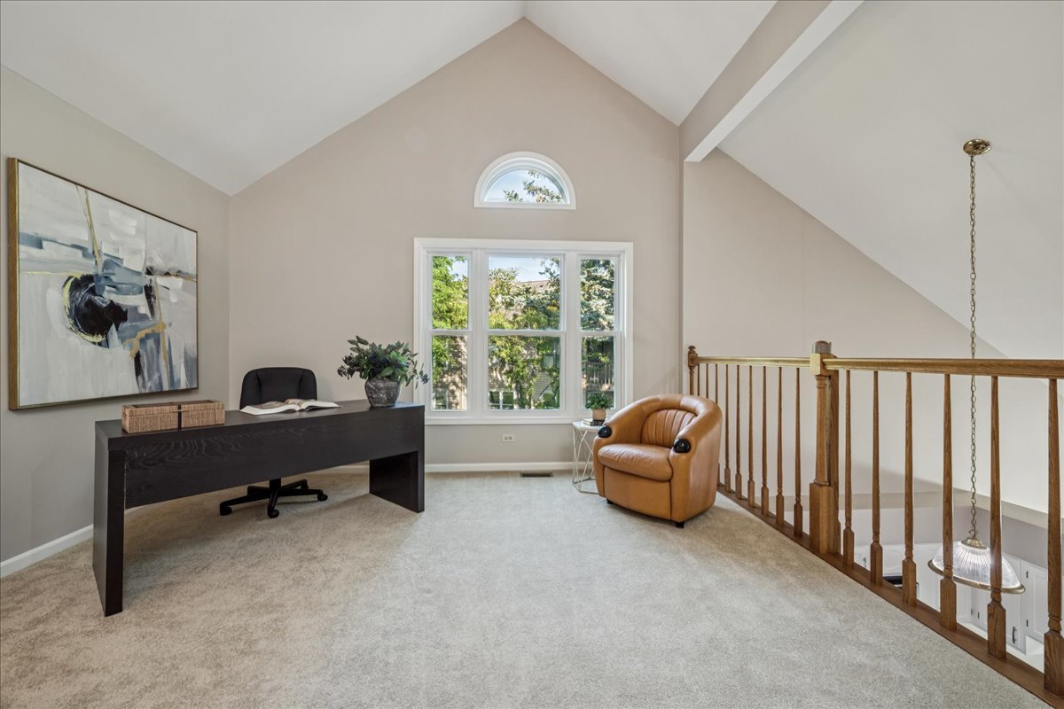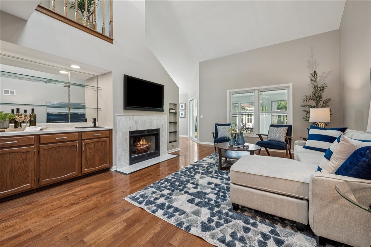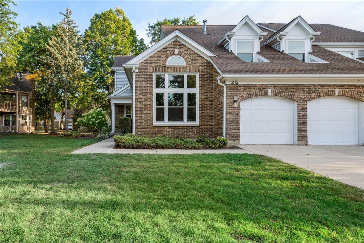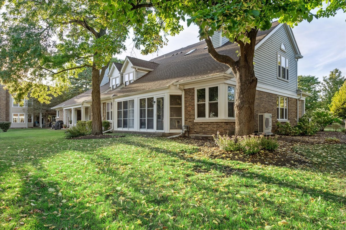 LARGEST MODEL END-UNIT, with a highly desirable EAST-FACING entrance and distant golf course view in back, offering over 2,800 sq. ft. plus a screened porch and finished basement. A welcoming vaulted two-story living room, formal dining room, family room equipped with wet bar and fireplace and open layout create an airy feel with spacious rooms throughout. New Roof (2024), New windows (2018), skylights (2024), and NEW furnace, air conditioner (2022) with smart thermostat, and water heater (2022) provide comfort and peace of mind. This home is designed for entertaining as well as comfort living with soaring ceilings, gleaming hardwood floors, and a marble fireplace. The finished basement expands your options with a large recreation area, wet bar with Sub-Zero fridge, half bath, workshop, and generous storage. The first-floor primary suite offers screened porch access and a renovated luxury bath with dual sinks, custom marble shower, and dual walk-in closets. Upstairs you’ll find two large bedrooms (one with a walk-in closet), a full bath, and a versatile loft perfect for an office or playroom. In total: 3 bedrooms, loft, 2 full baths, 2 half baths, huge finished basement with workshop, and a two-car attached garage. The kitchen is equipped with newer WiFi-connected smart appliances. Community amenities include multiple pools and clubhouses. Award-winning Stevenson High School and convenient access to the Metra station make this a must-see!