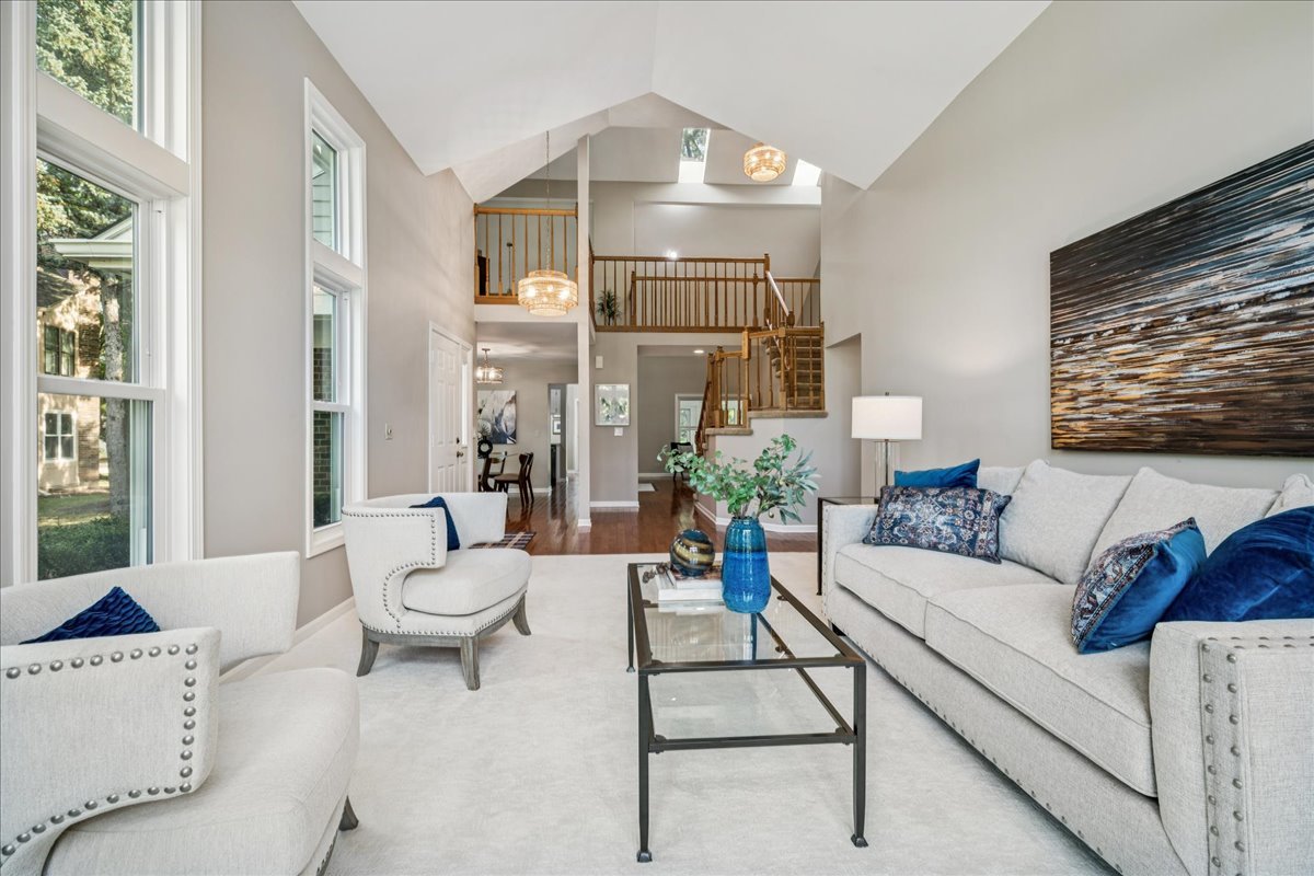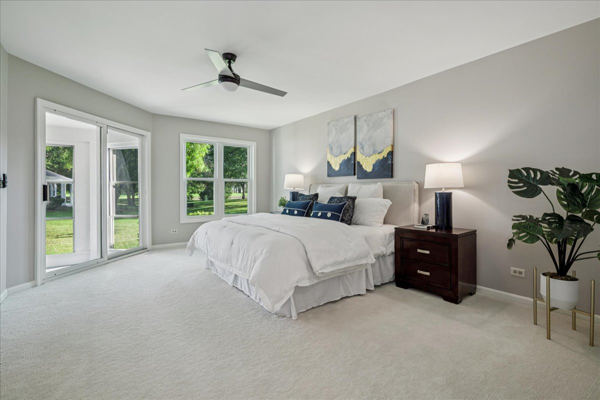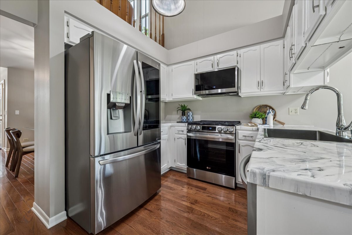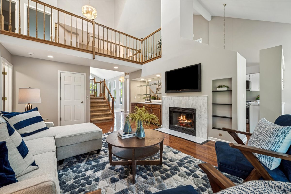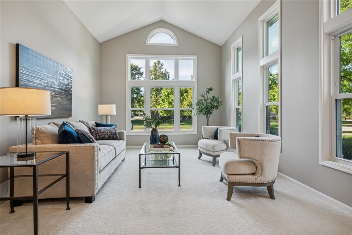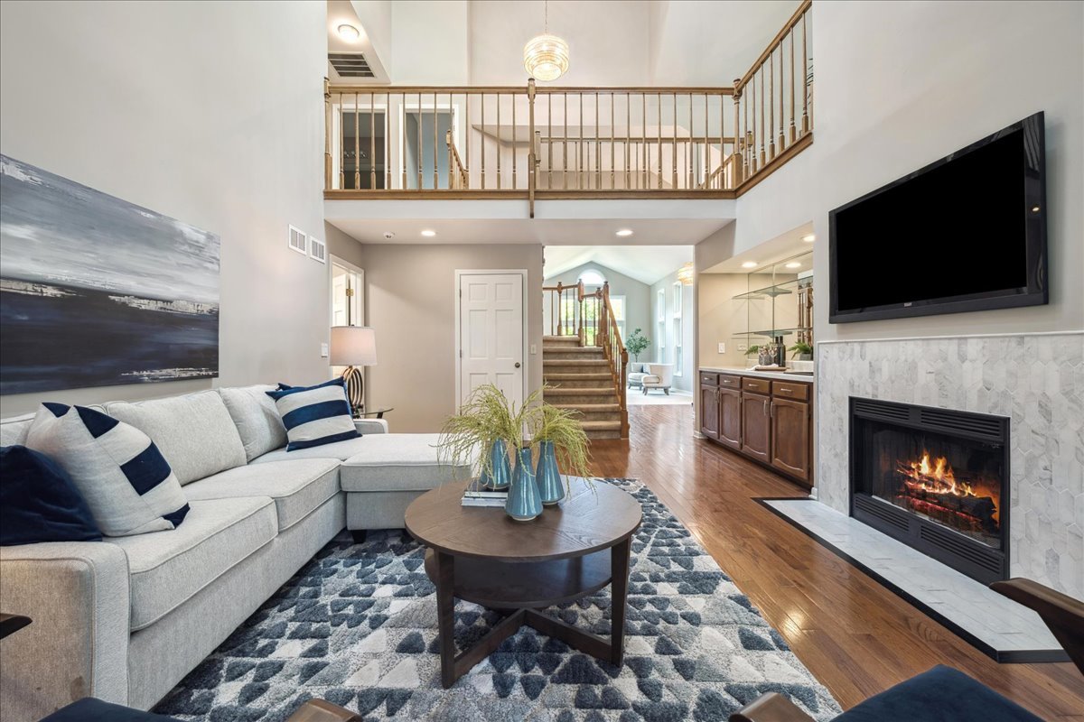 LARGEST MODEL END-UNIT, with a highly desirable EAST-FACING entrance and distant golf course view in back, offering over 2,800 sq. ft. plus a screened porch and finished basement. A welcoming vaulted two-story living room, formal dining room, family room equipped with wet bar and fireplace and open layout create an airy feel with spacious rooms throughout. New Roof (2024), New windows (2018), skylights (2024), and NEW furnace, air conditioner (2022) with smart thermostat, and water heater (2022) provide comfort and peace of mind. This home is designed for entertaining as well as comfort living with soaring ceilings, gleaming hardwood floors, and a marble fireplace. The finished basement expands your options with a large recreation area, wet bar with Sub-Zero fridge, half bath, workshop, and generous storage. The first-floor primary suite offers screened porch access and a renovated luxury bath with dual sinks, custom marble shower, and dual walk-in closets. Upstairs you’ll find two large bedrooms (one with a walk-in closet), a full bath, and a versatile loft perfect for an office or playroom. In total: 3 bedrooms, loft, 2 full baths, 2 half baths, huge finished basement with workshop, and a two-car attached garage. The kitchen is equipped with newer WiFi-connected smart appliances. Community amenities include multiple pools and clubhouses. Award-winning Stevenson High School and convenient access to the Metra station make this a must-see!
