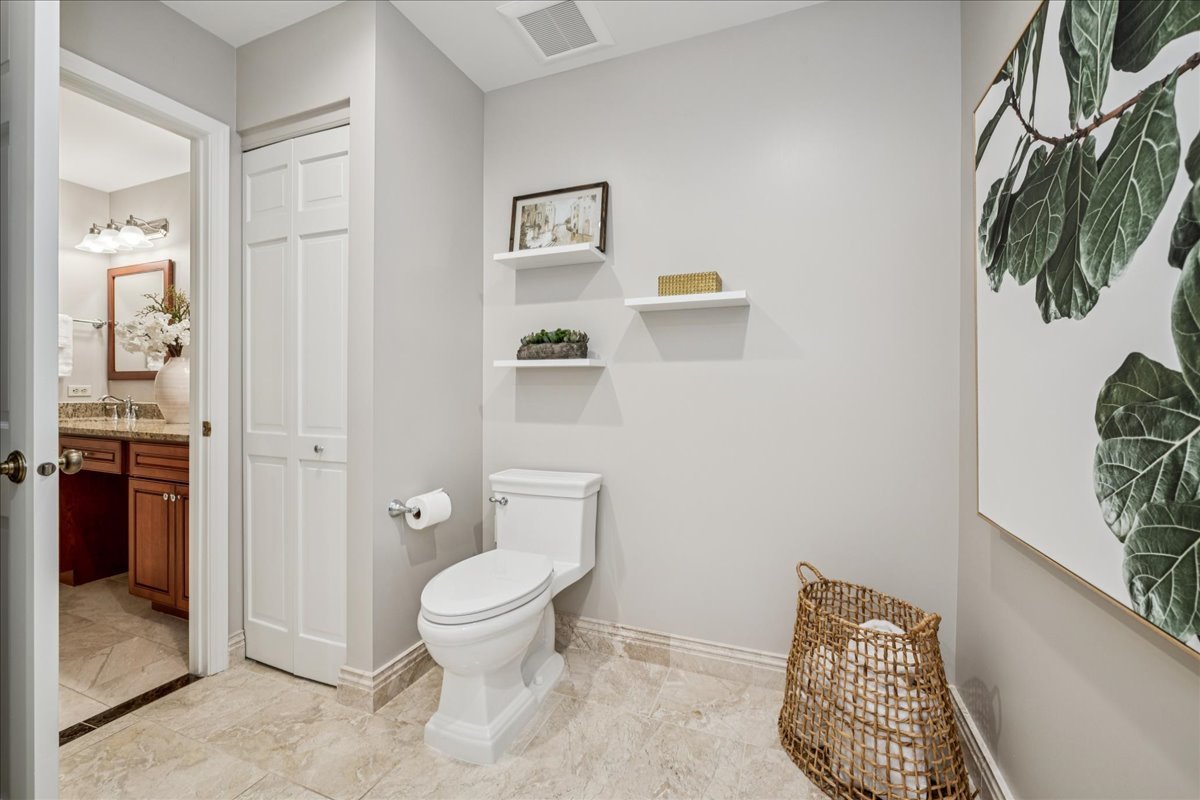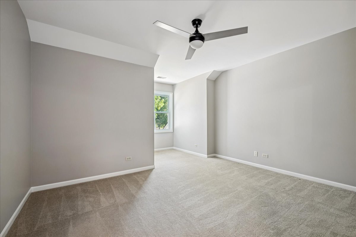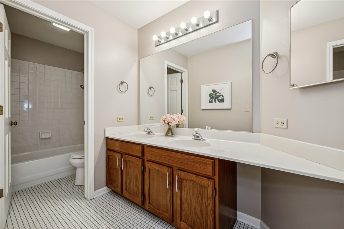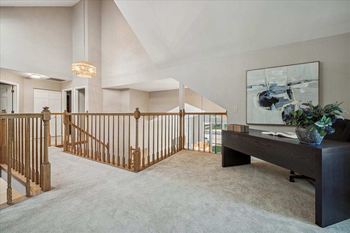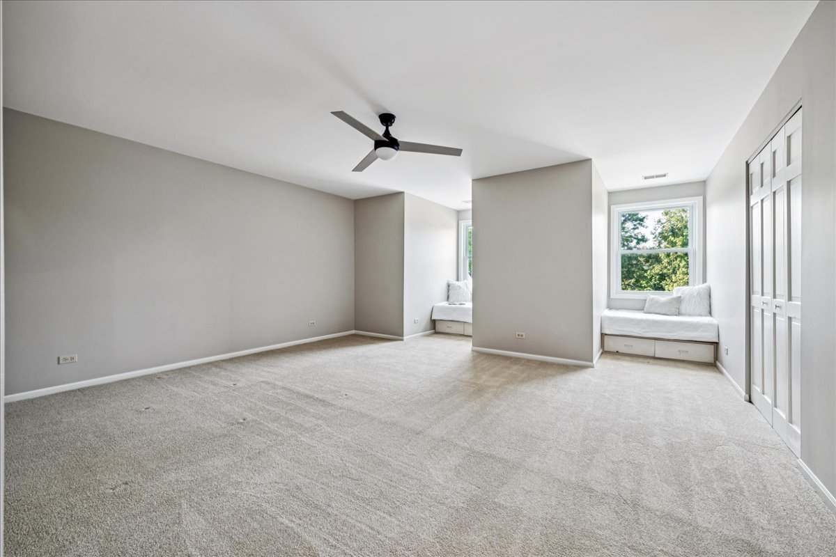 LARGEST MODEL END-UNIT, with a highly desirable EAST-FACING entrance and distant golf course view in back, offering over 2,800 sq. ft. plus a screened porch and finished basement. A welcoming vaulted two-story living room, formal dining room, family room equipped with wet bar and fireplace and open layout create an airy feel with spacious rooms throughout. New Roof (2024), New windows (2018), skylights (2024), and NEW furnace, air conditioner (2022) with smart thermostat, and water heater (2022) provide comfort and peace of mind. This home is designed for entertaining as well as comfort living with soaring ceilings, gleaming hardwood floors, and a marble fireplace. The finished basement expands your options with a large recreation area, wet bar with Sub-Zero fridge, half bath, workshop, and generous storage. The first-floor primary suite offers screened porch access and a renovated luxury bath with dual sinks, custom marble shower, and dual walk-in closets. Upstairs you’ll find two large bedrooms (one with a walk-in closet), a full bath, and a versatile loft perfect for an office or playroom. In total: 3 bedrooms, loft, 2 full baths, 2 half baths, huge finished basement with workshop, and a two-car attached garage. The kitchen is equipped with newer WiFi-connected smart appliances. Community amenities include multiple pools and clubhouses. Award-winning Stevenson High School and convenient access to the Metra station make this a must-see!