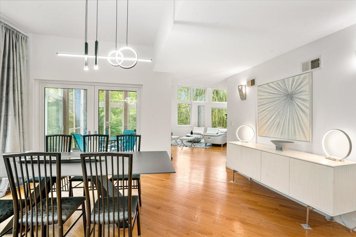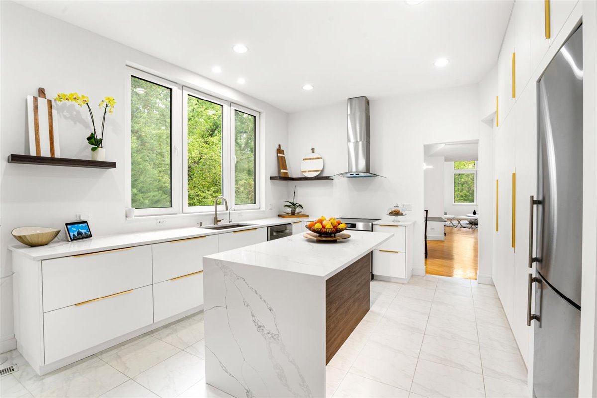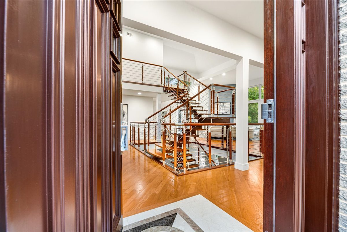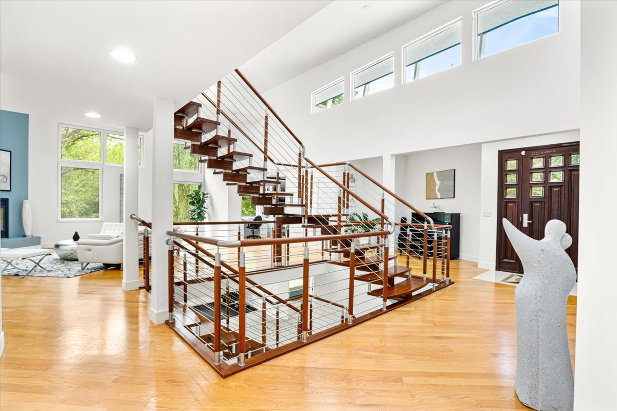 Welcome to this iconic modern home nestled on 1.62 private wooded acres in sought-after Kildeer, just minutes from Deer Park’s premier shopping, dining, and entertainment. Built in 2007 and meticulously maintained by its original owners, this 4,000+ sq ft residence is a masterclass in elevated European-inspired design – where modern lines meet warmth, natural light, and elegant finishes. From the moment you arrive, the striking roofline and sculptural geometry set a bold tone. Inside, the drama continues with soaring 17-foot ceilings, gallery-white walls, and a showstopping custom Italian floating staircase that anchors the heart of the home. Walls of glass in every direction bring the outside in, flooding the home with light and framing the surrounding woods like art. The chef’s kitchen is sleek and refined – outfitted with waterfall quartz countertops, flush cabinetry, brushed gold hardware, and integrated appliances. Oversized windows and an open-concept layout flow into the living room, where a modern painted fireplace adds understated warmth and sophistication to the minimalist space. Elegant oak floors, cable-railed stairways, and subtle tiered ceilings amplify the architectural presence throughout. The first-floor primary suite is a true private sanctuary, featuring sliding doors to the yard, soaring windows, and a luxuriously appointed spa bath with radiant heated floors. Relax in the jetted soaking tub with full-body massage jets, or step into the large walk-in shower with dual sprayers and custom tilework. Marble-inspired backlit backsplash and a designer double vanity complete the experience. A huge walk-in dressing room offers elegant built-in storage and boutique-style organization. A second main-level bathroom also features heated floors for added comfort. Additional highlights include a dedicated home office, full laundry room, and an attached garage that accommodates two cars, plus a third bay with a 9-foot-tall garage door ideal for a large SUV or specialty storage. The walkout basement offers even more potential to expand. No detail has been overlooked: German-engineered Rehau windows ,Hormann garage doors ,Imported Italian interior doors Hansgrohe and Swiss luxury faucets in all bathrooms. Behind the walls, comfort is ensured with: Three HVAC zones, Two new Carrier furnaces , Three A/C systems (two with new motors) High-performance -insulation: foam in the ceiling and blown-in wall insulation for superior efficiency. This is a rare opportunity to own a thoughtfully crafted, design-forward home that feels like a modern retreat – just minutes from the best of suburban life.