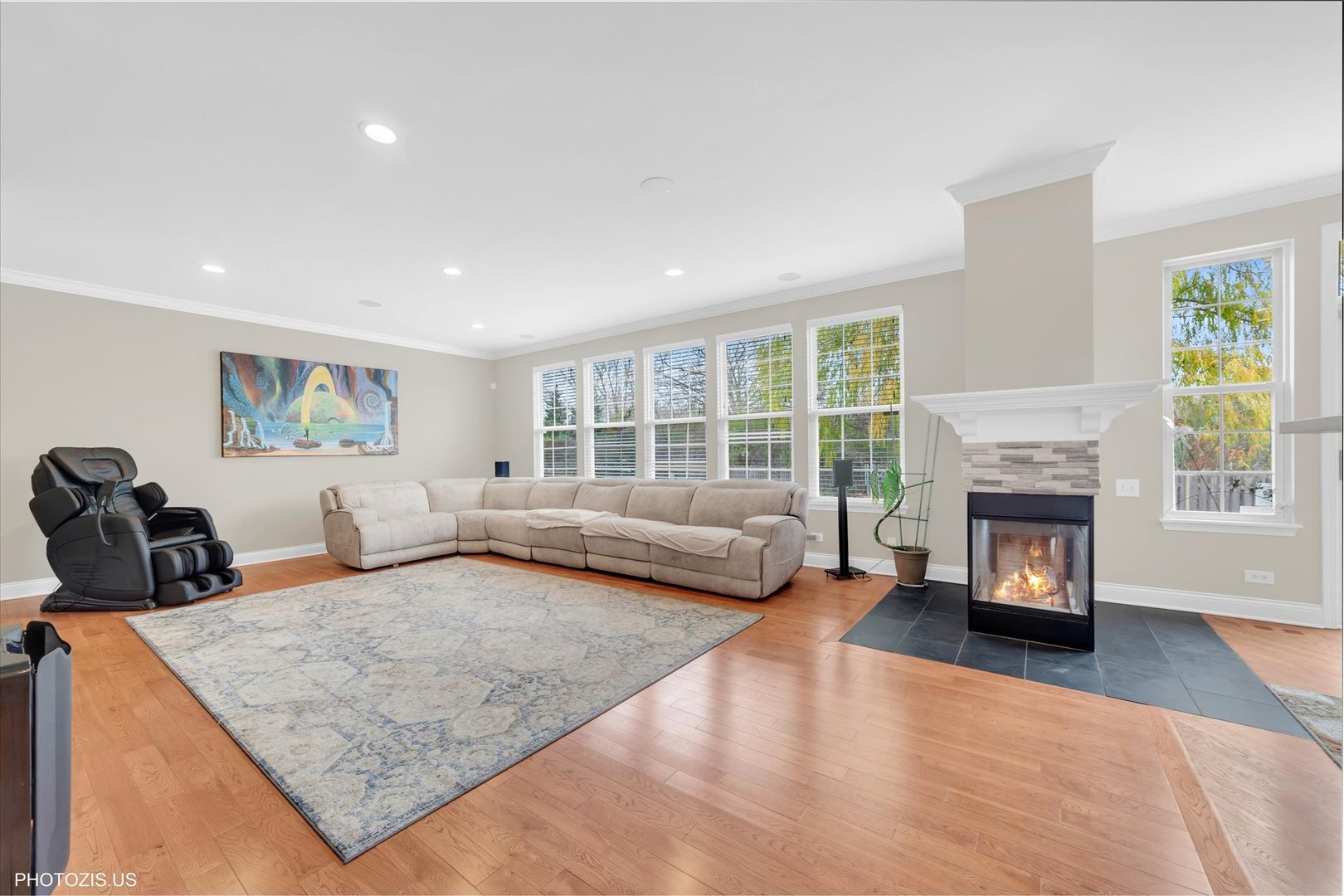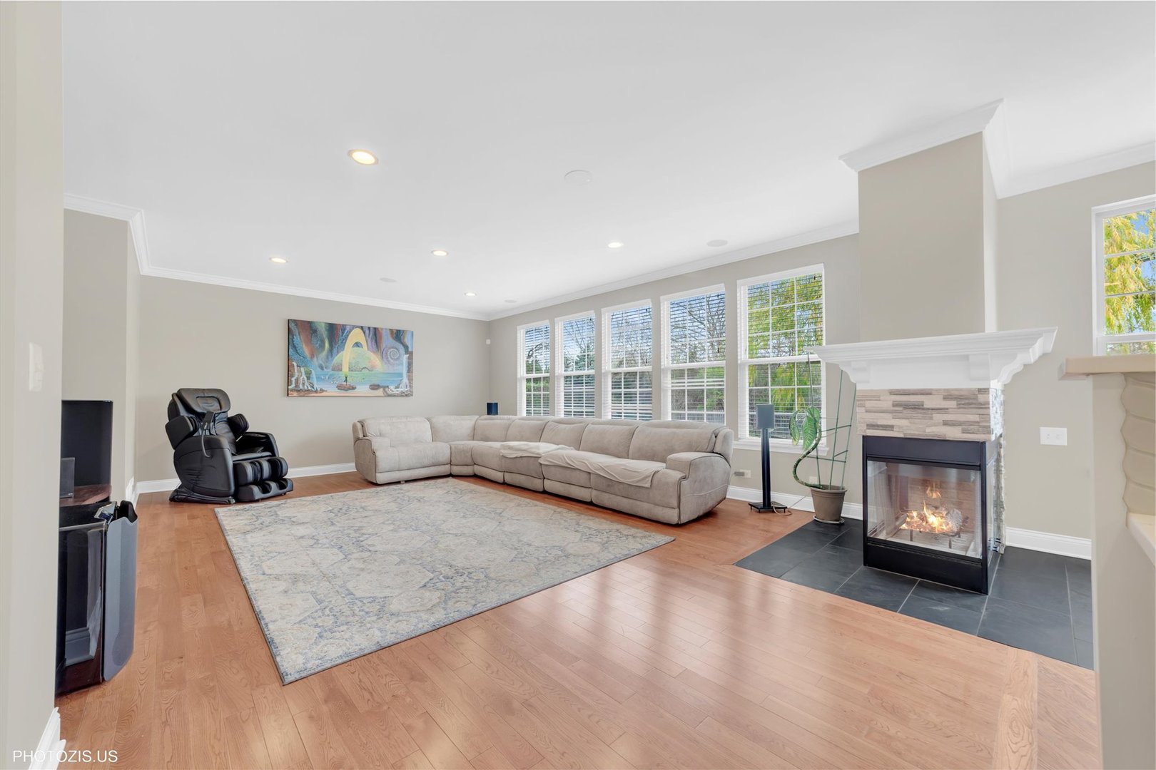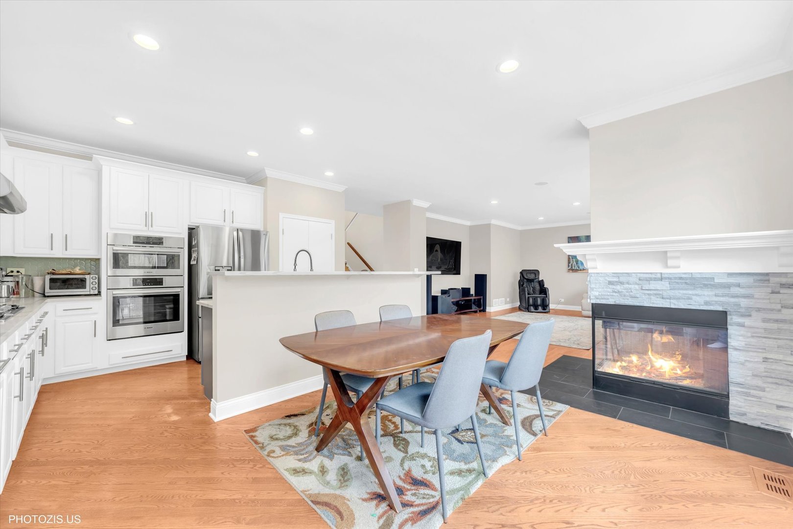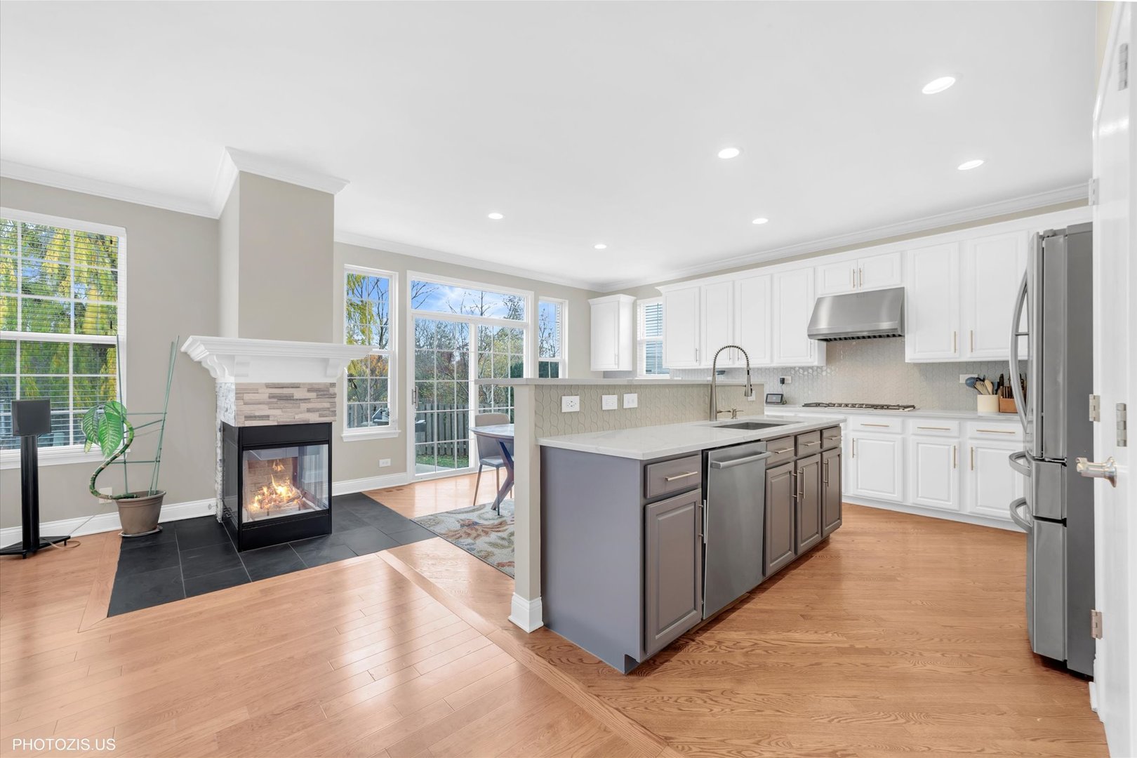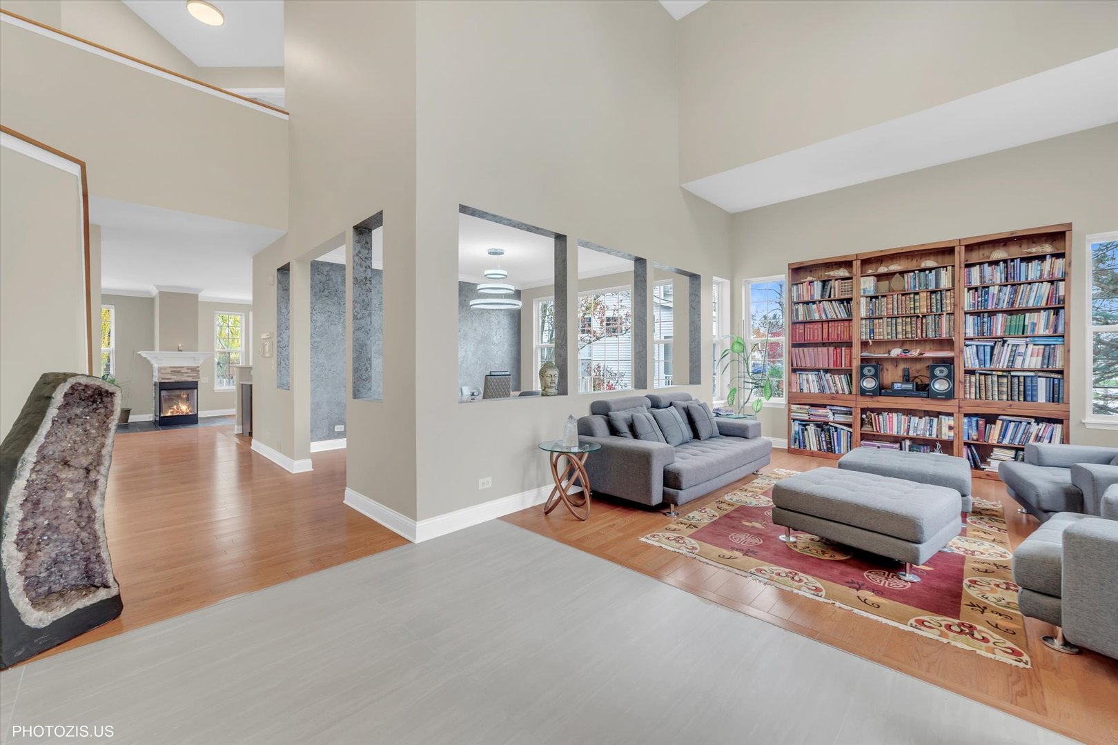 Beautiful Tressara Model in Mirielle – Stevenson High School District! Located on the largest lot in the subdivision, this updated 5-bedroom home features a striking light gray rock and Dryvit exterior and is just a short walk to Stevenson High School. The dramatic entry opens to a 18-foot living room ceiling and with 9-foot ceilings on the main level. The first floor offers hardwood floors, a three-sided fireplace connecting the family room and kitchen, and a first-floor bedroom/office with a full bath-ideal for in-law or guest arrangements. The remodeled 2020 kitchen includes 42-inch white cabinets and stainless steel appliances. The luxury primary suite features a separate shower, soaking tub, and walk-in closet. The full finished basement adds exceptional living space with a recreational room, meditation room, workout room, full bathroom, and an additional bedroom. Enjoy outdoor living on the expansive 650 sq ft concrete patio. Major updates include: roof (2019), zoned HVAC (2018), and exterior paint (2022). A wonderful home offering space, updates, and top-rated schools!