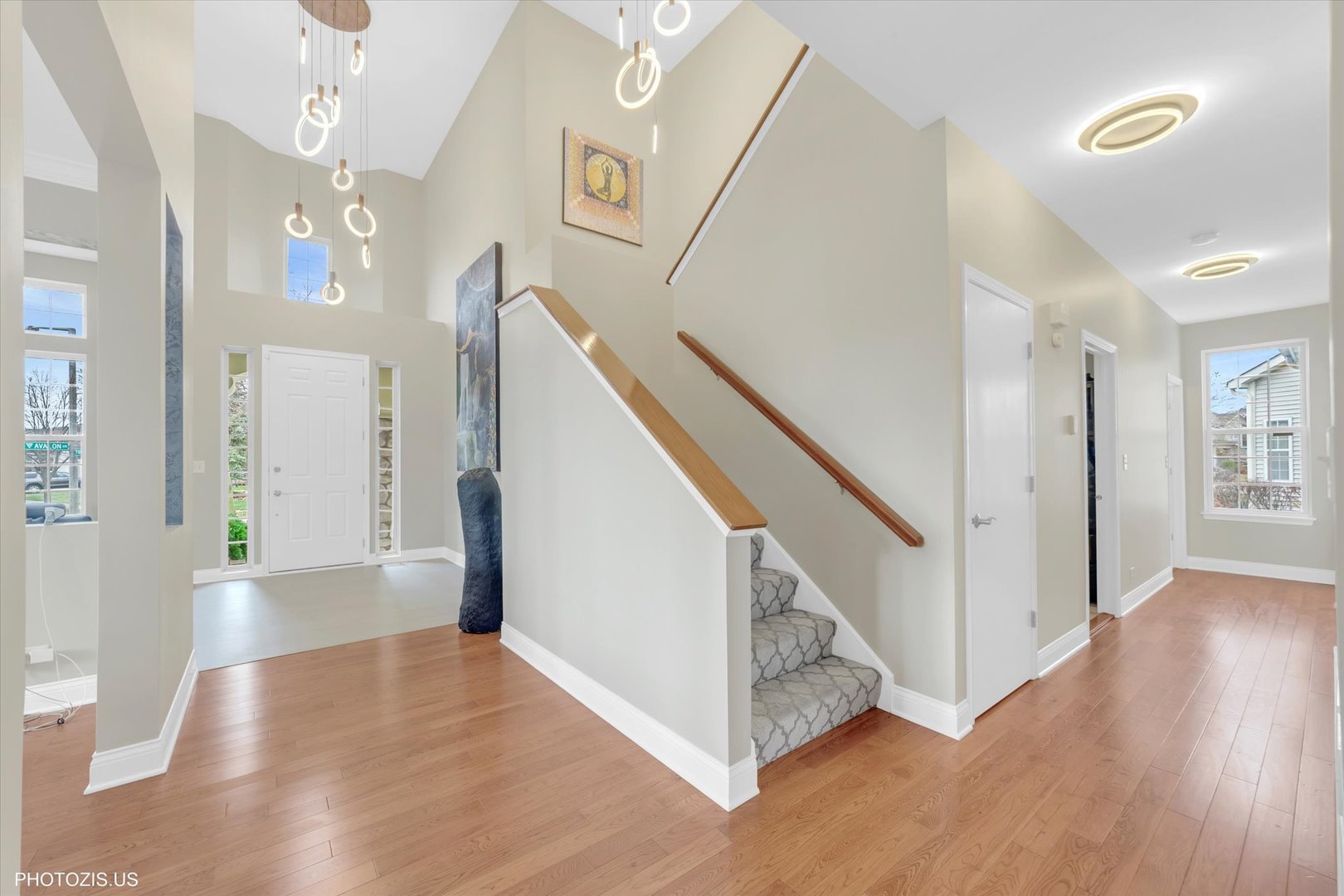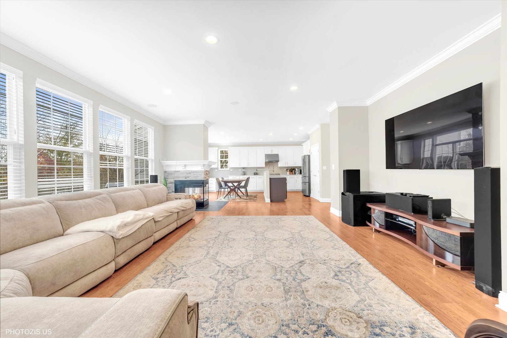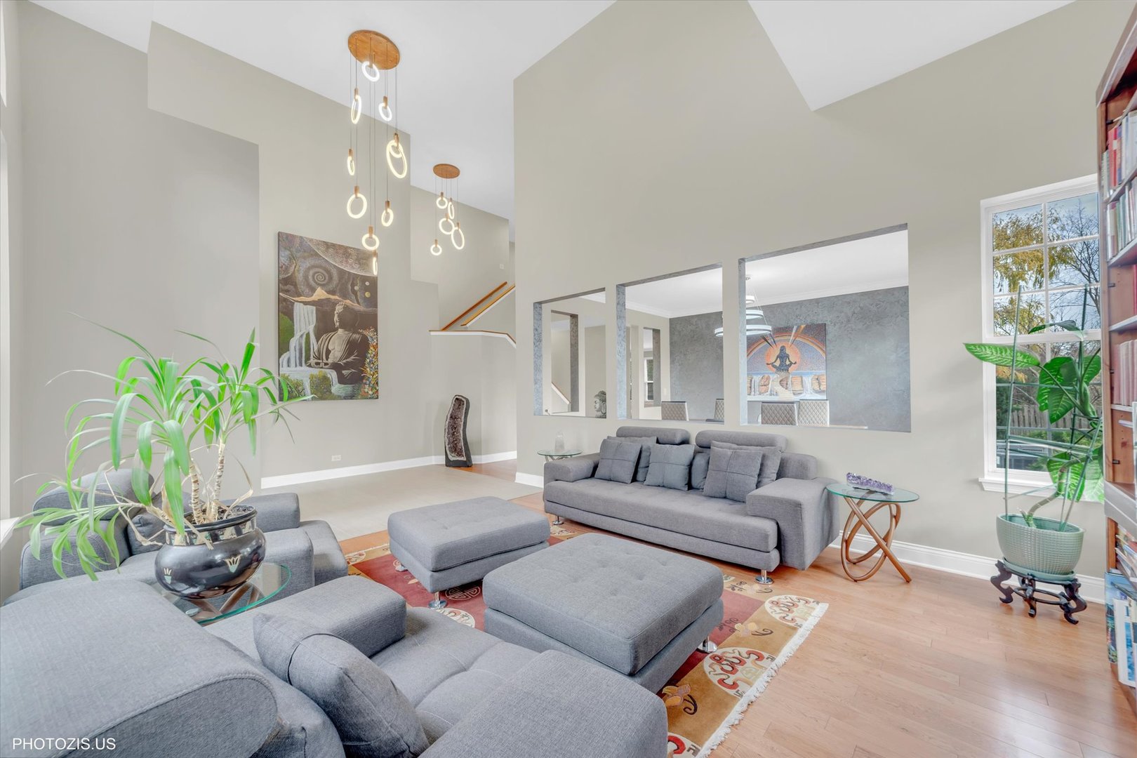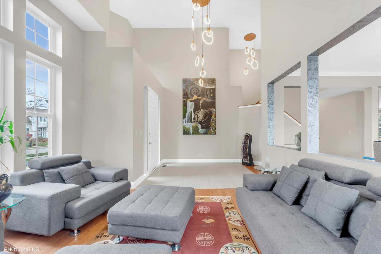 Beautiful Tressara Model in Mirielle – Stevenson High School District! Located on the largest lot in the subdivision, this updated 5-bedroom home features a striking light gray rock and Dryvit exterior and is just a short walk to Stevenson High School. The dramatic entry opens to a 18-foot living room ceiling and with 9-foot ceilings on the main level. The first floor offers hardwood floors, a three-sided fireplace connecting the family room and kitchen, and a first-floor bedroom/office with a full bath-ideal for in-law or guest arrangements. The remodeled 2020 kitchen includes 42-inch white cabinets and stainless steel appliances. The luxury primary suite features a separate shower, soaking tub, and walk-in closet. The full finished basement adds exceptional living space with a recreational room, meditation room, workout room, full bathroom, and an additional bedroom. Enjoy outdoor living on the expansive 650 sq ft concrete patio. Major updates include: roof (2019), zoned HVAC (2018), and exterior paint (2022). A wonderful home offering space, updates, and top-rated schools!
