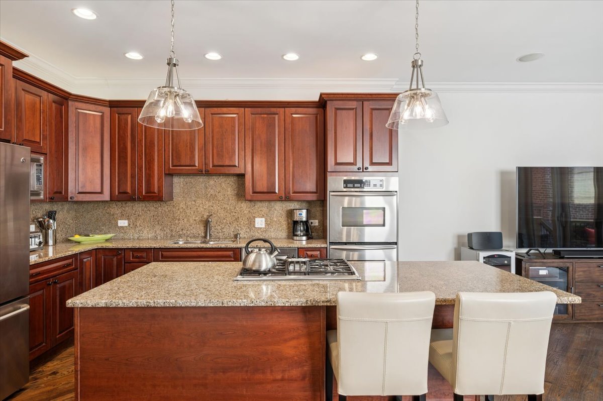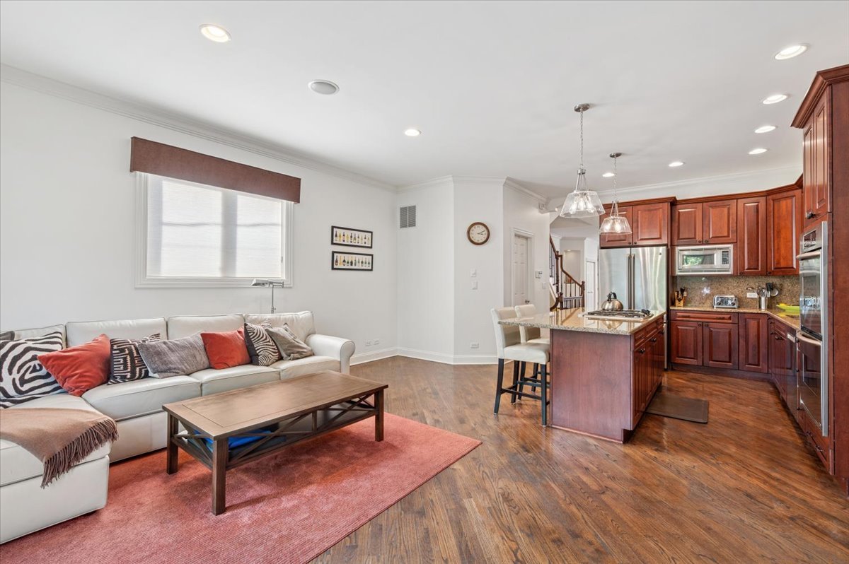 Located in the heart of West Town, this all-masonry single-family meticulously maintained home offers space, style, and four incredible outdoor areas-including a south-facing rooftop deck with stunning skyline views. Step into the spacious living room with bay window and fireplace, flowing into the dramatic dining space with soaring two-story ceiling. The spacious kitchen is perfect for cooking and entertaining, featuring granite countertops, 42-inch cabinetry, stainless steel appliances, an island with seating, and excellent prep and storage space. It opens to the family room, which leads out to a new deck ideal for grilling and a beautifully landscaped paver patio. Upstairs, the large primary suite boasts its own private deck, professionally organized walk-in closet, and spa-like bath with dual vanity, soaking tub, and separate shower. Two additional bedrooms, full bath, and laundry complete the second level. Interior stairs take you to the rooftop oasis with breathtaking city views. The lower level offers a large rec room, oversized bedroom, full bath, 2nd laundry room and abundant, custom-organized storage. A 2-car garage completes the package. Walk to restaurants, grocery stores, and transportation-this one has it all.
