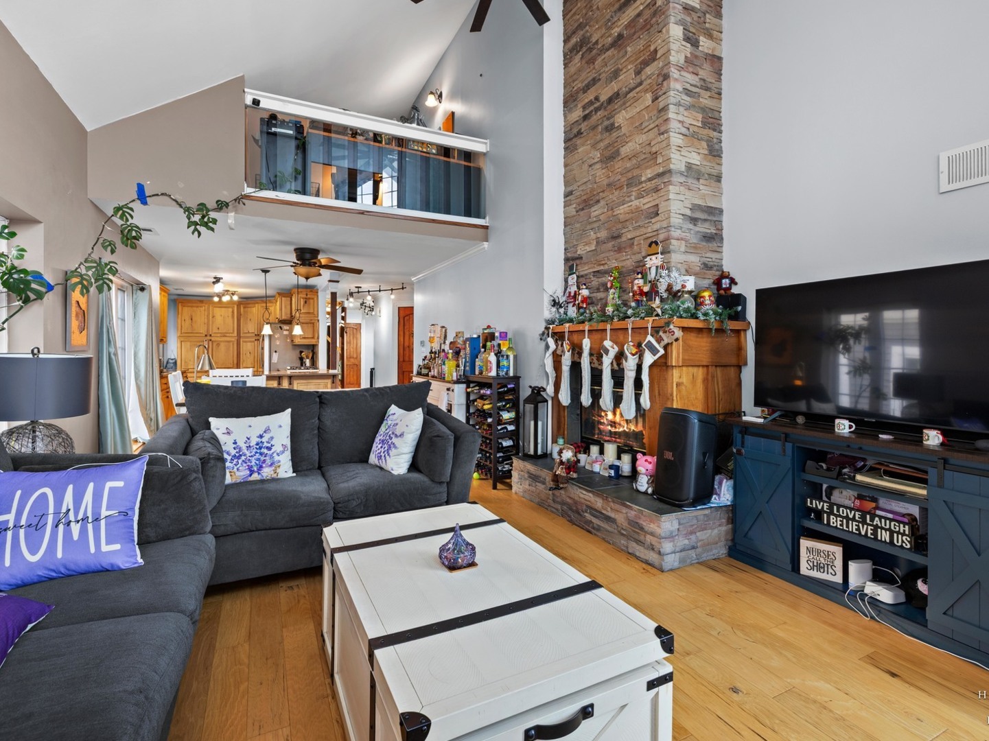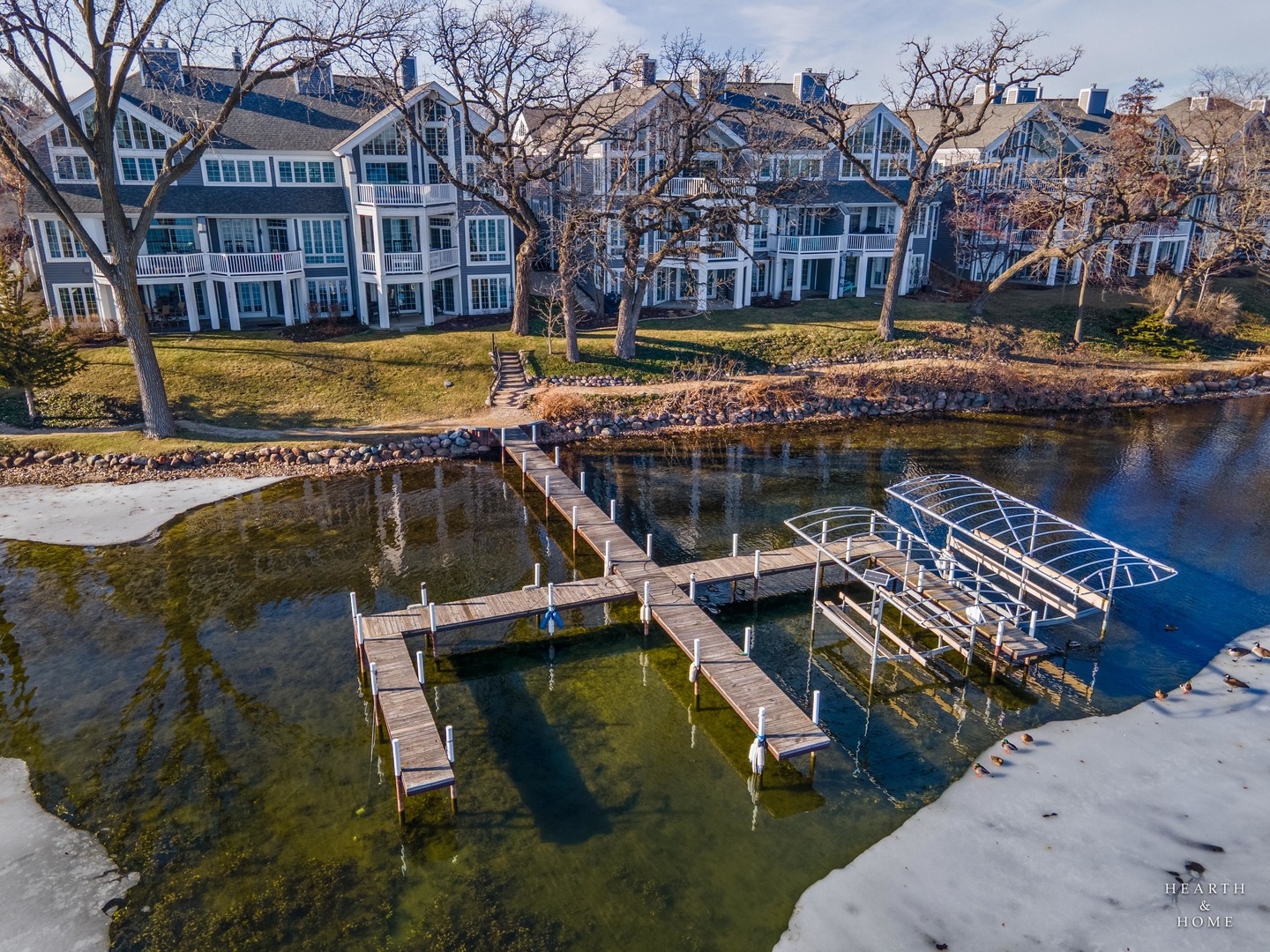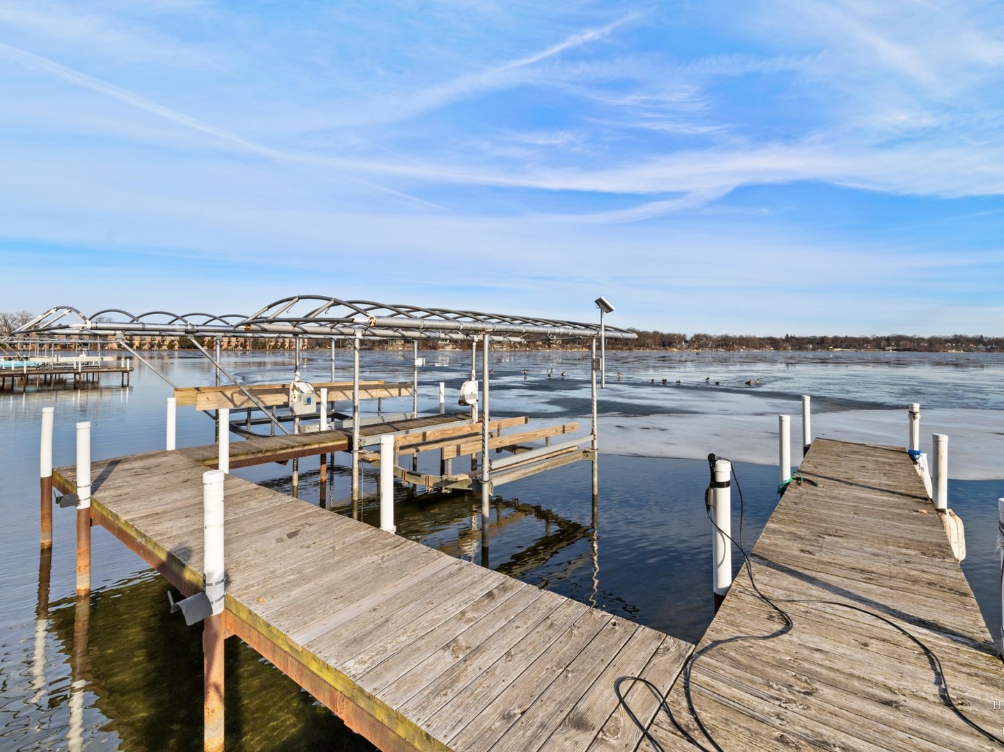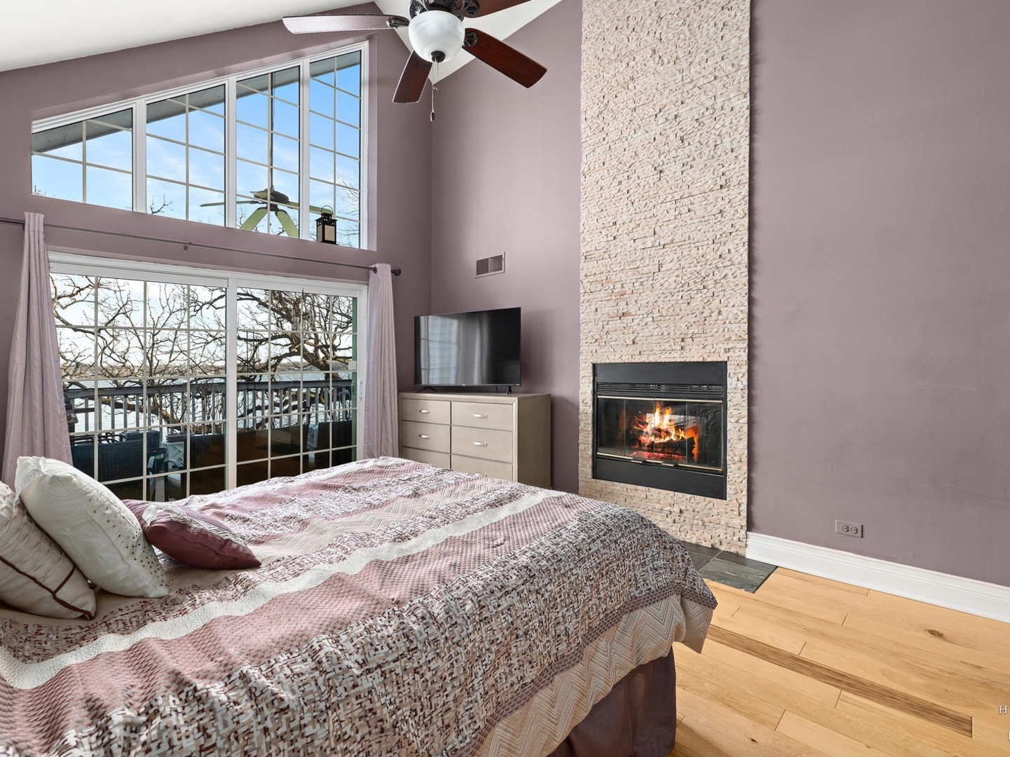 Wake up to lake views every day with this rare opportunity to live in the highly desirable Sandy Point community. From the moment you walk in, soaring ceilings and expansive windows frame the water. Everything you see is custom built from the trim to the doors to the beautiful staircase. Hardwood flooring runs through main level and all of the windows have been replaced. The kitchen features custom cabinetry with quartz countertops and updates including the stovetop and refrigerator. (2025) Unwind and cozy up taking in the lakeview in front of your dual sided fireplace. New washer and dryer (2025) This is the only unit with a second story loft addition, giving you an incredible work from home space or peaceful retreat overlooking the lake. There is also a cozy built in nook perfect for reading, relaxing or additional sleeping space when needed. The primary suite feels like a private getaway with its own deck facing the water and fireplace. No storage issues with three separate closets. Primary bath boasts a whirlpool tub with a separate shower and an updated shower door. (2022) The home also offers EV charger wiring and a full fire sprinkler suppression system for peace of mind. You will enjoy lake rights and your own private dock just steps from the home along with mature trees and quiet surroundings. You’re conveniently located just minutes away from shopping/dining and Paulus Park (playground, volleyball, picnic area and bike trails) Move in and enjoy lake living at Sandy Point. Welcome home.