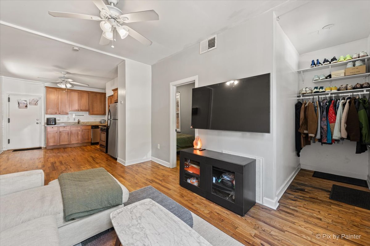 Welcome home to this beautiful 1-bedroom condo in the heart of Bucktown. This charming unit features hardwood floors throughout, a spacious eat-in kitchen with granite countertops, stainless steel appliances, and an open-concept living area perfect for relaxing or entertaining. A large picture window fills the living room with natural light, creating a bright and inviting space. The bedroom comfortably fits a queen bed, nightstand, and dresser, with ample closet space throughout the unit. Enjoy the convenience of in-unit laundry and additional storage. Ideally located just steps from Holstein Park, close to the Blue Line, and surrounded by Bucktown’s best shops, restaurants, and cafes. Easy street parking available right outside on Shakespeare. This move-in-ready home offers the perfect blend of comfort and location-don’t miss it!