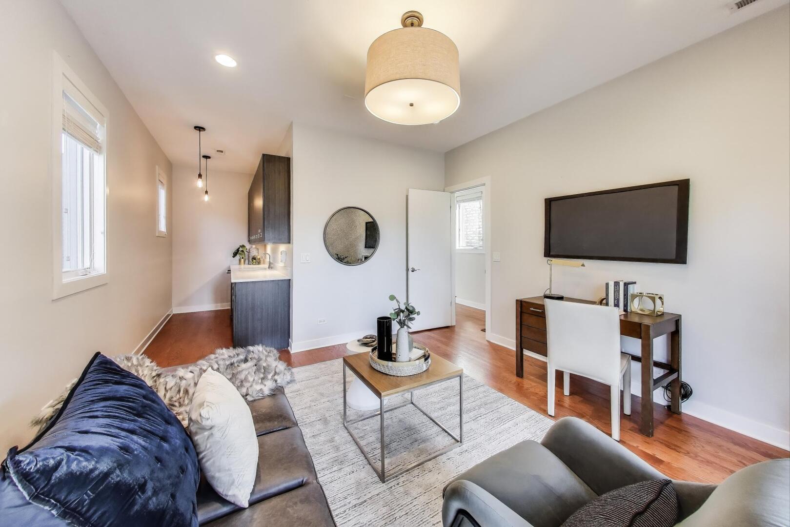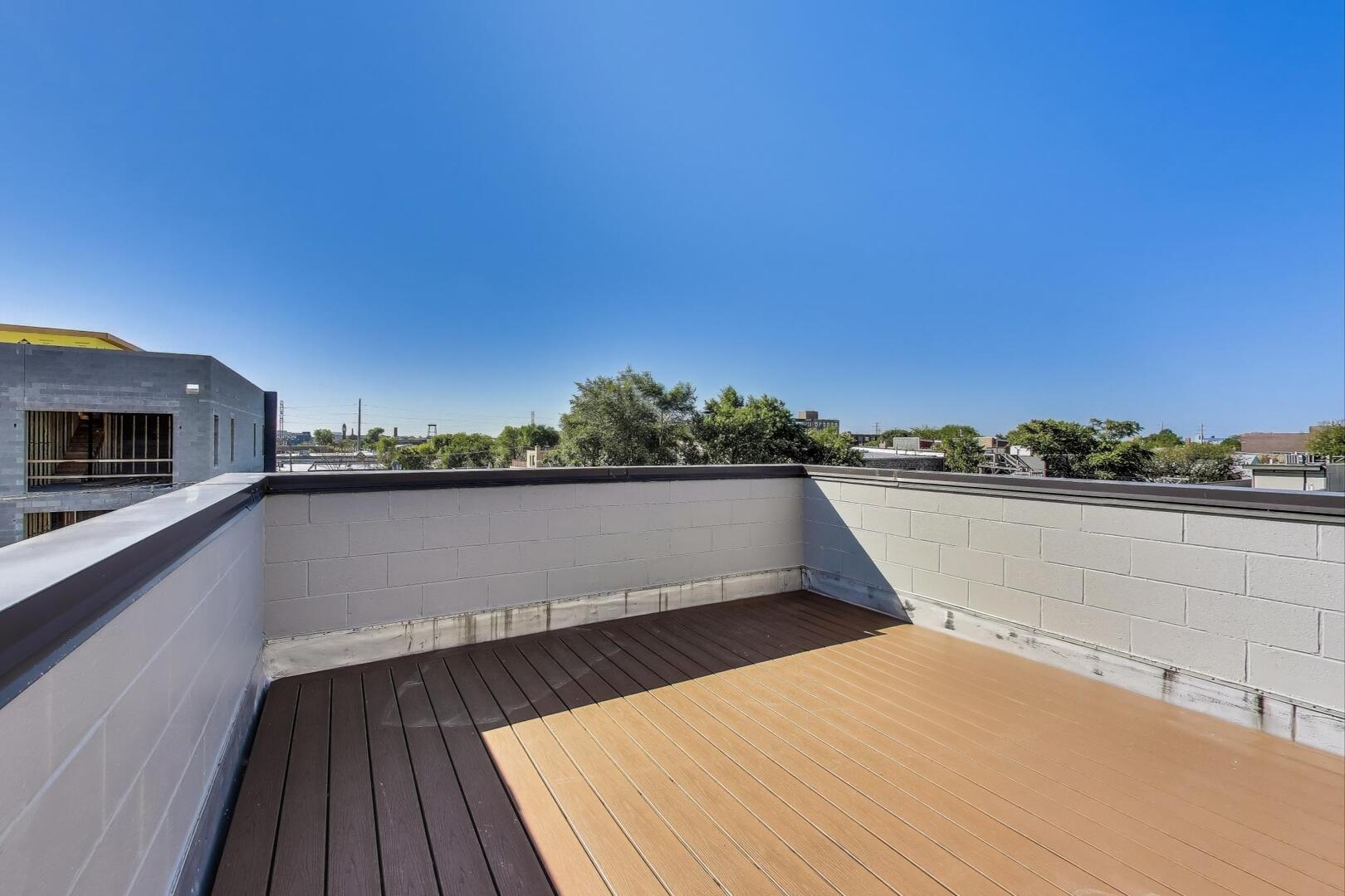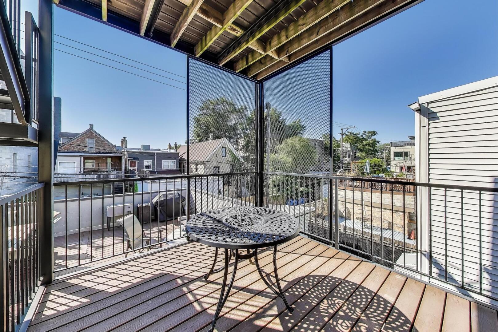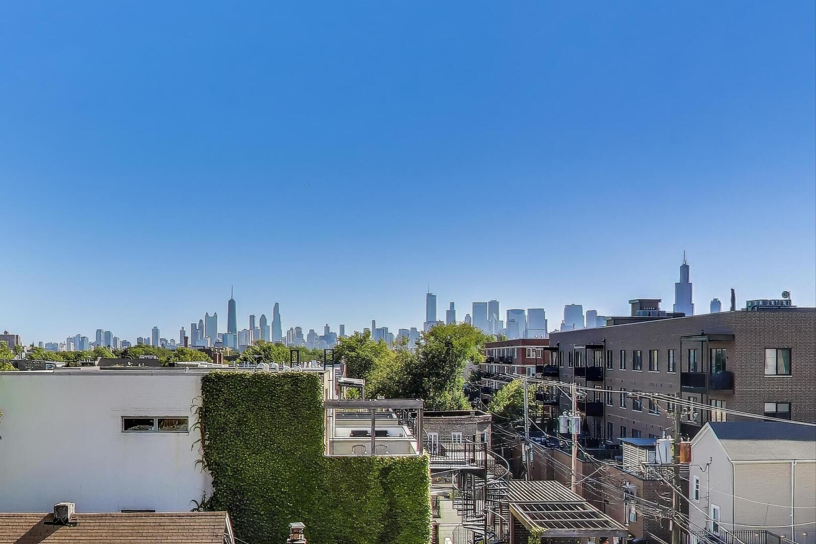 This updated 3-bedroom, 2-bath duplex-up sits on a quiet West Town street and delivers the perfect mix of modern updates, flexible living, and serious outdoor space. The main level features a bright, open-concept kitchen/living/dining area with soaring ceilings and oversized windows that flood the home with natural light. Down the hall, you’ll find a full bathroom and the first of the home’s three bedrooms, featuring a built-in wet bar and tons of storage, making it an ideal flex space-think guest suite, family room, office, gym, or any combination your life demands. A rear balcony (the first of FOUR private outdoor spaces) rounds out this level. Upstairs, the primary suite is a true retreat with a massive, professionally designed walk-in closet and a spa-like en-suite bathroom featuring double sinks and a large walk-in shower. This level also has laundry (new in 2025), the third bedroom and ANOTHER rear balcony. Head up one more flight and you’ll find not one, but TWO private rooftop decks with sweeping city views-perfect for entertaining, lounging, or both. With that much outdoor space, your options are endless. Additional highlights include garage parking and the intimacy of a two-unit building. All just steps from the best of West Town: Smith Park (with tennis and pickleball courts), Publican Quality Bread, Tuman’s, Dark Matter Coffee, All Together Now and more, plus easy highway access.