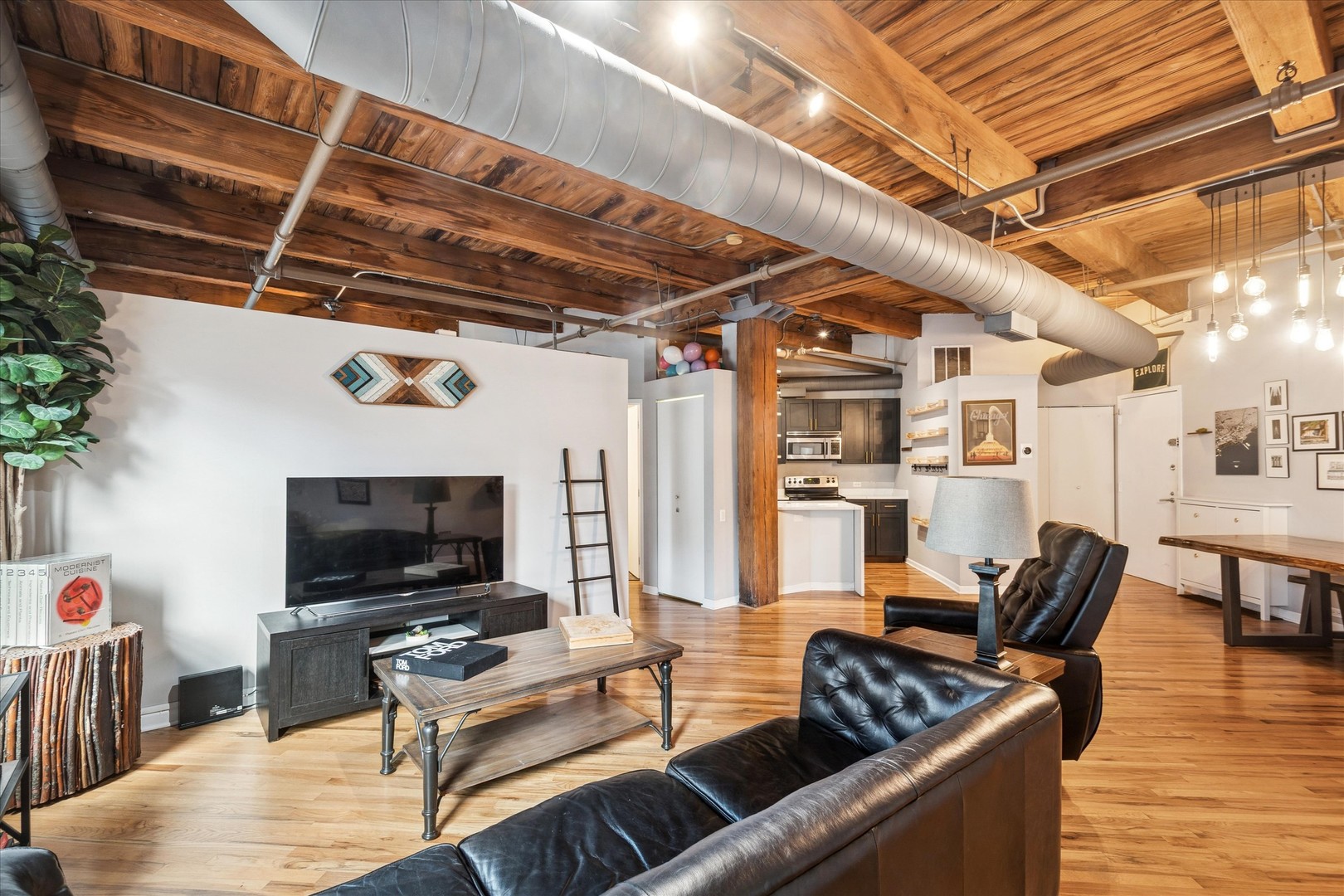 Located in the heart of River North, this 1 bed / 1 bath loft has a great layout featuring exposed brick, timber beams, and hardwood floors throughout giving it a cool urban vibe. The combined living and dining area is bright and inviting. The renovated kitchen boasts sleek quartz countertops with a waterfall edge, stainless steel appliances, a wine fridge, and modern lighting. The large bedroom fits a king bed and has a full wall of closets. The updated bath is spacious and features on-trend tile. Facing Franklin Street, the unit is thoughtfully equipped with soundproof windows and insulated walls, ensuring peaceful living above the city and train. Additional highlights: in-unit laundry, new HVAC (2021), and Nest thermostat. Pet-friendly, professionally managed elevator building with low assessments, doorman, gym, rooftop deck with city views, and extra storage. Steps to dining, shopping, fitness, and transit. Experience the best of urban living!