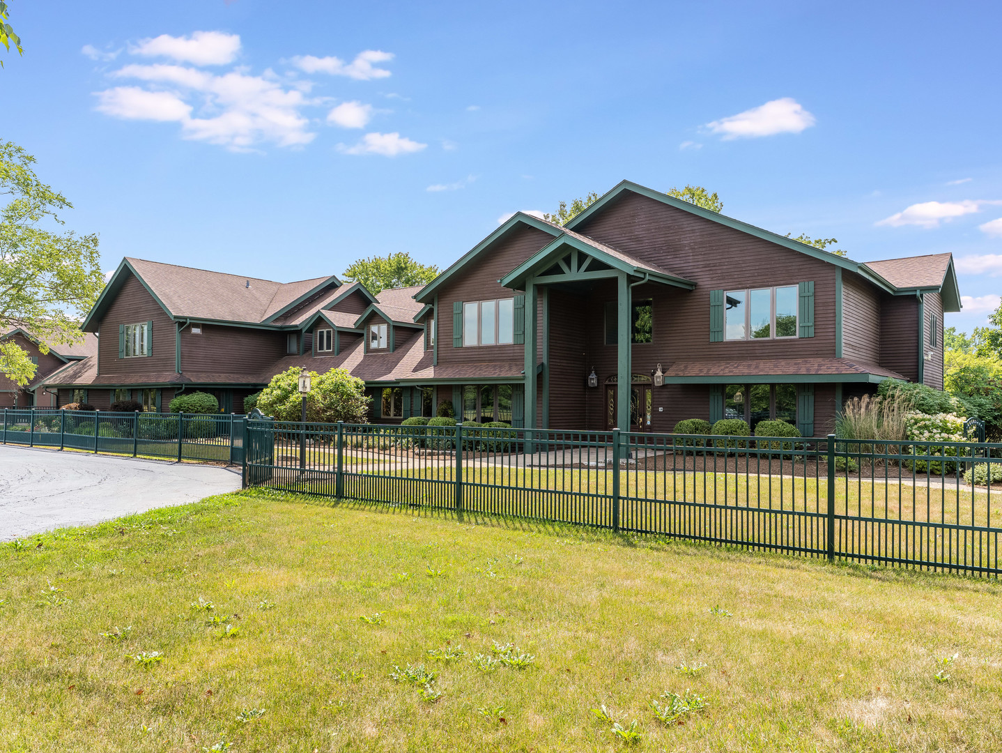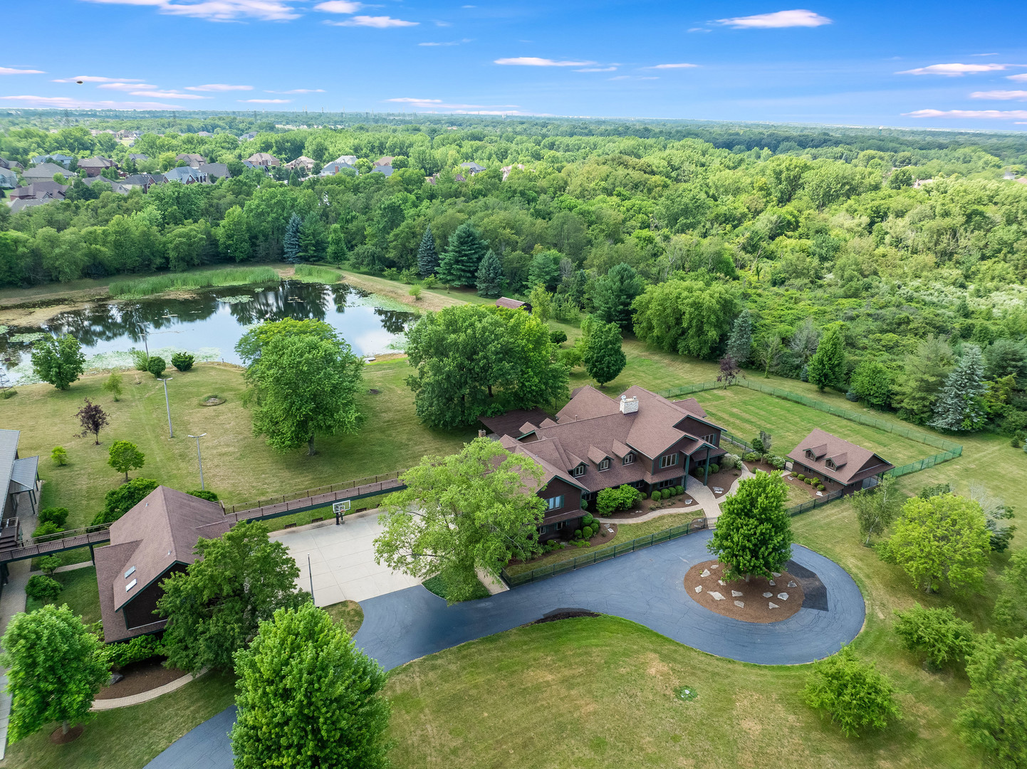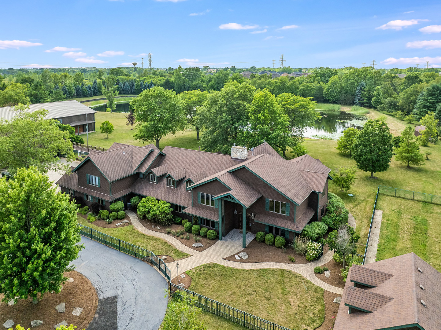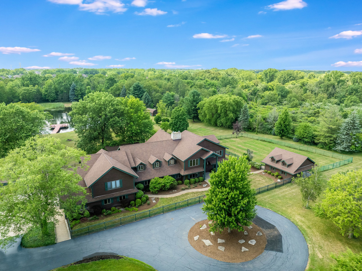 Welcome to this extraordinary 22-acre multi-use sprawling estate in Frankfort. Offering a rare combination of luxury living, endless potential, and tranquil surroundings-just minutes from shopping, dining, interstate access, and highly rated schools. This luxury listing features 4 structures – the main 2-story single family home, a large detached guest house, a storage building/animal boarding building, plus your very own gymnasium! Privately gated and meticulously designed, the main 9-bedroom, 6.5-bath residence features Brazilian cherry inlay hardwood floors, a luxury chef’s kitchen, a first-floor office, and a stunning see-through fireplace in the family room with soaring 24-foot vaulted ceilings and floor-to-ceiling windows showcasing panoramic backyard views of the wildlife and private pond. The main floor includes three bedrooms, while the second floor offers five more, including a spacious primary guest suite with a private sitting area, two large walk-in closets, and deck access via an elevated crosswalk connecting three buildings – plus an adjacent work out room or studio. The finished basement is an entertainer’s dream, complete with radiant heated floors, a full guest suite, family room with a dramatic all-stone two-sided fireplace, and a wine cellar. The home features a central vacuum and sound system, an exterior camera monitoring system, and is wired for a commercial grade fire alarm system. The detached guest home offers studio-style/loft living with 1.5 baths, two extra shower stalls, an 18-foot custom built bar, private deck access, and crosswalk views of the serene 3-acre fully stocked pond. An 11,000 sq ft ADA-compliant gymnasium includes sport court flooring for basketball, pickleball, and volleyball, a dance studio, lofted workout space, radiant heated floors, and multiple bathrooms with shower stalls for your guests. The gym has been wired and piped for a full fire protection system allowing for future assembly usage. The sport court flooring is removable, allowing conversion into a custom garage space that can house up to 50 vehicles. Also included is a fourth structure-a cedar-lined luxury dog house featuring heated floors, a camera system, four dog bays, and a separate fenced dog run. Zoned R2 with an approved permit for a PUD (planned unit development), this property presents endless possibilities: a single family estate, retreat center, ministry headquarters, equestrian estate, group home of less than 8 residents, or potential new home development. A unique opportunity-12 subdividable lots are included in this sale and connect to the neighboring community, offering even more value and flexibility. The lots could be developed with the adjacent neighborhood or included with this dream property. This one-of-a-kind property must be seen to be fully appreciated! EM payable via certified funds to Coldwell Banker Real Estate Group. Building breakdown: Home 8,740 sf (9BR/6.5BA), Guest House 1,409 sf (Studio BR/1BA), Gym 11,000 sf (0BR, 3 half BA), Dog House 336 sf (0BR/0BA).