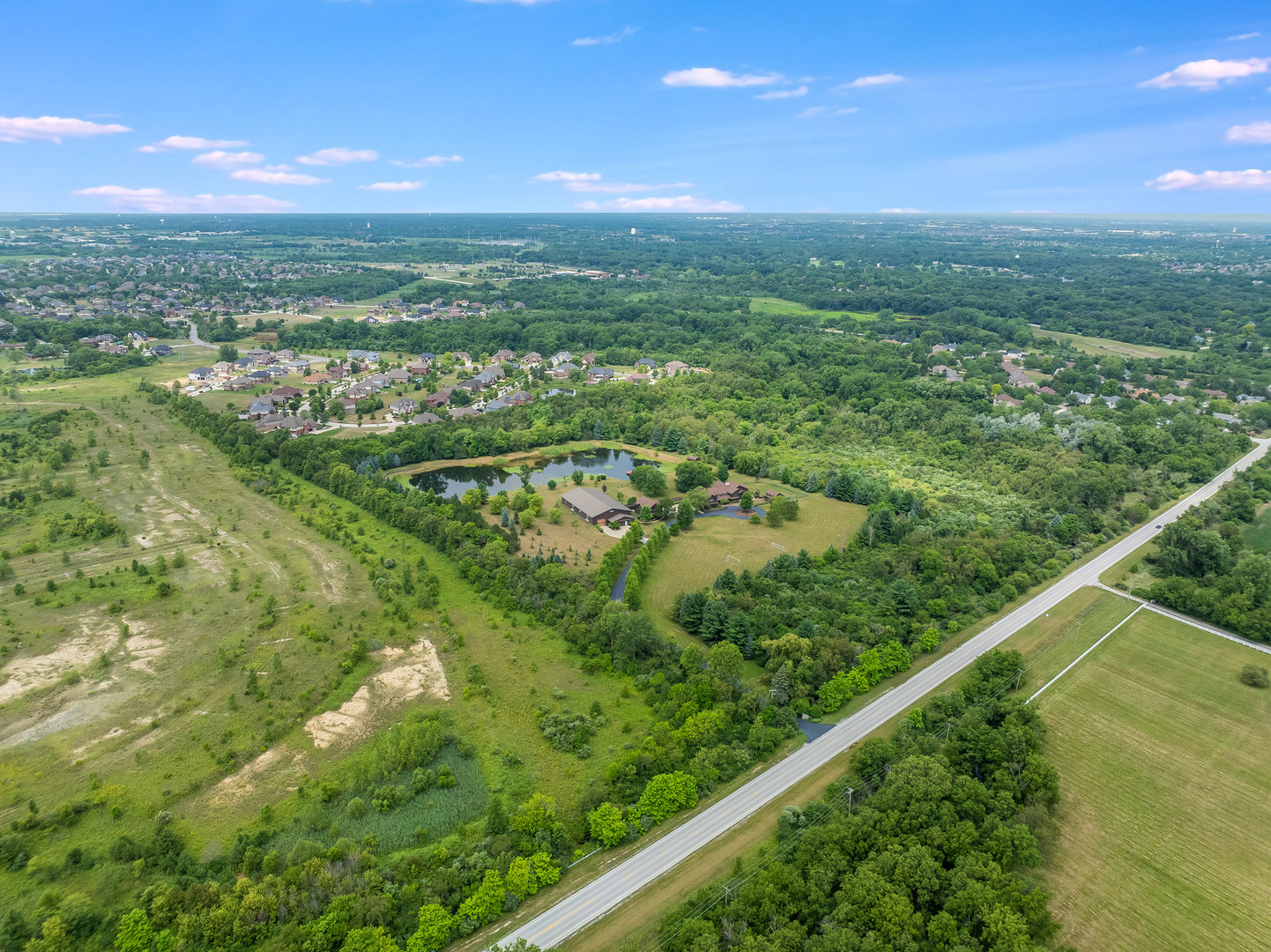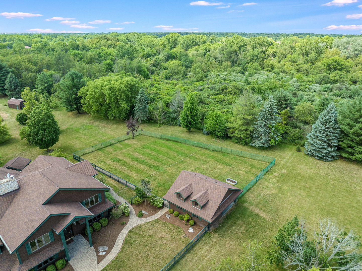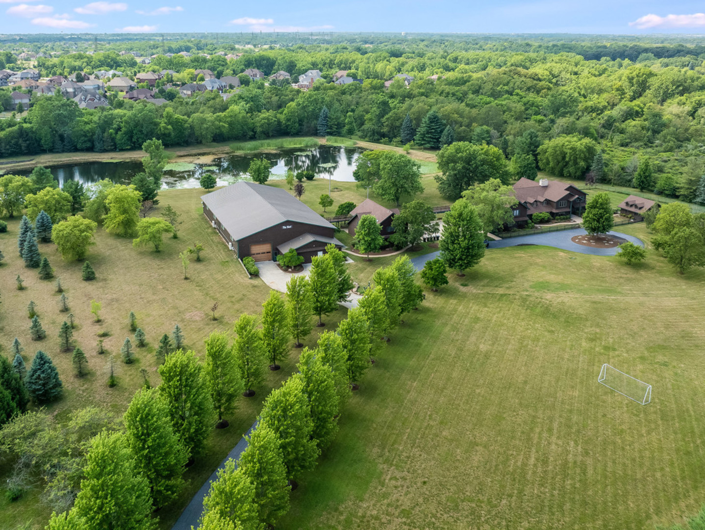 Welcome to this extraordinary 22-acre multi-use sprawling estate in Frankfort. Offering a rare combination of luxury living, endless potential, and tranquil surroundings-just minutes from shopping, dining, interstate access, and highly rated schools. This luxury listing features 4 structures – the main 2-story single family home, a large detached guest house, a storage building/animal boarding building, plus your very own gymnasium! Privately gated and meticulously designed, the main 9-bedroom, 6.5-bath residence features Brazilian cherry inlay hardwood floors, a luxury chef’s kitchen, a first-floor office, and a stunning see-through fireplace in the family room with soaring 24-foot vaulted ceilings and floor-to-ceiling windows showcasing panoramic backyard views of the wildlife and private pond. The main floor includes three bedrooms, while the second floor offers five more, including a spacious primary guest suite with a private sitting area, two large walk-in closets, and deck access via an elevated crosswalk connecting three buildings – plus an adjacent work out room or studio. The finished basement is an entertainer’s dream, complete with radiant heated floors, a full guest suite, family room with a dramatic all-stone two-sided fireplace, and a wine cellar. The home features a central vacuum and sound system, an exterior camera monitoring system, and is wired for a commercial grade fire alarm system. The detached guest home offers studio-style/loft living with 1.5 baths, two extra shower stalls, an 18-foot custom built bar, private deck access, and crosswalk views of the serene 3-acre fully stocked pond. An 11,000 sq ft ADA-compliant gymnasium includes sport court flooring for basketball, pickleball, and volleyball, a dance studio, lofted workout space, radiant heated floors, and multiple bathrooms with shower stalls for your guests. The gym has been wired and piped for a full fire protection system allowing for future assembly usage. The sport court flooring is removable, allowing conversion into a custom garage space that can house up to 50 vehicles. Also included is a fourth structure-a cedar-lined luxury dog house featuring heated floors, a camera system, four dog bays, and a separate fenced dog run. Zoned R2 with an approved permit for a PUD (planned unit development), this property presents endless possibilities: a single family estate, retreat center, ministry headquarters, equestrian estate, group home of less than 8 residents, or potential new home development. A unique opportunity-12 subdividable lots are included in this sale and connect to the neighboring community, offering even more value and flexibility. The lots could be developed with the adjacent neighborhood or included with this dream property. This one-of-a-kind property must be seen to be fully appreciated! EM payable via certified funds to Coldwell Banker Real Estate Group. Building breakdown: Home 8,740 sf (9BR/6.5BA), Guest House 1,409 sf (Studio BR/1BA), Gym 11,000 sf (0BR, 3 half BA), Dog House 336 sf (0BR/0BA).