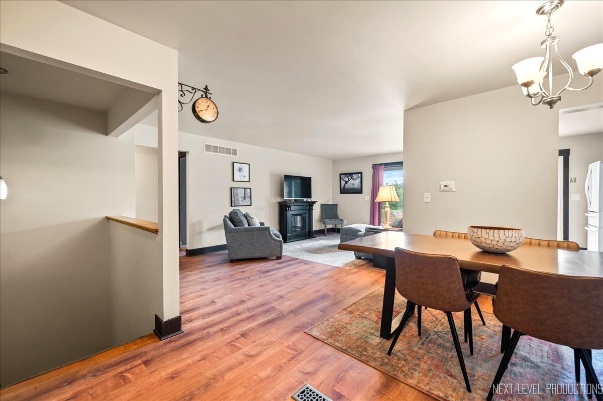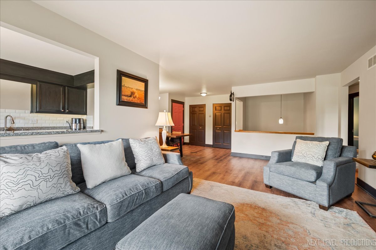 Don’t miss this beautifully updated 1st floor ranch style condo available in highly sought-after Timbers subdivision. Located in the heart of historic downtown St. Charles, you’ll enjoy the active lifestyle of this riverfront community with easy access to hiking and biking trails, the vibrant downtown St. Charles scene, and nearby Geneva and Batavia. From Farmer’s Markets and festivals to fine dining and boutique shopping, this location and home are equally exceptional! The inviting entry leads into a spacious and sun-filled living room with laminated hardwood flooring throughout. The remodeled kitchen features granite countertops, a breakfast bar with pass-through to the living room, and a separate dining room space, perfect for entertaining! Enjoy indoor-outdoor living with 2 sets of sliding glass doors opening to a private patio and overlooking an expansive green common area with beautiful views of the Fox River and Pottawatomie Park and Boy Scout Island in close proximity. The large primary suite offers a remodeled ensuite bath and a walk-in closet, while the 2nd bedroom provides equally ample space and includes another full remodeled bath. And, the adjoining hallway allows for easy access to the attached garage. The kitchen, baths and primary bedroom are all newly (professionally) painted in modern, neutral tones. Downstairs, the finished lower level offers a large and private family room-perfect as a guest suite, teen retreat, gym or media room. It includes an additional bedroom and another full, updated bath and mechanical room with workshop space. Recent updates including: water softener, stove and sump pump replaced in (’25), washer/dryer (’22), hot water heater, new carpet on stairs, new doors and primary bath update (’20), HVAC (’19), windows (’15). Whether you’re just starting out or simplifying life, this home offers the ideal blend of space, style and location!