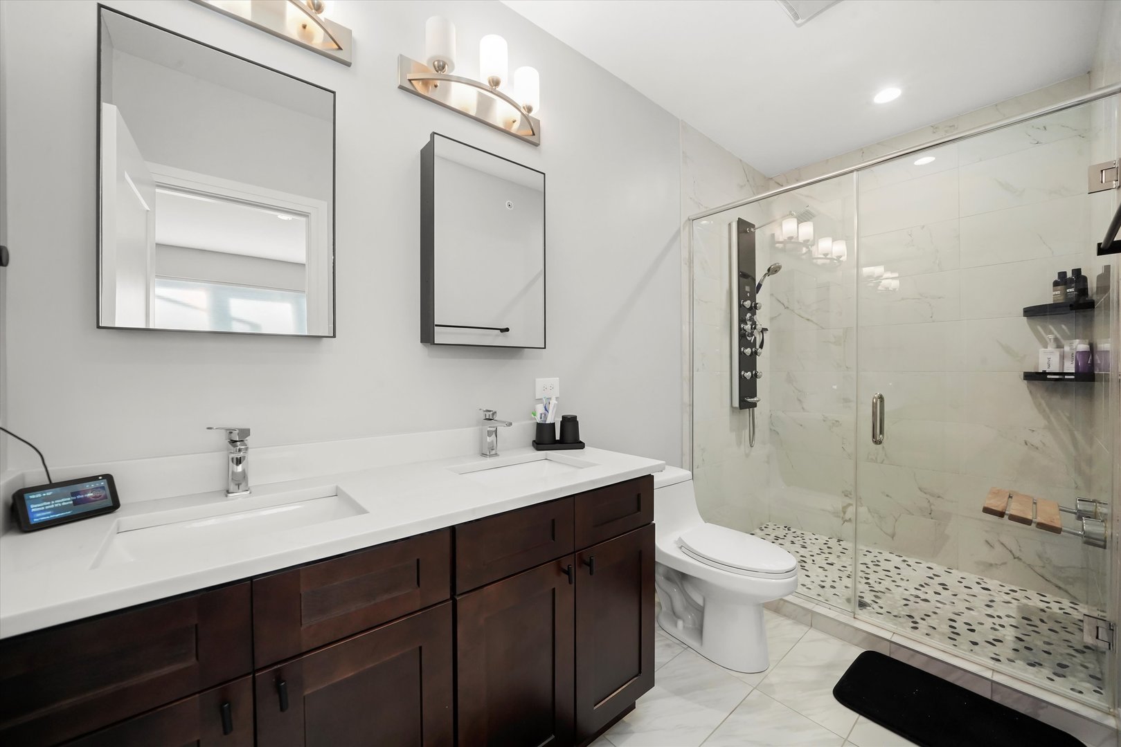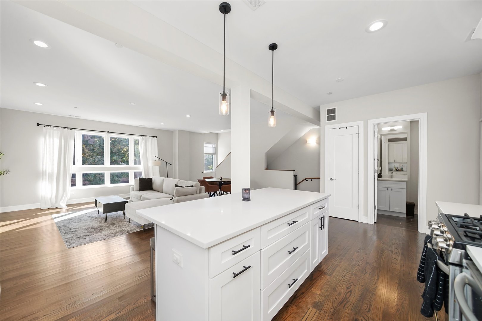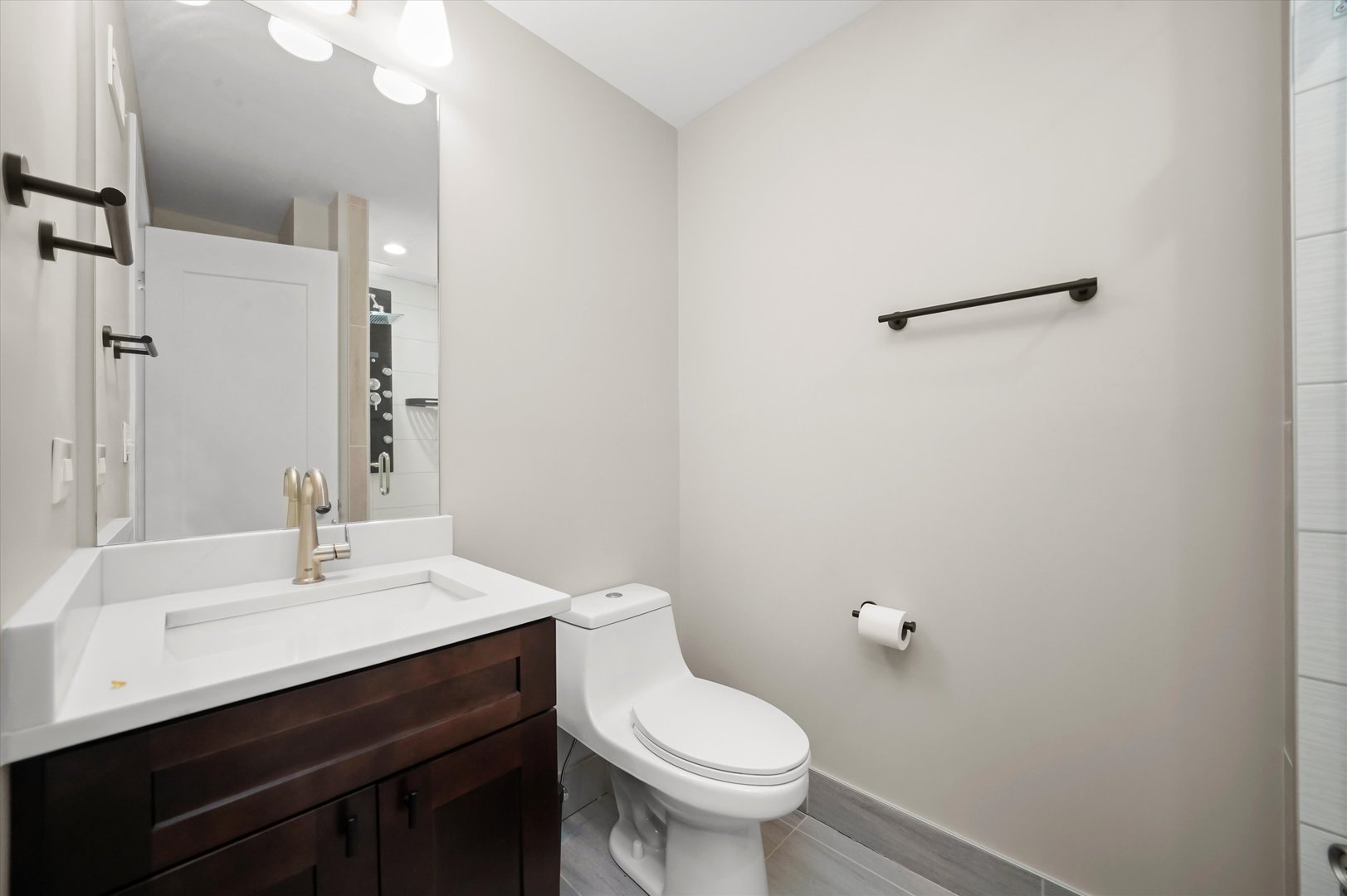 Modern Luxury in the Heart of Elmwood Park Sleek and sophisticated, this stunning home newly built in 2020. Featuring 3 bedrooms, 3.5 baths, and an attached 2-car garage with an electric vehicle charger and extra parking pad, this home perfectly blends modern design with everyday functionality. The smart and versatile layout begins with a first floor bedroom and full bath ideal for guests, a home office, or a private retreat. The second level impresses with an open concept living, dining, and kitchen area centered around a stylish 50″ electric fireplace with elegant tile surround. The sleek kitchen features Shaker cabinetry, quartz countertops, and an LG appliance package. A convenient half bath and spacious deck off the main living area make this space perfect for entertaining. Upstairs, the primary suite is a true retreat featuring a spa-like bath with an oversized rain and body-spray shower with bench, double vanity, and luxury finishes. An additional bedroom and full bath with a jetted soaking tub complete this level. High-end finishes are found throughout, including rich stained oak hardwood floors, solid-core doors, a tankless water heater, high-efficiency HVAC, and a built-in fire sprinkler system for safety and peace of mind. Additional highlights include existing weights and gym equipment that can stay. The HOA covers common insurance, landscaping, and snow removal making this home truly move-in ready. Schedule your appointment today!