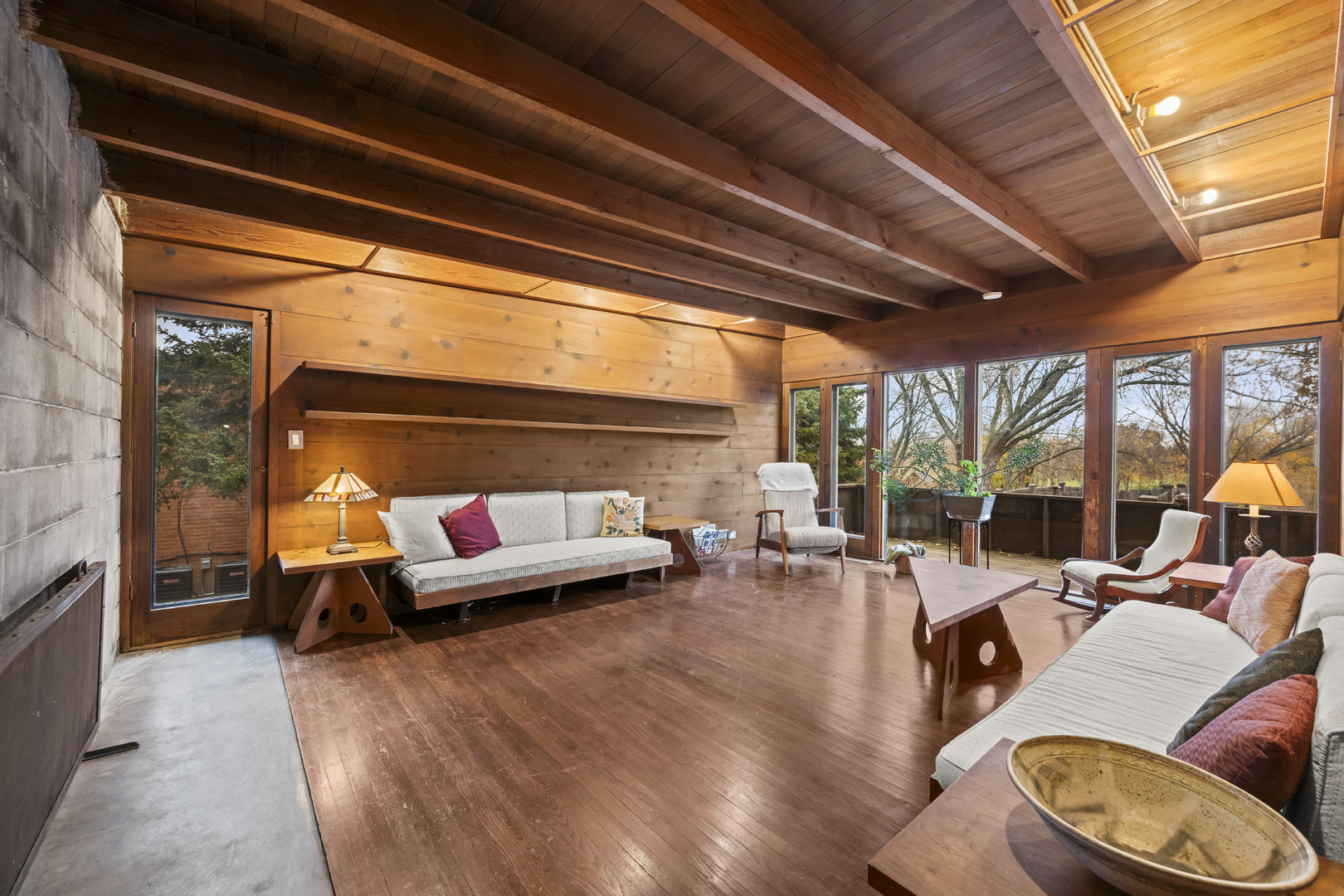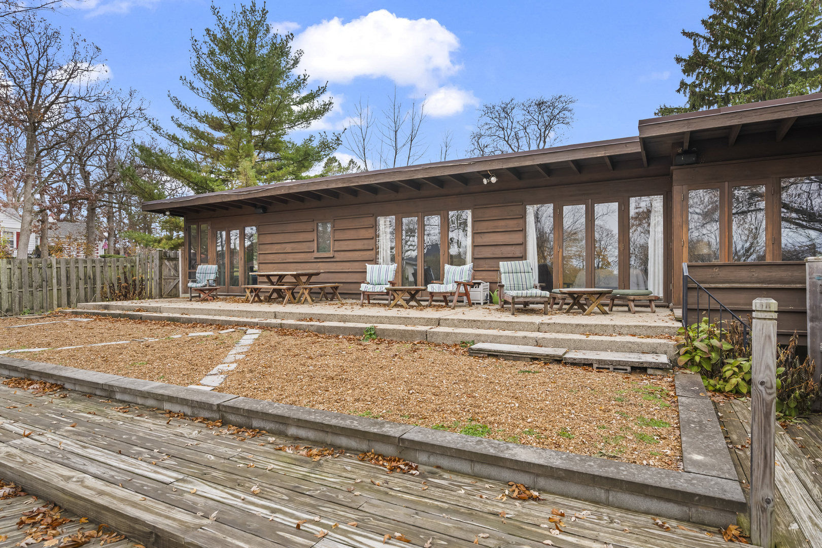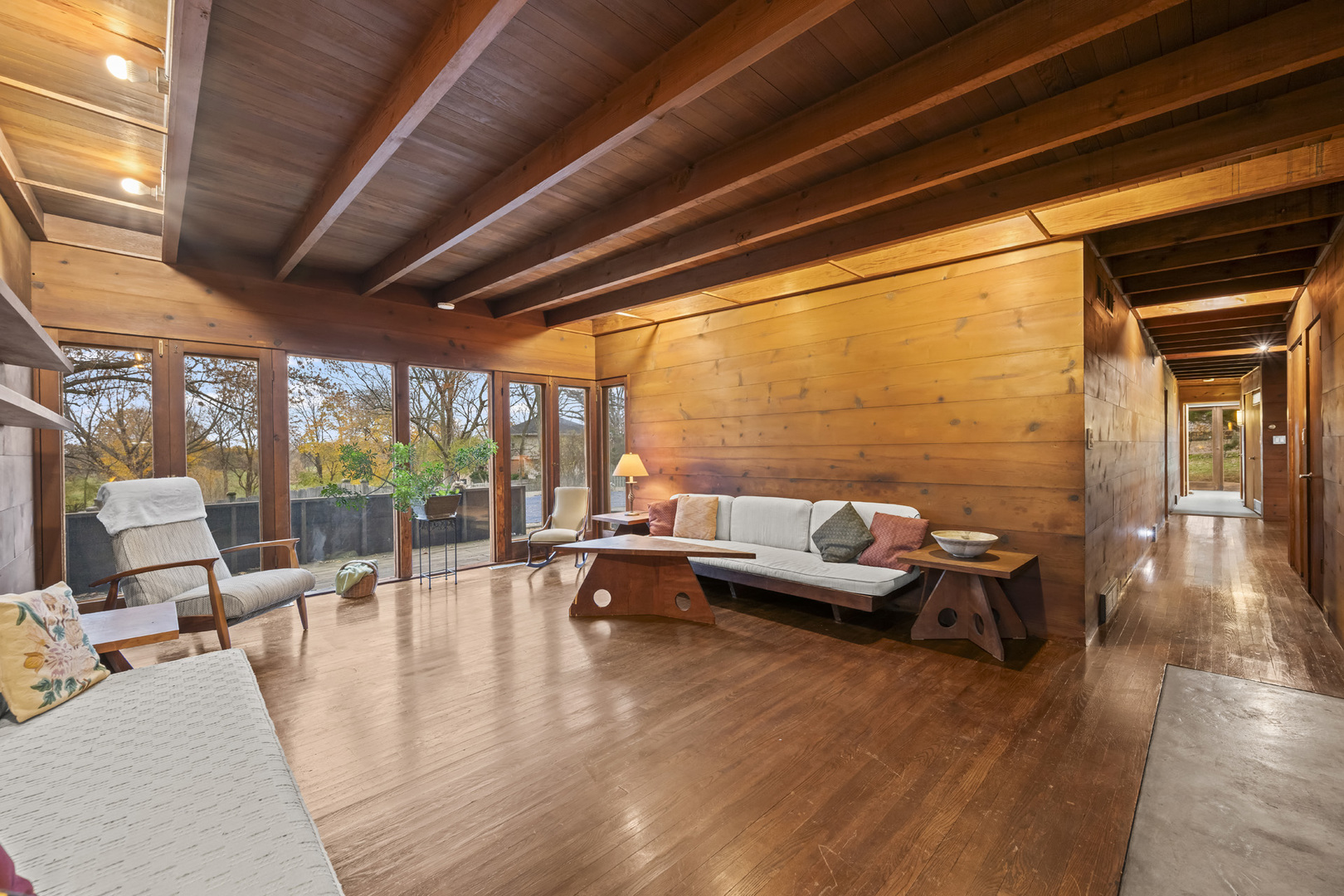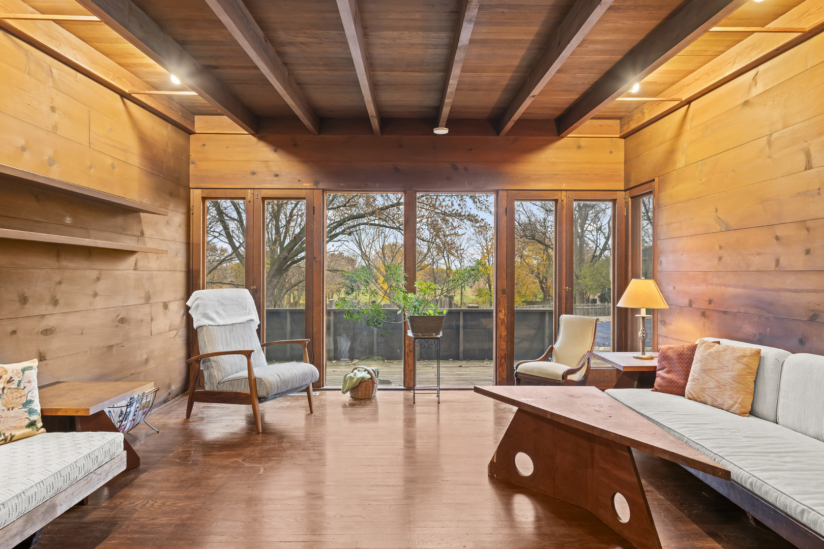 First time on the market! This fantastic 1953 Mid-Century Modern ranch designed by Edward Humrich has been in the same family since it was built! Sitting on a gorgeous lot of almost an acre, and backing to the Bonnie Brook Golf Course, this MCM beauty will delight with it’s classic Midwest mid-century features like walls of windows, wood paneled walls, plank & beam ceilings, modular block fireplace and more. Fantastic living room with fireplace and great modernist details will include the 2 sofas and 5 coordinating tables. The home was expanded in the past with the addition of a new two-car garage in the exact same style as the rest of the house, with the former carport enclosed and converted into a large kitchen & dining area that features all stainless appliances as well as heated floors and additional storage. In addition to the three bedrooms (all with hardwood floors) and two bathrooms you’ll find a laundry area, large storage closet, a small office and a screened-in porch on the south side of the house. Outside, you’ll love the huge lot and the fantastic 40,000 gallon heated pool – 9 feet at the deepest end, and complete with diving board. The lot slopes gently toward the Bonnie Brook Golf Course, and enjoys privacy from numerous mature trees. Partial basement has a 1/2 bath that’s also plumbed for a shower, and offers great storage space and access to the outside. Mid-Century Modern homes have increased significantly in value over the past 5 years, so this home represents a fantastic opportunity to get into a modern home designed by a notable architect for a great price and in a beautiful setting! New AC this year. Half bath in basement refreshed in 2025 as well. Two main level baths remodeled in 2021. Furnace replaced in 2017. Washer & Dryer replaced in 2018. Dishwasher replaced in 2020. Modbit roof redone in 2009 with chimney flashing upgraded in 2022. Garage door opener replaced 2025.