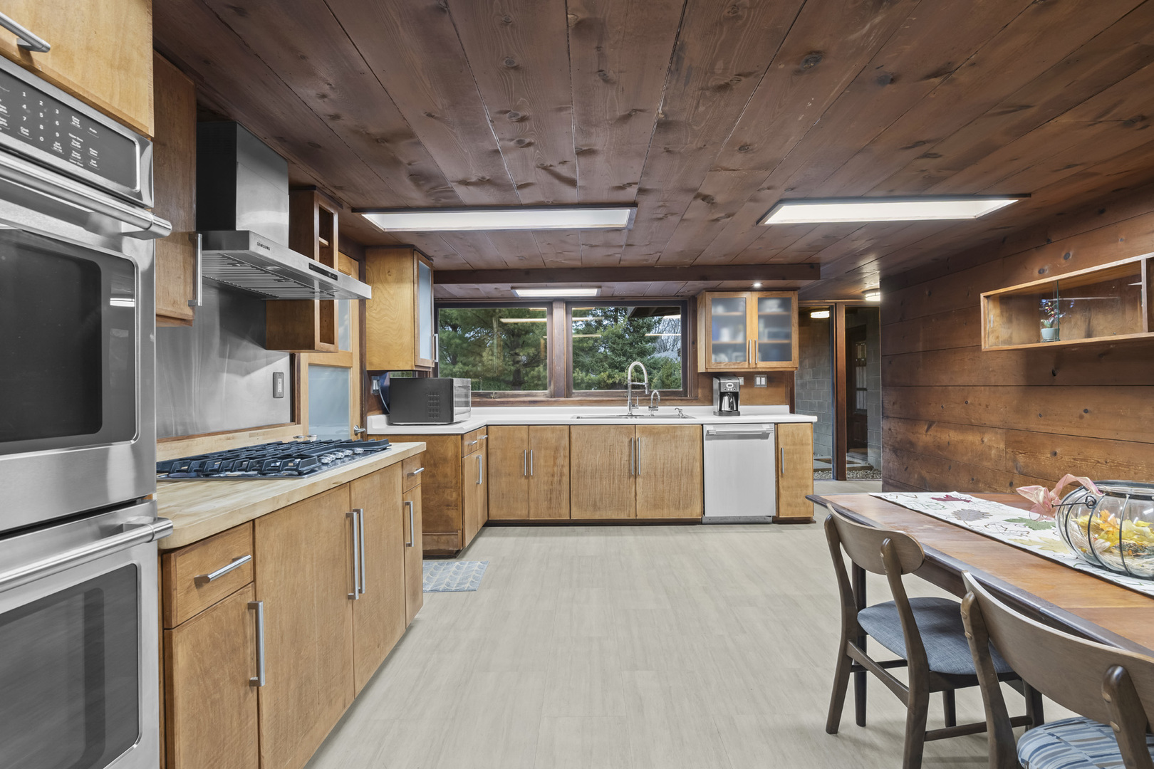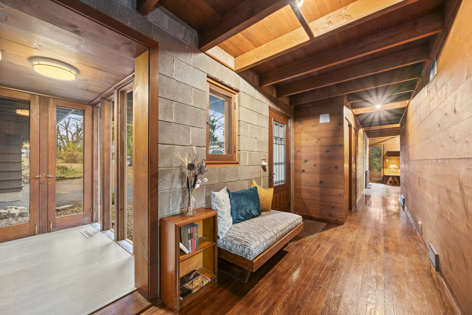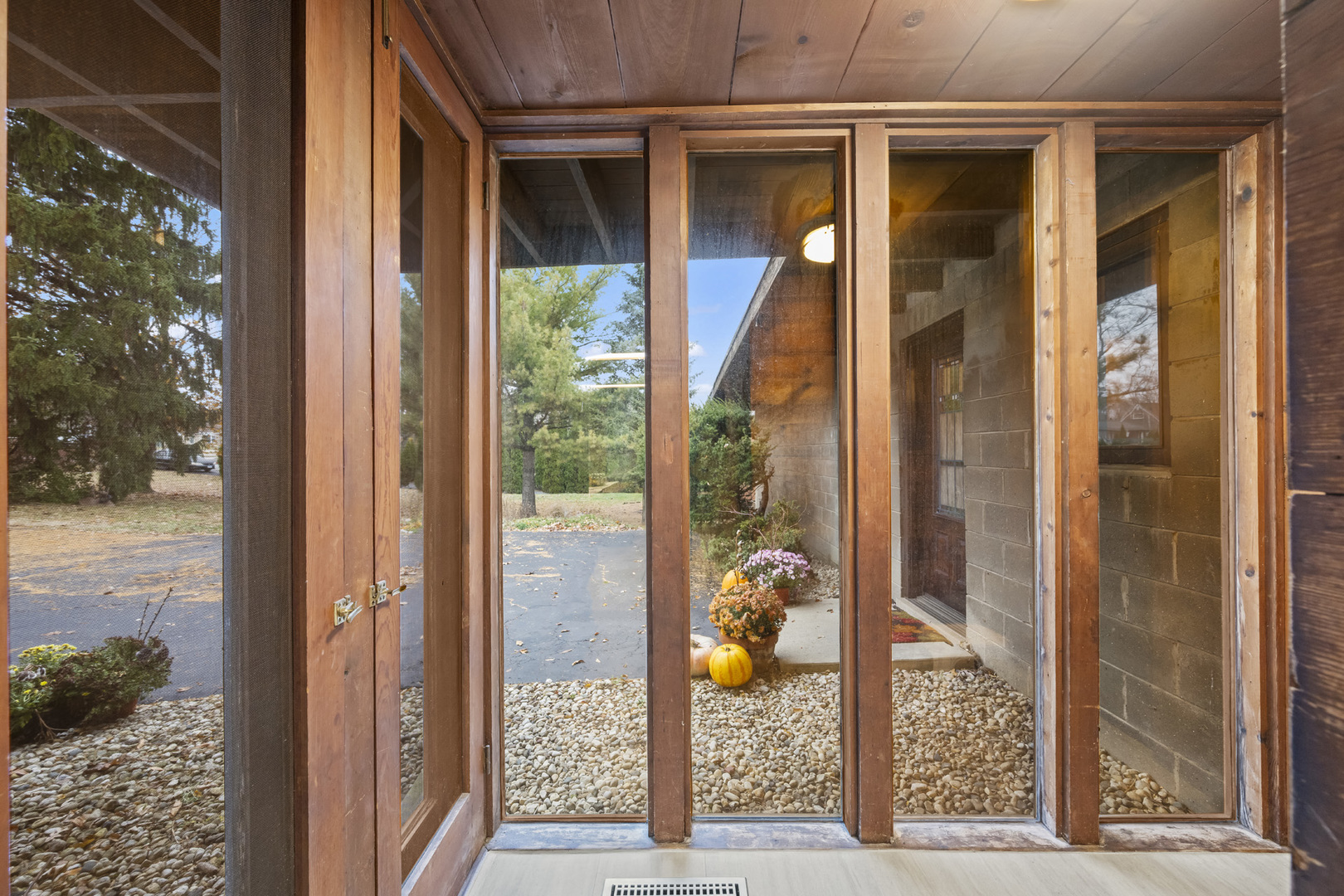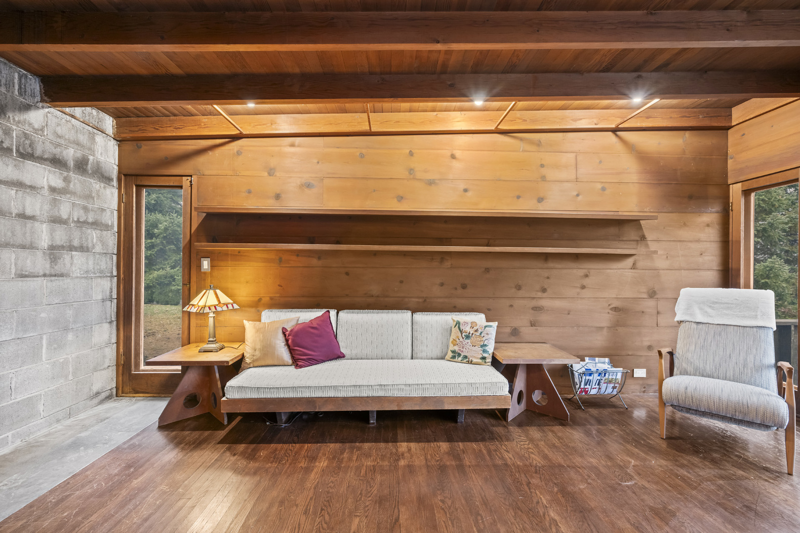 First time on the market! This fantastic 1953 Mid-Century Modern ranch designed by Edward Humrich has been in the same family since it was built! Sitting on a gorgeous lot of almost an acre, and backing to the Bonnie Brook Golf Course, this MCM beauty will delight with it’s classic Midwest mid-century features like walls of windows, wood paneled walls, plank & beam ceilings, modular block fireplace and more. Fantastic living room with fireplace and great modernist details will include the 2 sofas and 5 coordinating tables. The home was expanded in the past with the addition of a new two-car garage in the exact same style as the rest of the house, with the former carport enclosed and converted into a large kitchen & dining area that features all stainless appliances as well as heated floors and additional storage. In addition to the three bedrooms (all with hardwood floors) and two bathrooms you’ll find a laundry area, large storage closet, a small office and a screened-in porch on the south side of the house. Outside, you’ll love the huge lot and the fantastic 40,000 gallon heated pool – 9 feet at the deepest end, and complete with diving board. The lot slopes gently toward the Bonnie Brook Golf Course, and enjoys privacy from numerous mature trees. Partial basement has a 1/2 bath that’s also plumbed for a shower, and offers great storage space and access to the outside. Mid-Century Modern homes have increased significantly in value over the past 5 years, so this home represents a fantastic opportunity to get into a modern home designed by a notable architect for a great price and in a beautiful setting! New AC this year. Half bath in basement refreshed in 2025 as well. Two main level baths remodeled in 2021. Furnace replaced in 2017. Washer & Dryer replaced in 2018. Dishwasher replaced in 2020. Modbit roof redone in 2009 with chimney flashing upgraded in 2022. Garage door opener replaced 2025.