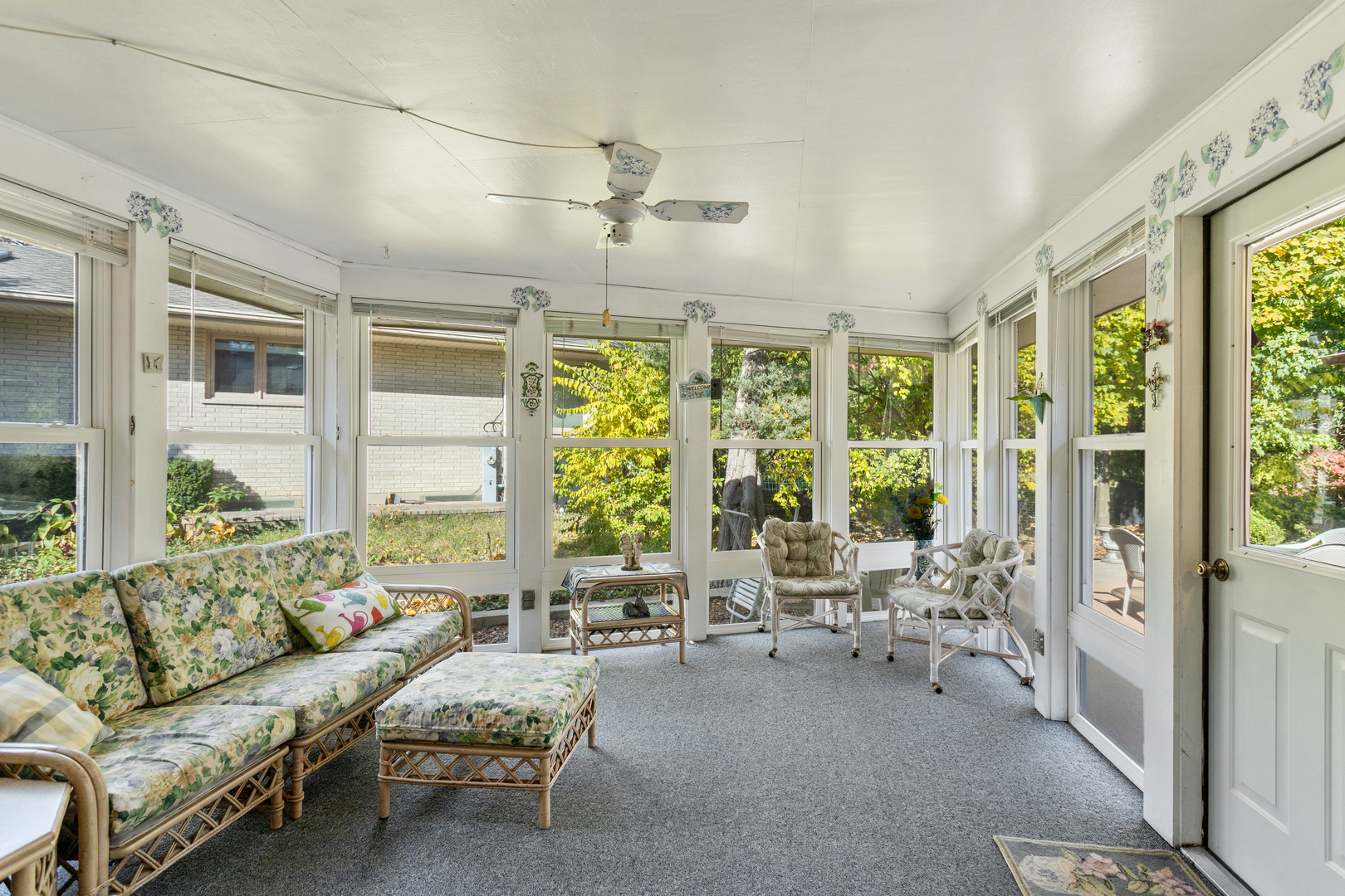 Welcome to this charming mid-century all brick Ranch home with curb appeal galore in beautiful and sought after Glen Ellyn Woods. Nestled on the corner of two leafy, tree-lined streets, this nearly half acre lot sits up high and features an impressive circular driveway. Step inside to the slate foyer, you’ll notice the traditional floor plan with a welcoming flow. Kitchen includes a cozy eat in table space looking out one of the many large windows; there’s great natural light in this home. Separate dining room opens to a truly inviting family room with w/b fireplace and gorgeous hardwood flooring. Adjacent is the large living room and a bright 3-season sunroom w/patio access. Large master bedroom includes a full ensuite with plenty of closet space. Hardwood floors sit under the carpet in the remaining 2 bedrooms and long hallway. Convenient new washer/dryer combo unit added in the hallway to complement the laundry in the basement. The expansive recreation room is enhanced with a vintage masonry bar and big layout with room for a gym, pool table, or 2nd family room space. Adjacent laundry area and work space. Clean 2-car garage has epoxy flooring. Several great “news” include roof and roof chimney (2024), furnace (2024), washer/dryer and resurfaced patio (all 2025). Home is dated and needs cosmetic updating, but has fantastic potential in one of the best locations in Glen Ellyn Woods. This is an estate sale and is being offered “as is”.